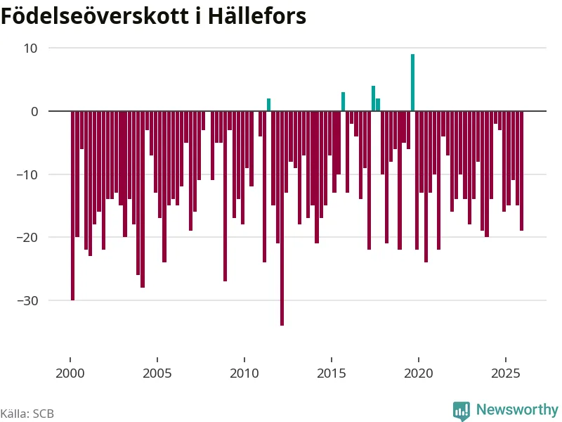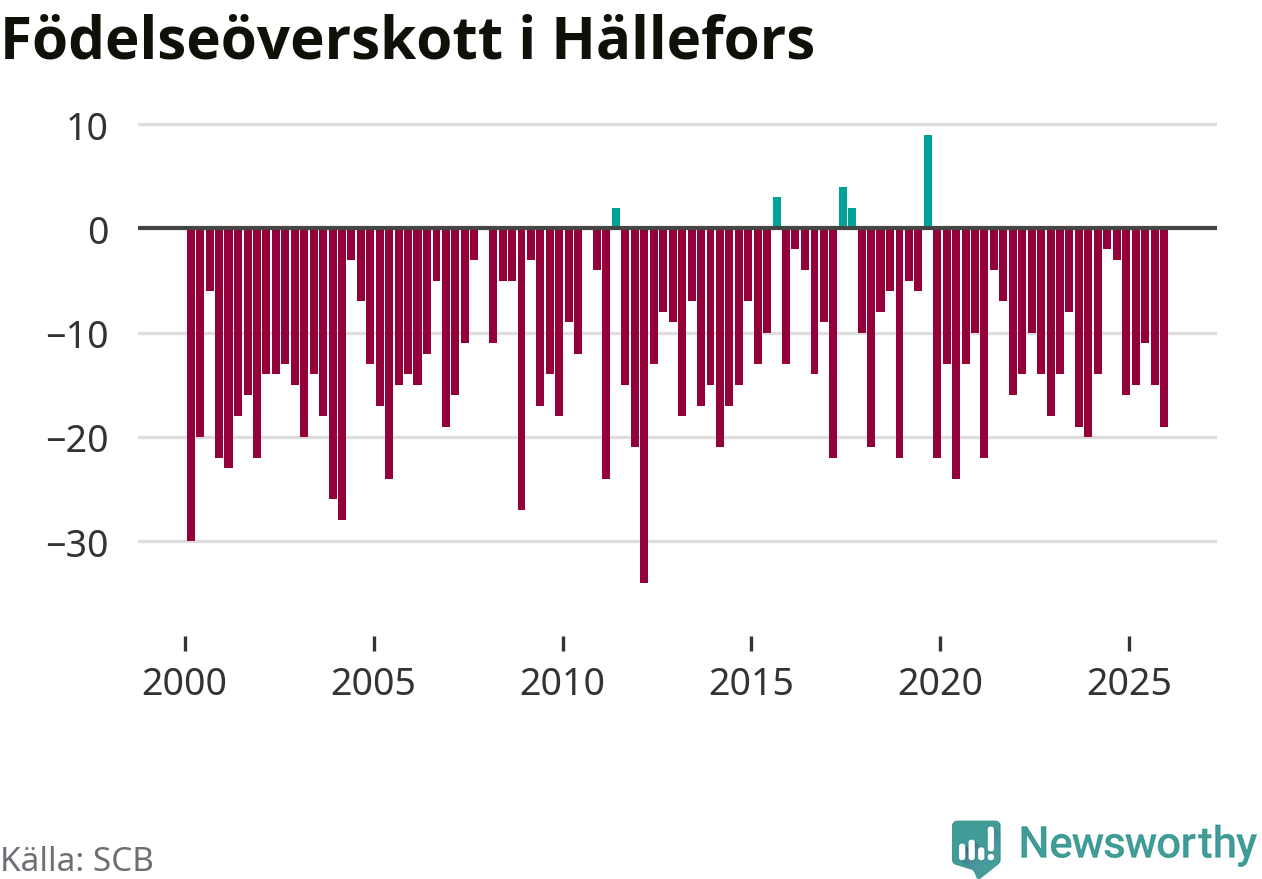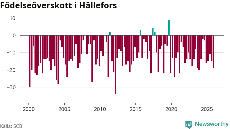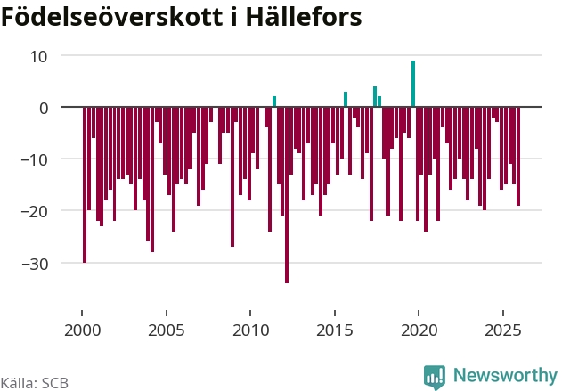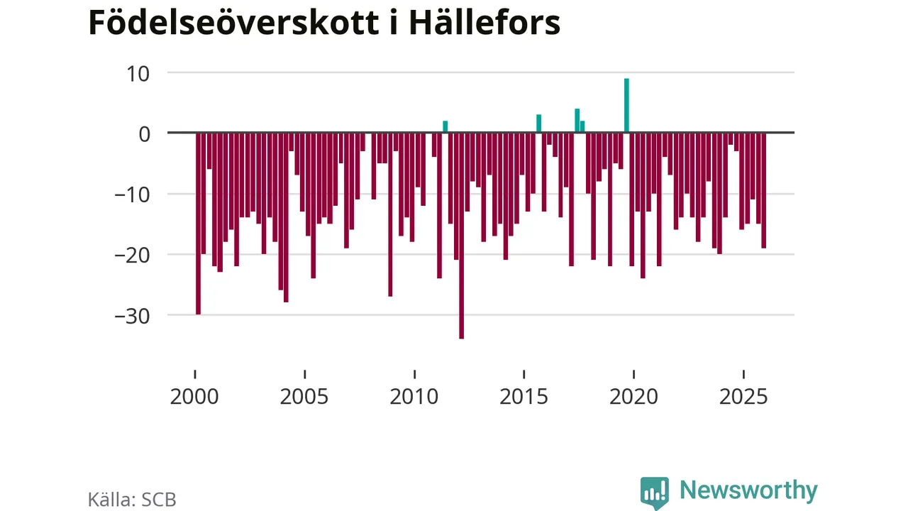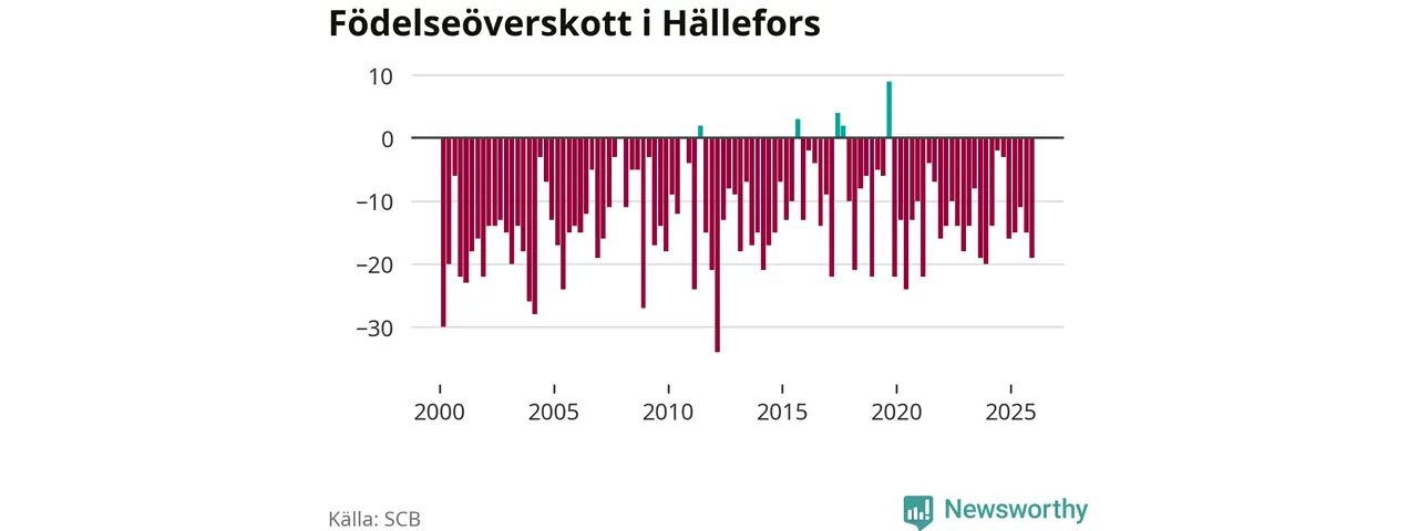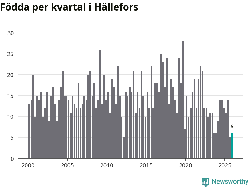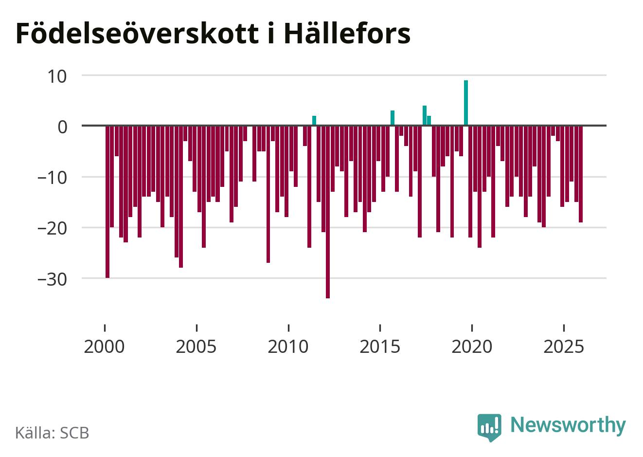 Enligt SCB:s siffror föddes sex barn i Hällefors under det senaste kvartalet. Samtidigt avled 25 personer. Hällefors hade alltså ett negativt födelsenetto, vilket kommunen historiskt sett nästan alltid har haft.
