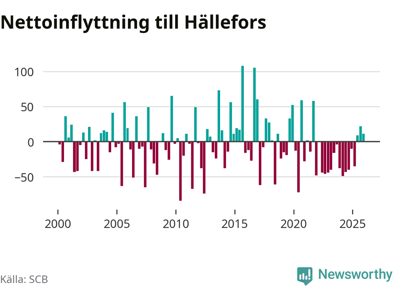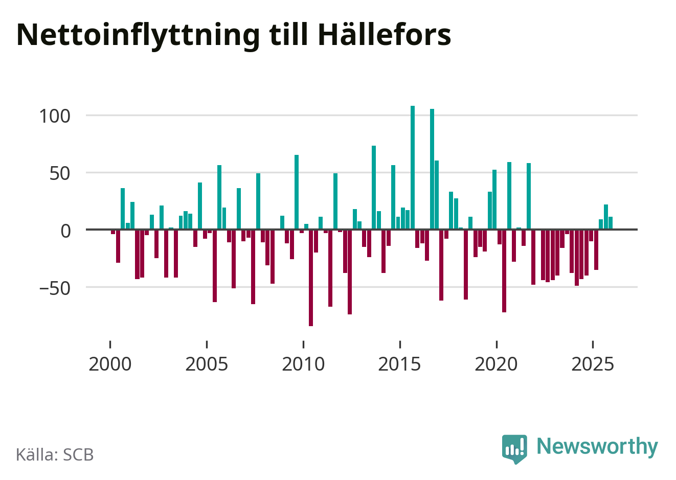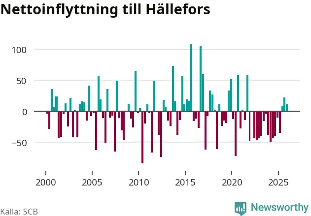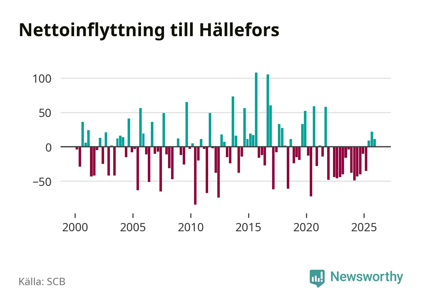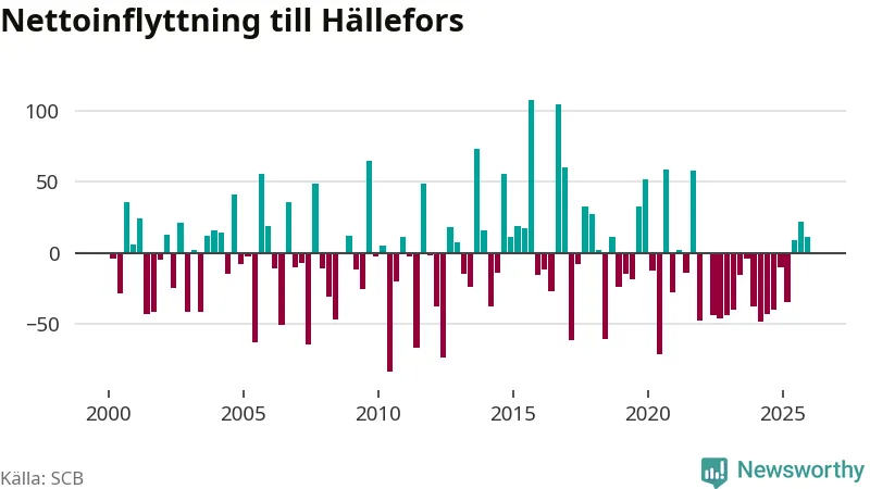 Under fjärde kvartalet 2025 flyttade 81 personer till kommunen medan 70 personer flyttade därifrån. Sedan seklets början har Hällefors oftast haft ett negativt flyttnetto, inklusive det senaste kvartalet.