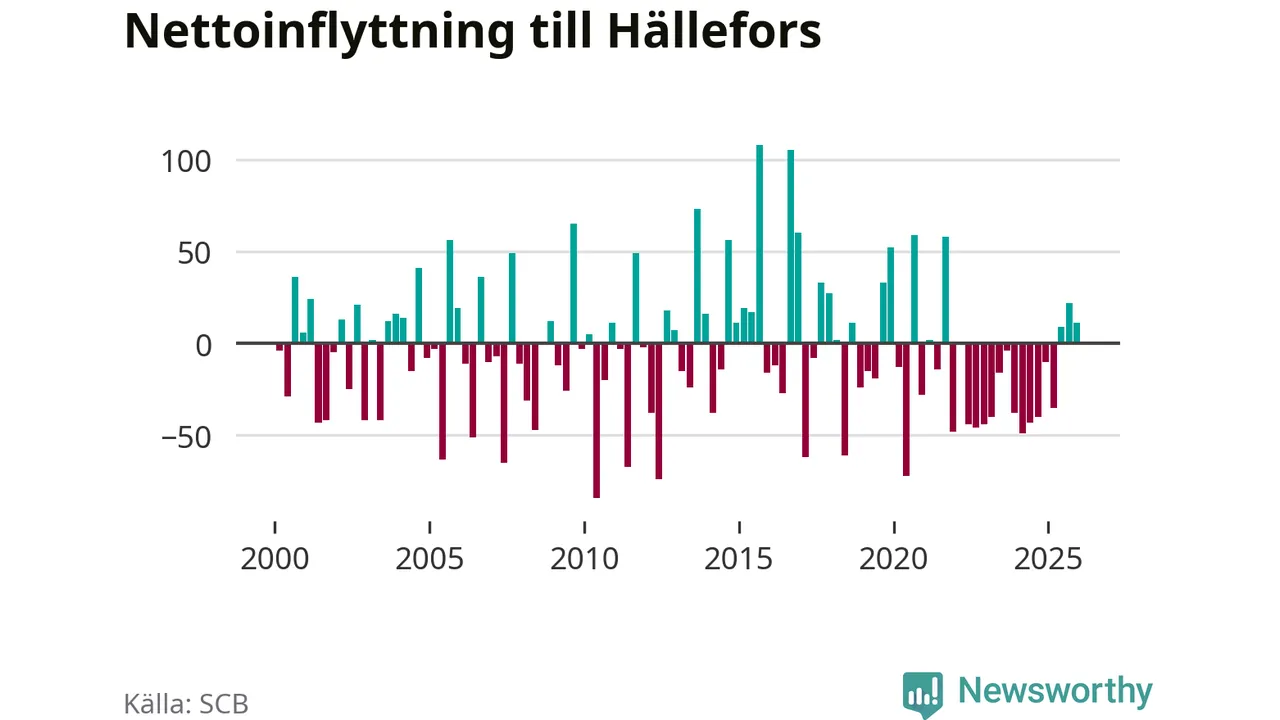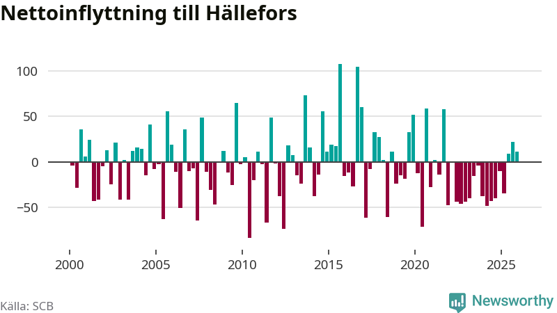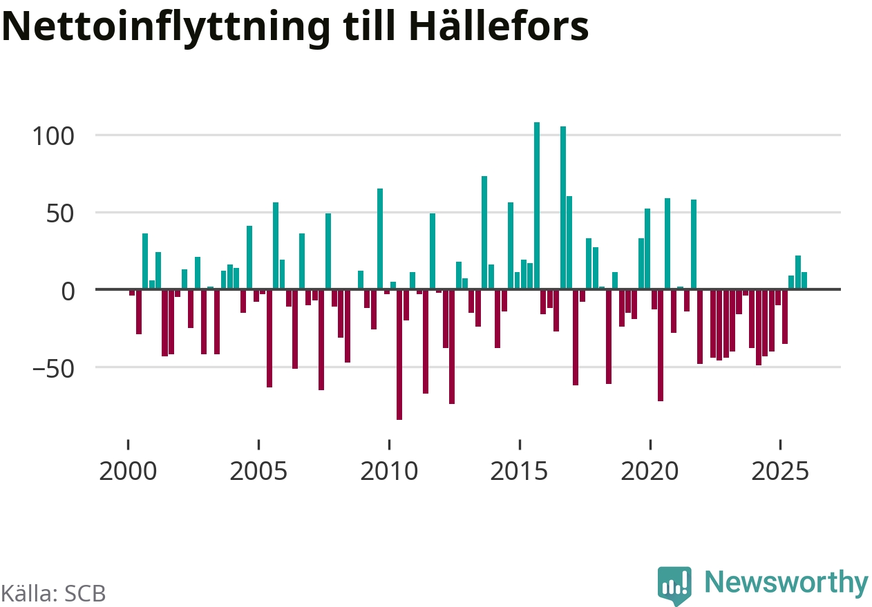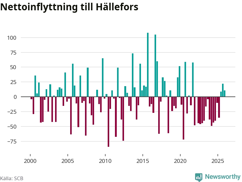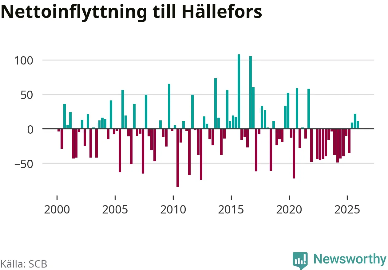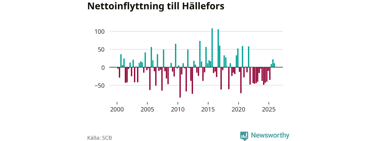 Under fjärde kvartalet 2025 flyttade 81 personer till kommunen medan 70 personer flyttade därifrån. Sedan seklets början har Hällefors oftast haft ett negativt flyttnetto, inklusive det senaste kvartalet.