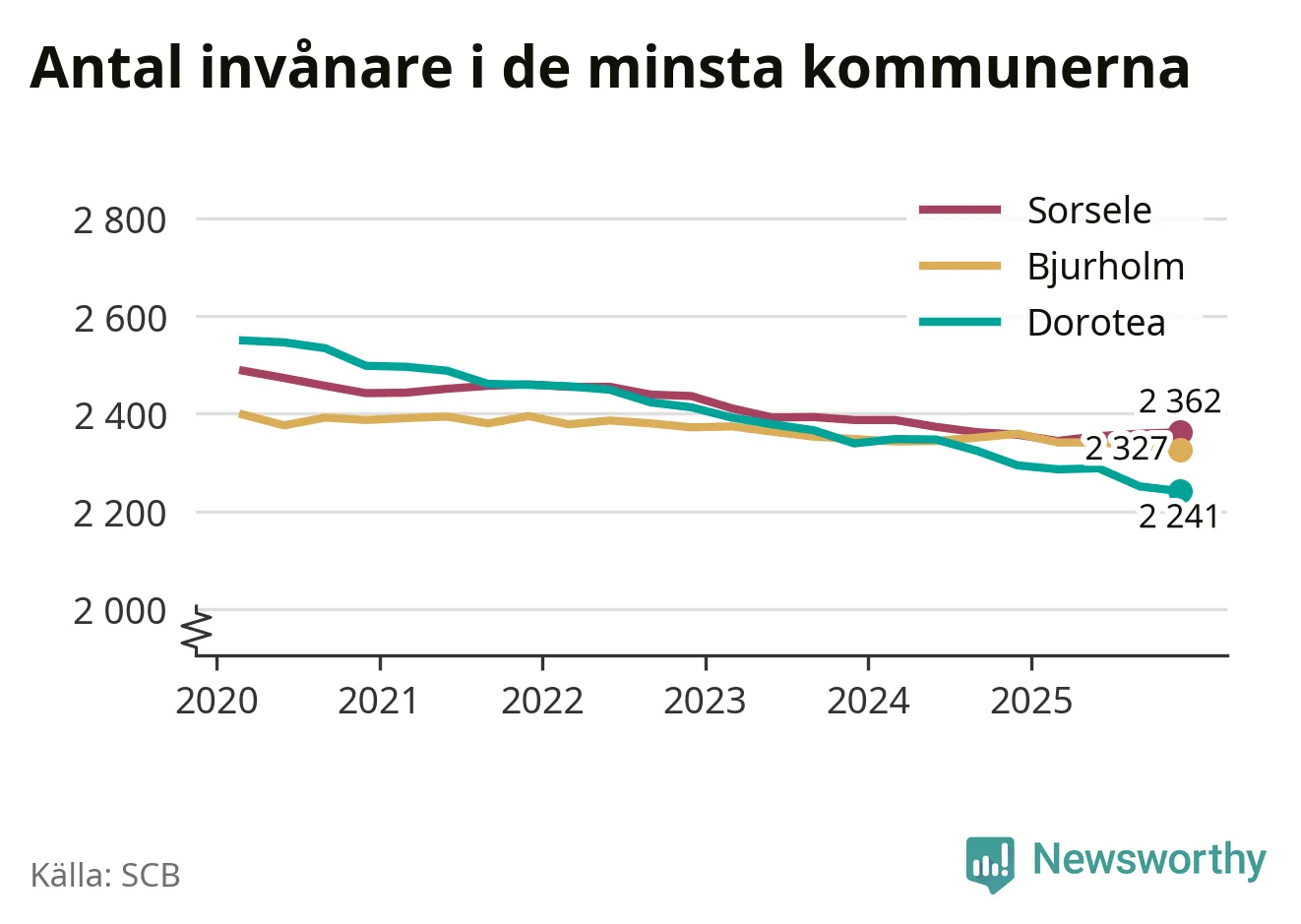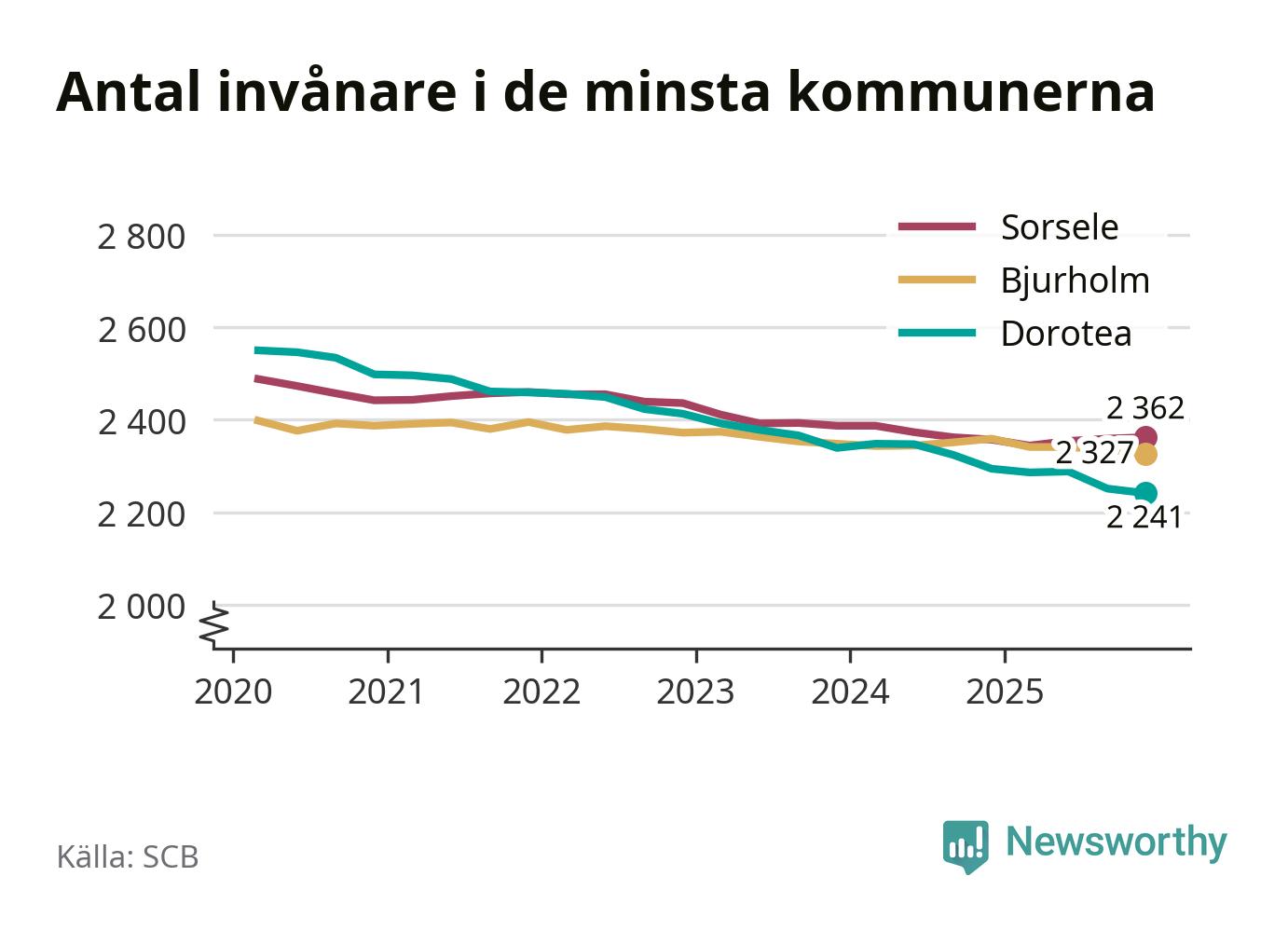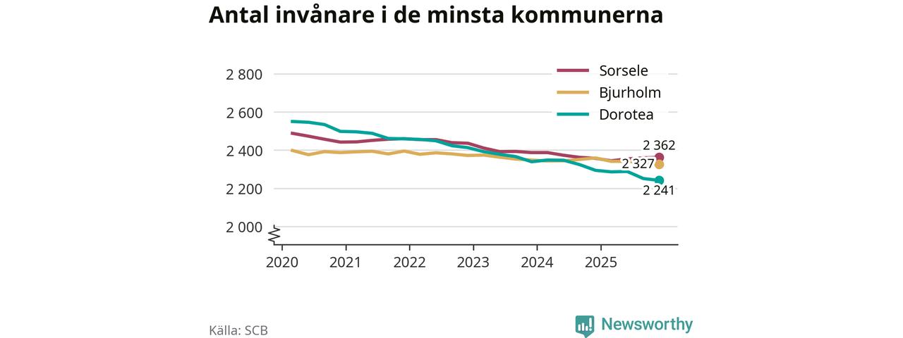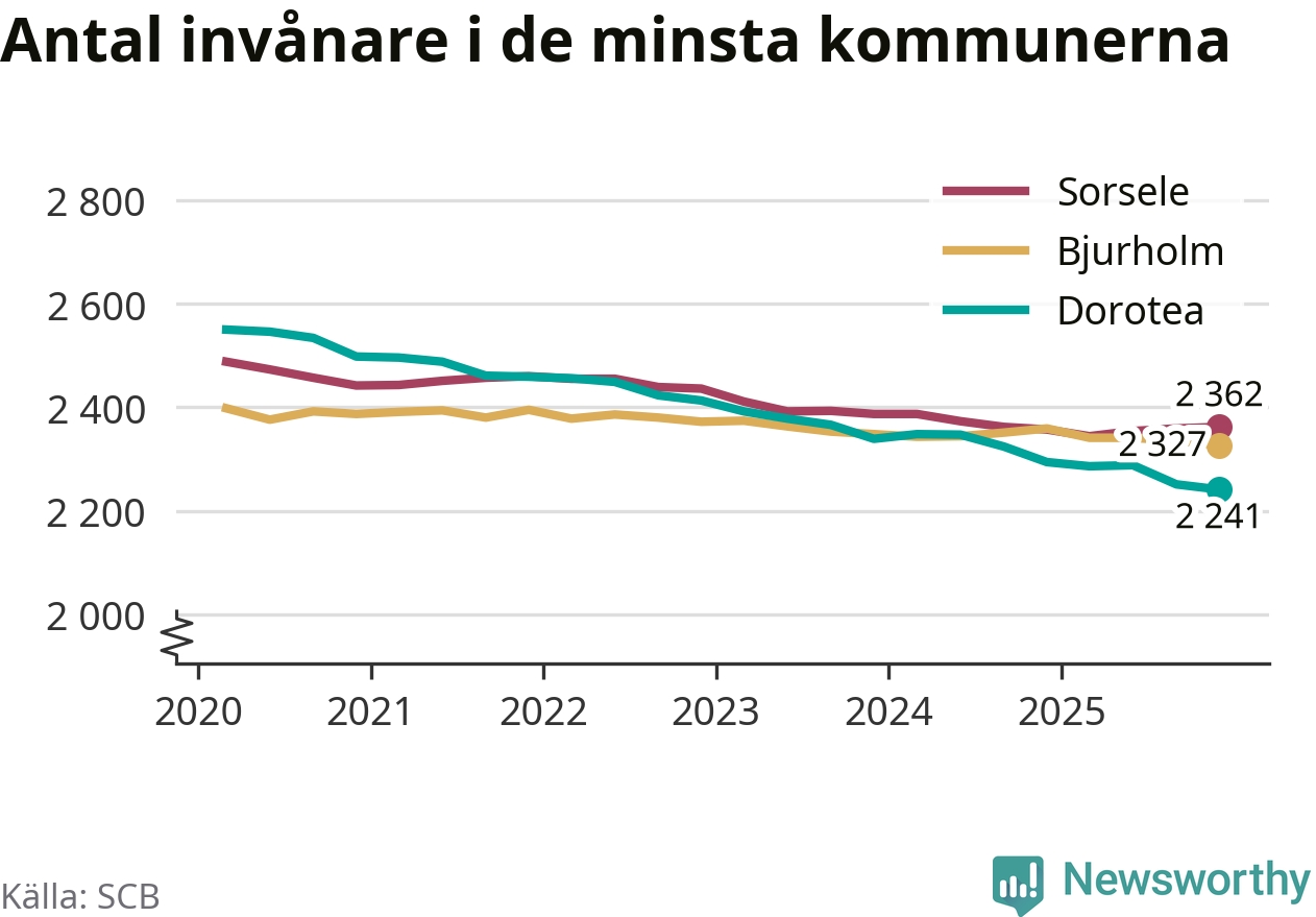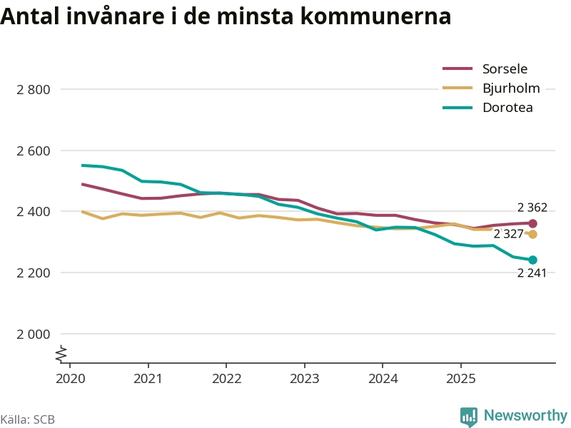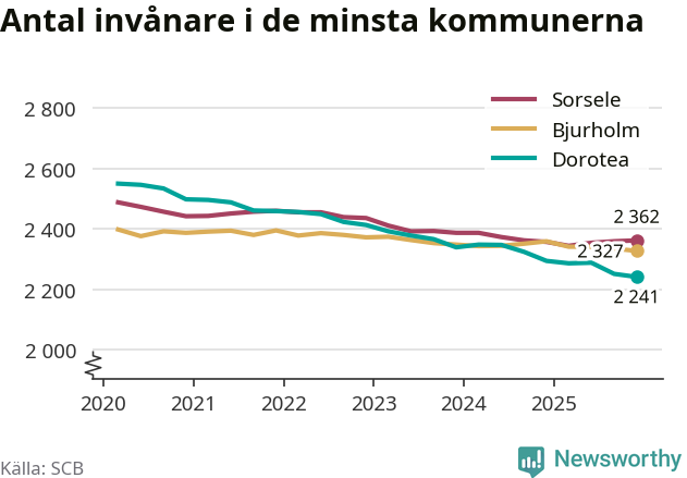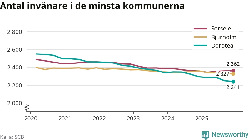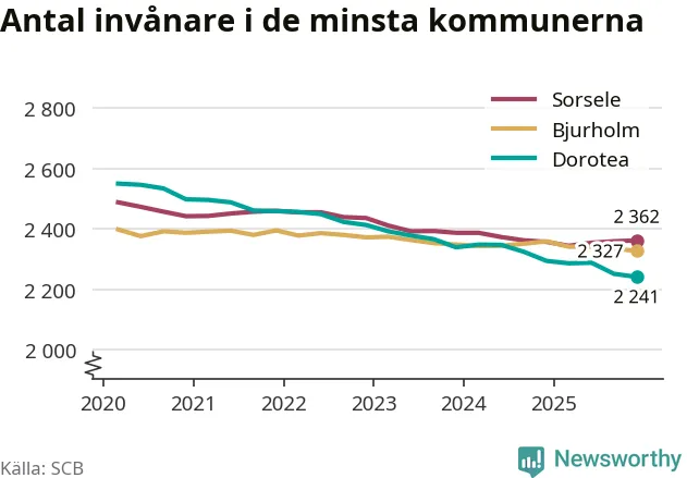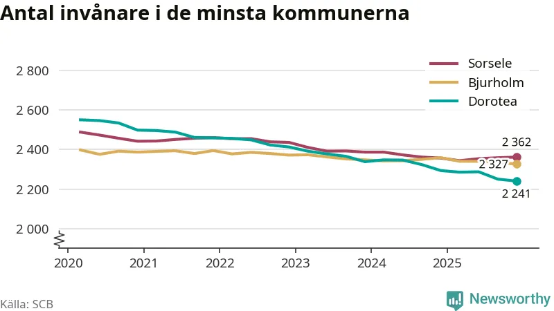 Dorotea är landets minsta kommun med 2 241 invånare, vilket den har varit sedan tredje kvartalet 2024, då Bjurholm passerades. Bjurholm har nu 2 327 invånare. Sorsele, på tredje plats, har 2 362 invånare.