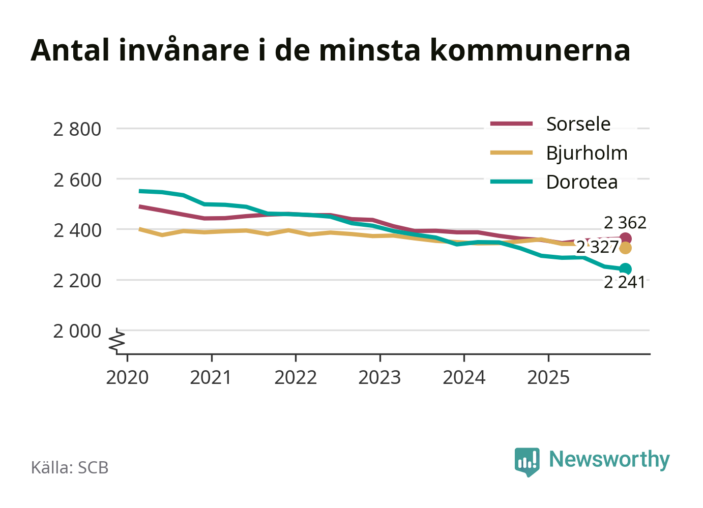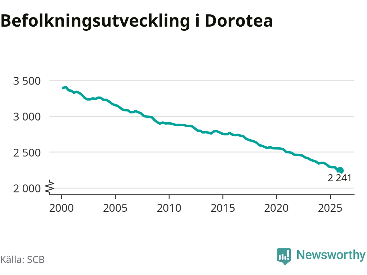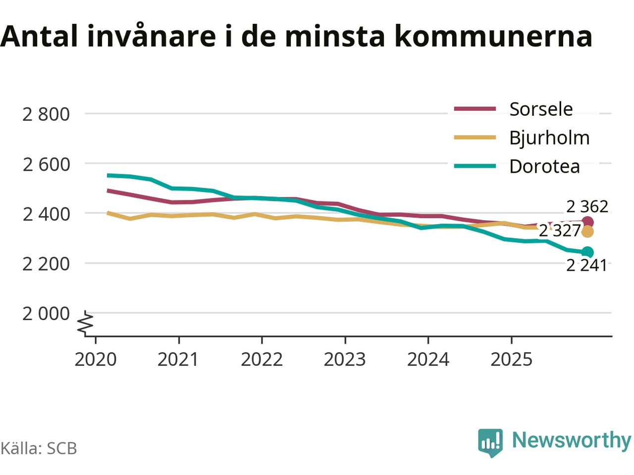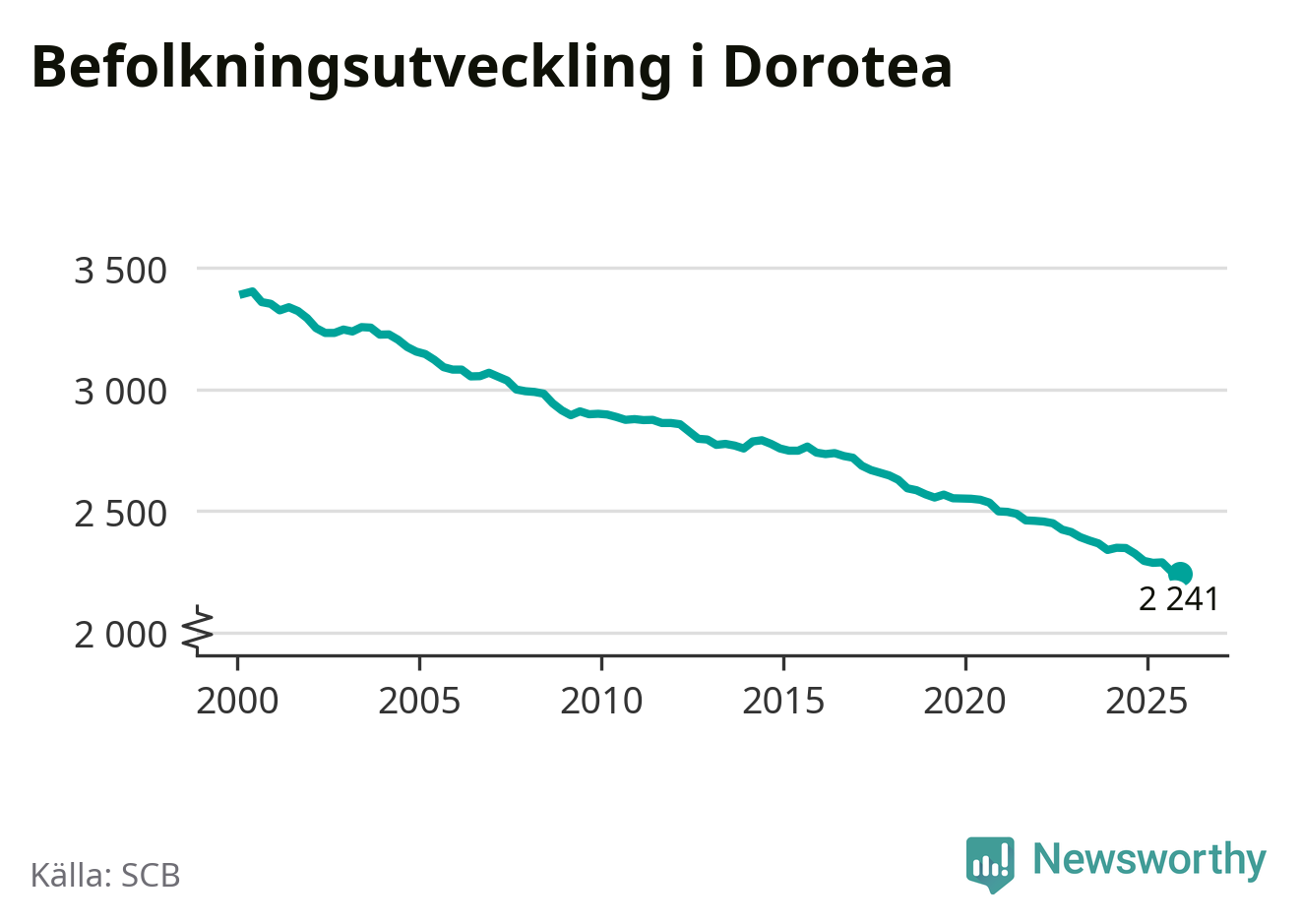Befolkningen minskade i Dorotea kommun under det fjärde kvartalet 2025. Den 31 december bodde enligt SCB:s senaste siffror 2 241 personer i kommunen, vilket är tio färre än i slutet av tredje kvartalet.
