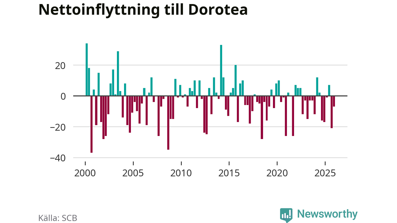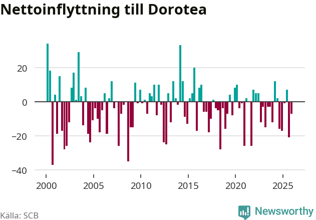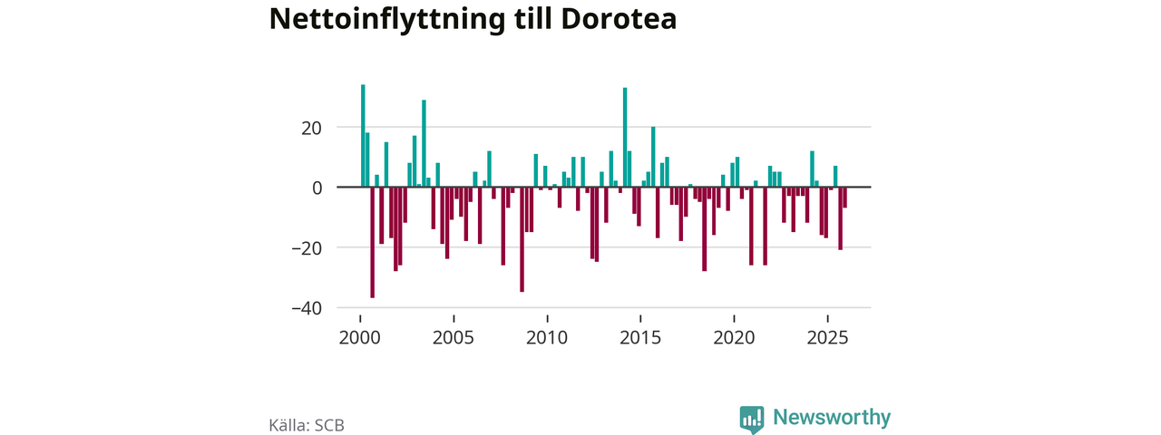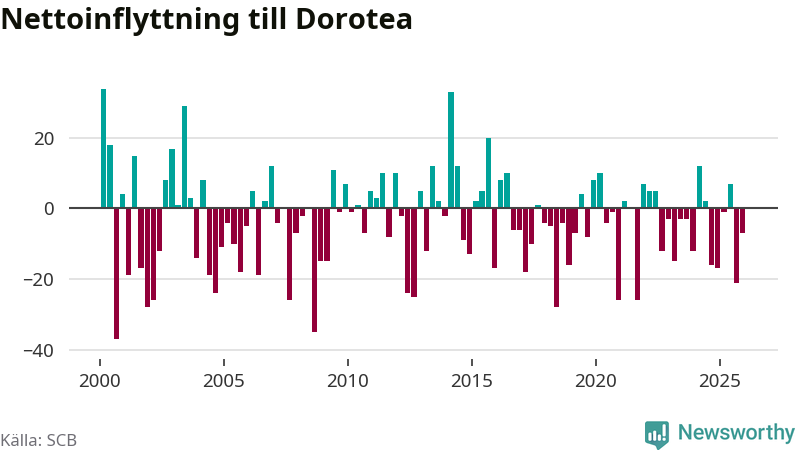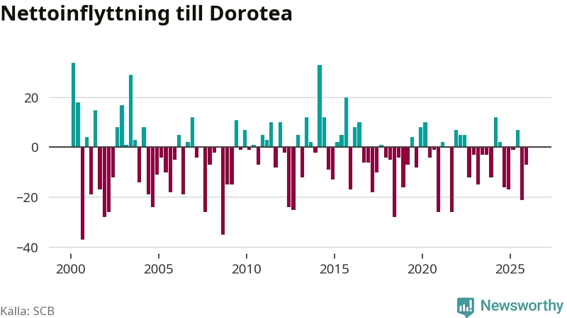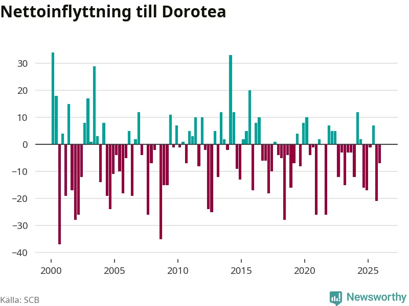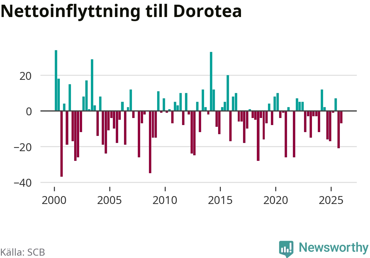 Under fjärde kvartalet 2025 flyttade 22 personer till kommunen medan 29 personer flyttade därifrån. Sedan seklets början har Dorotea oftast haft ett negativt flyttnetto.