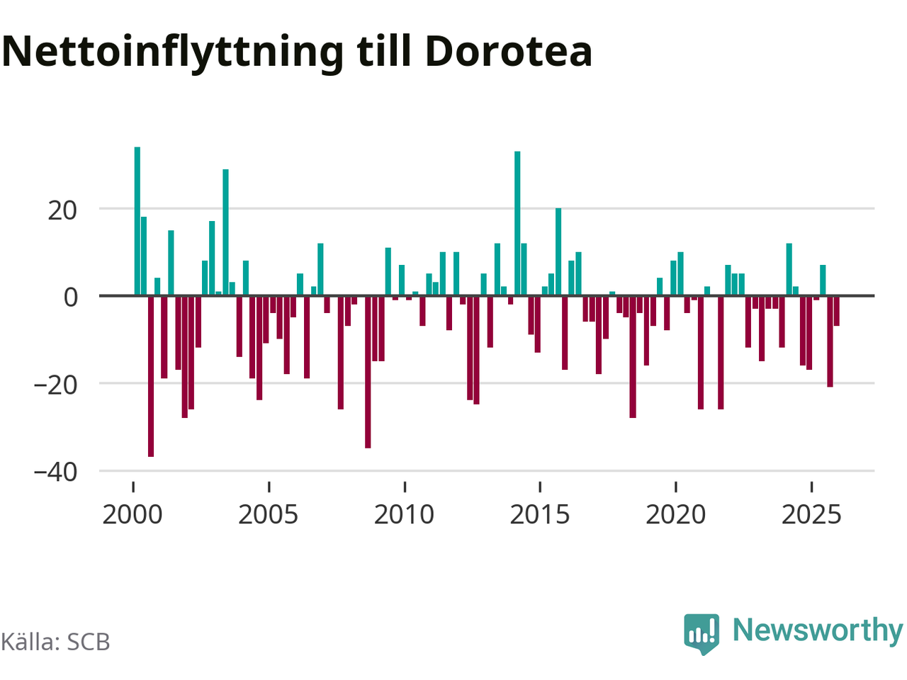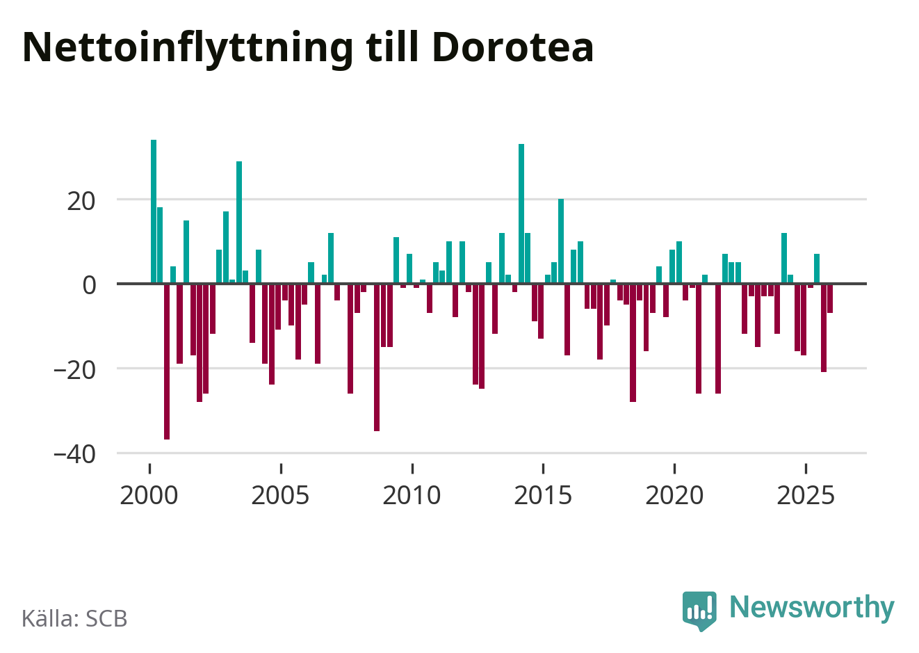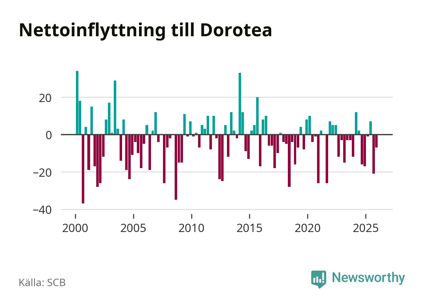 Under fjärde kvartalet 2025 flyttade 22 personer till kommunen medan 29 personer flyttade därifrån. Sedan seklets början har Dorotea oftast haft ett negativt flyttnetto.