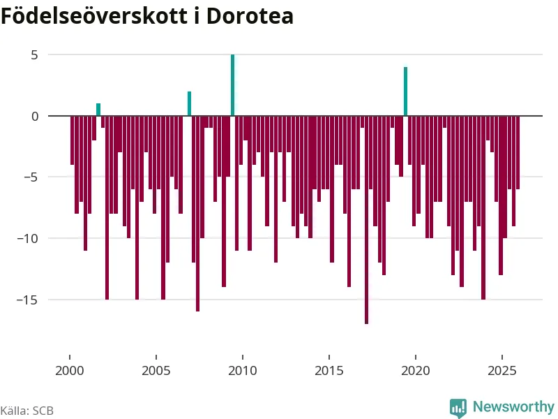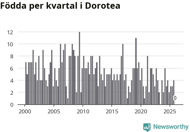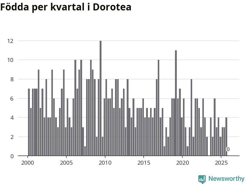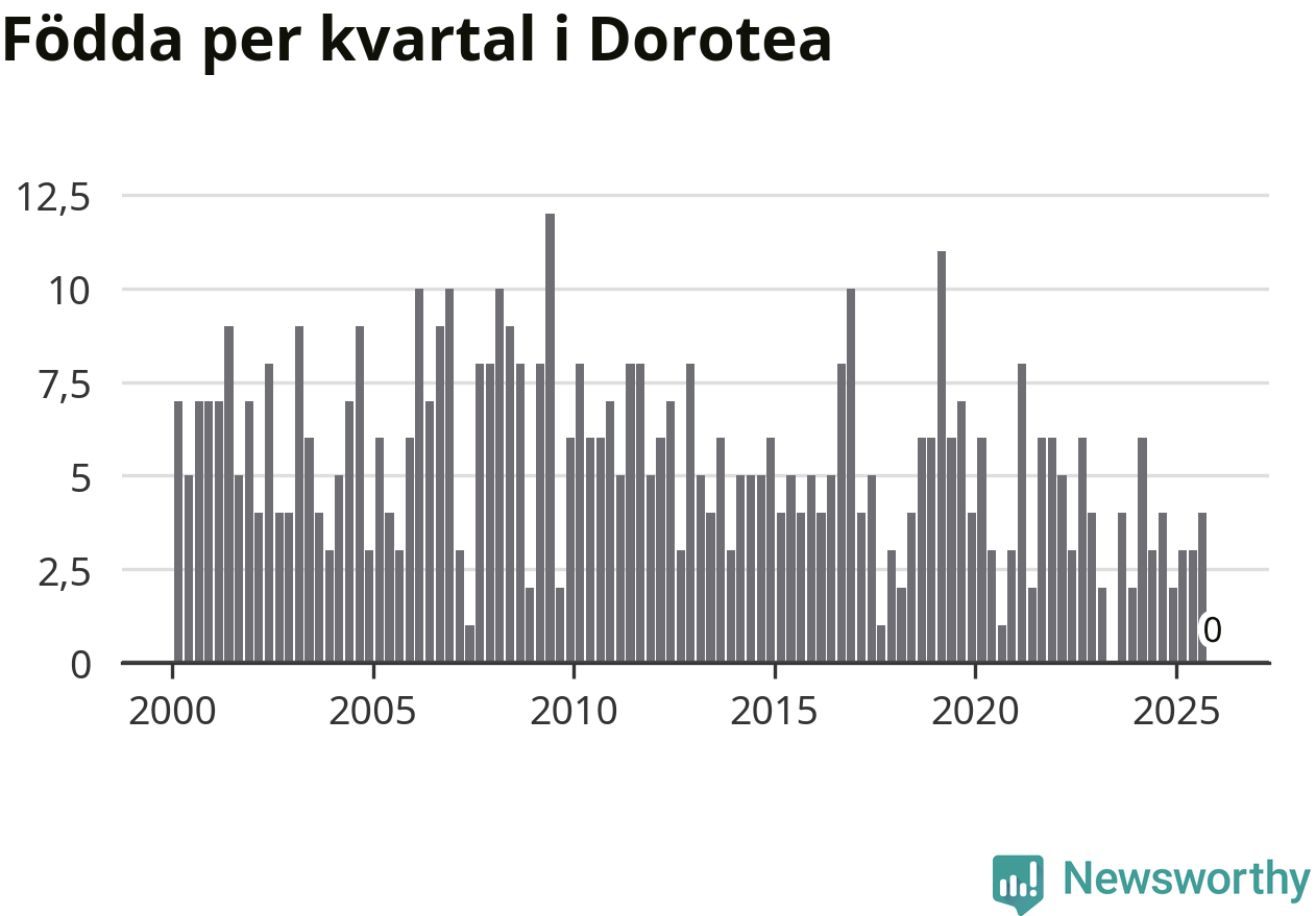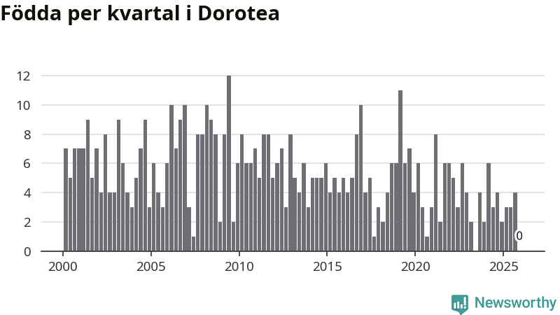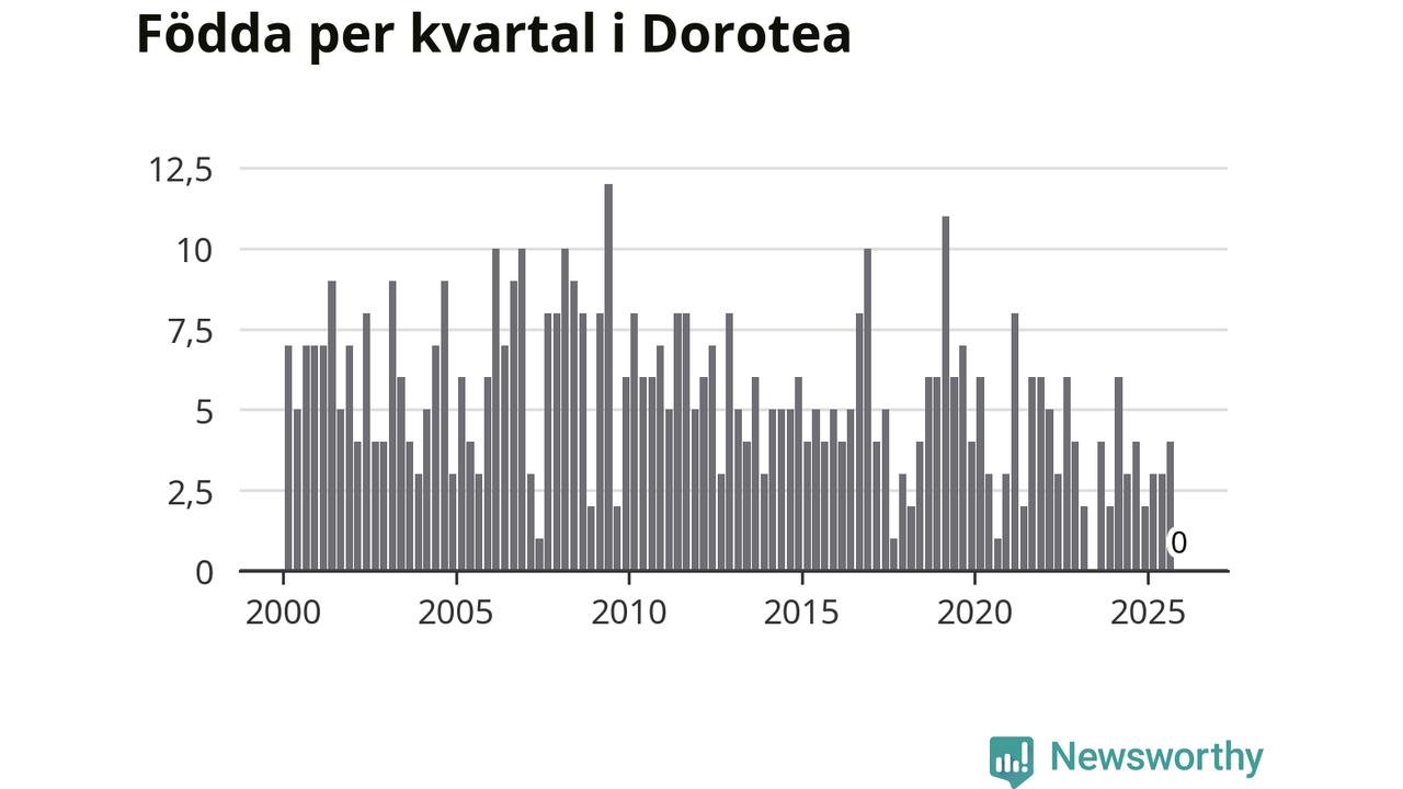 Enligt SCB:s siffror finns inga födda registrerade i Dorotea under det senaste kvartalet. Det kan dock finnas födda, som rundats nedåt av det brus SCB slumpmässigt lägger på alla befolkningssiffror. Klart är i alla fall att det rör sig om historiskt låga nivåer. Samtidigt avled sex personer. Skillnaden mellan antal födda och döda är så liten att det inte går att säga om det beror på något annat än SCB:s röjandeskydd. Kommunen har nästan alltid haft negativt födelsenetto tidigare.