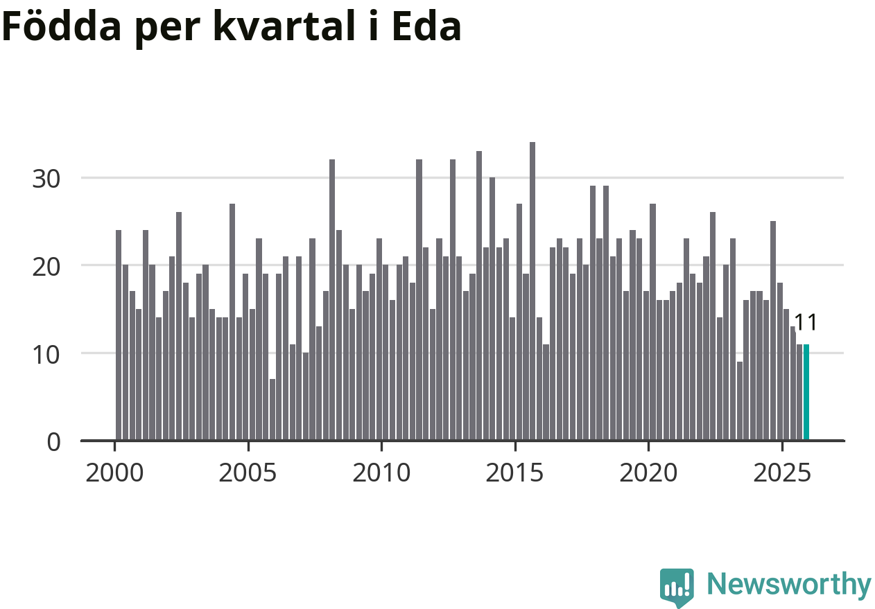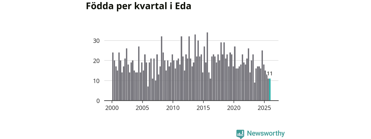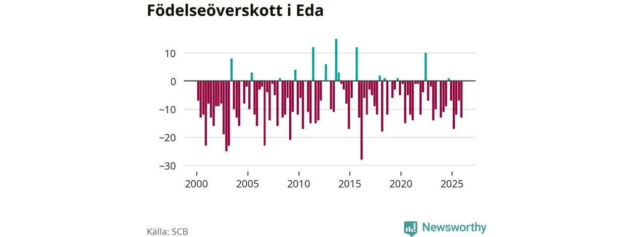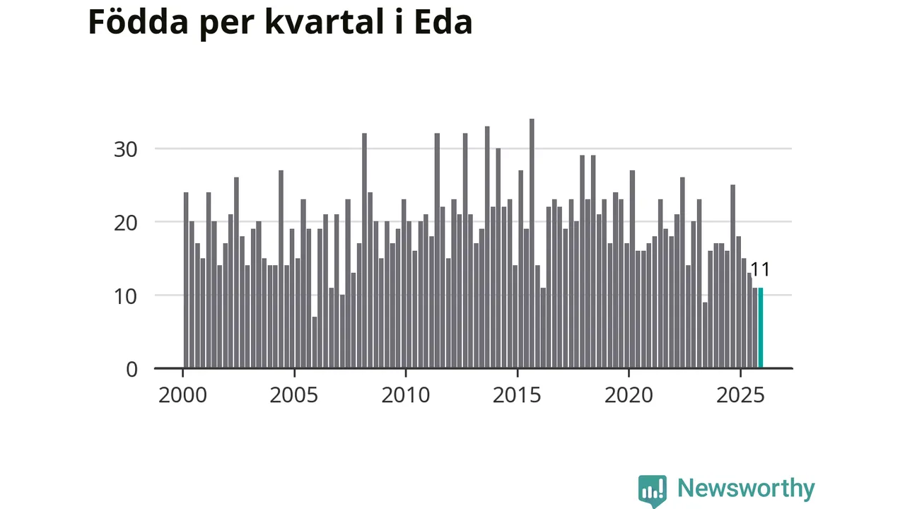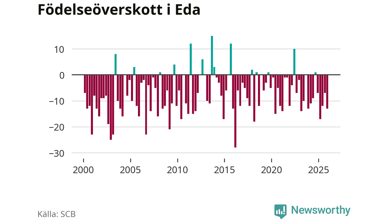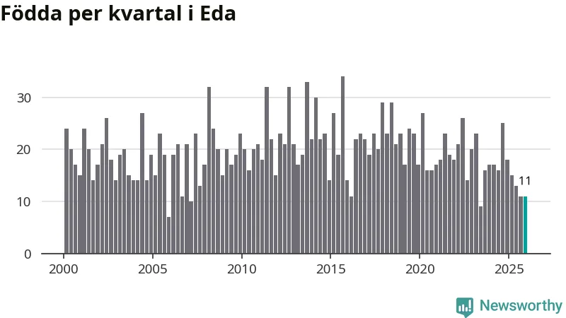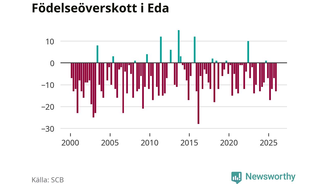 Enligt SCB:s siffror föddes elva barn i Eda under det senaste kvartalet. Samtidigt avled 24 personer. Eda hade alltså ett negativt födelsenetto, vilket kommunen historiskt sett nästan alltid har haft.