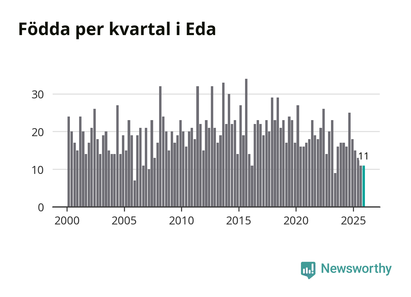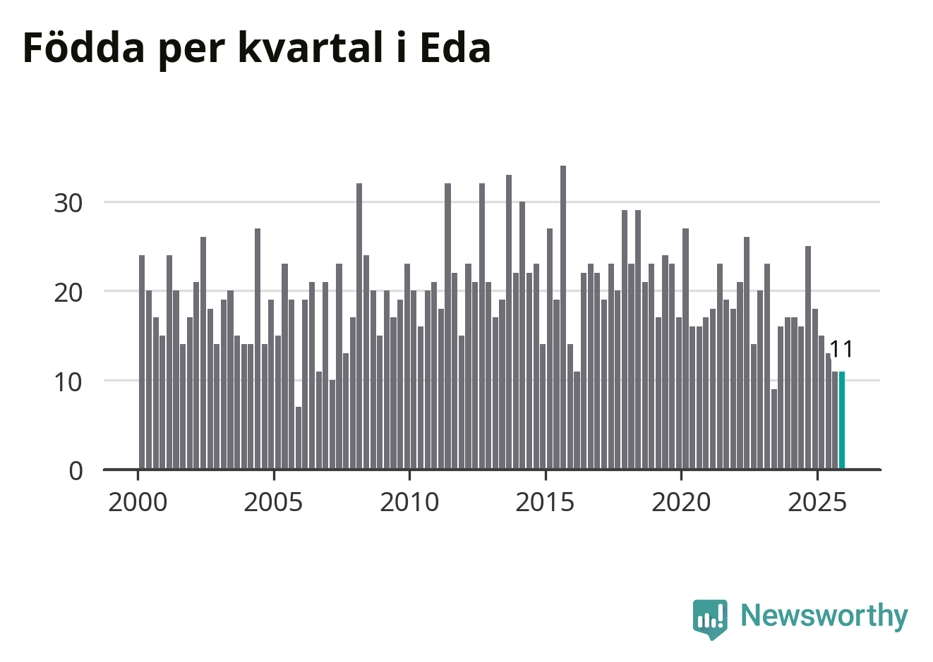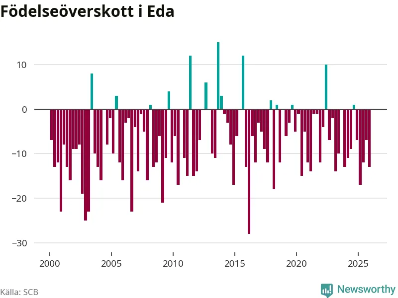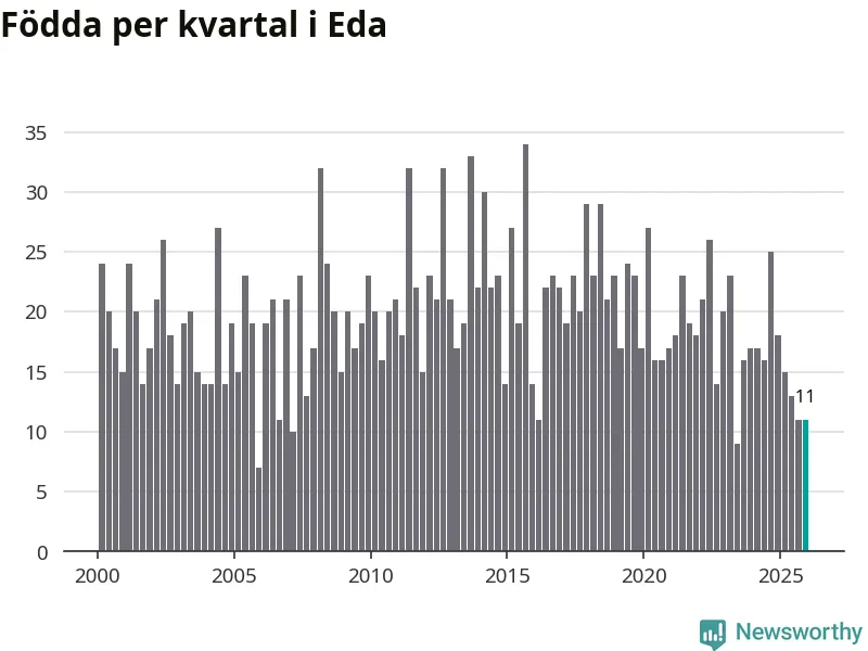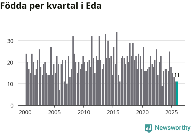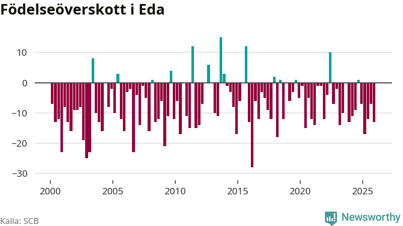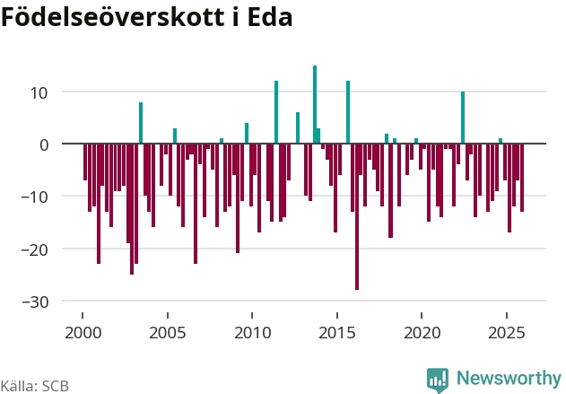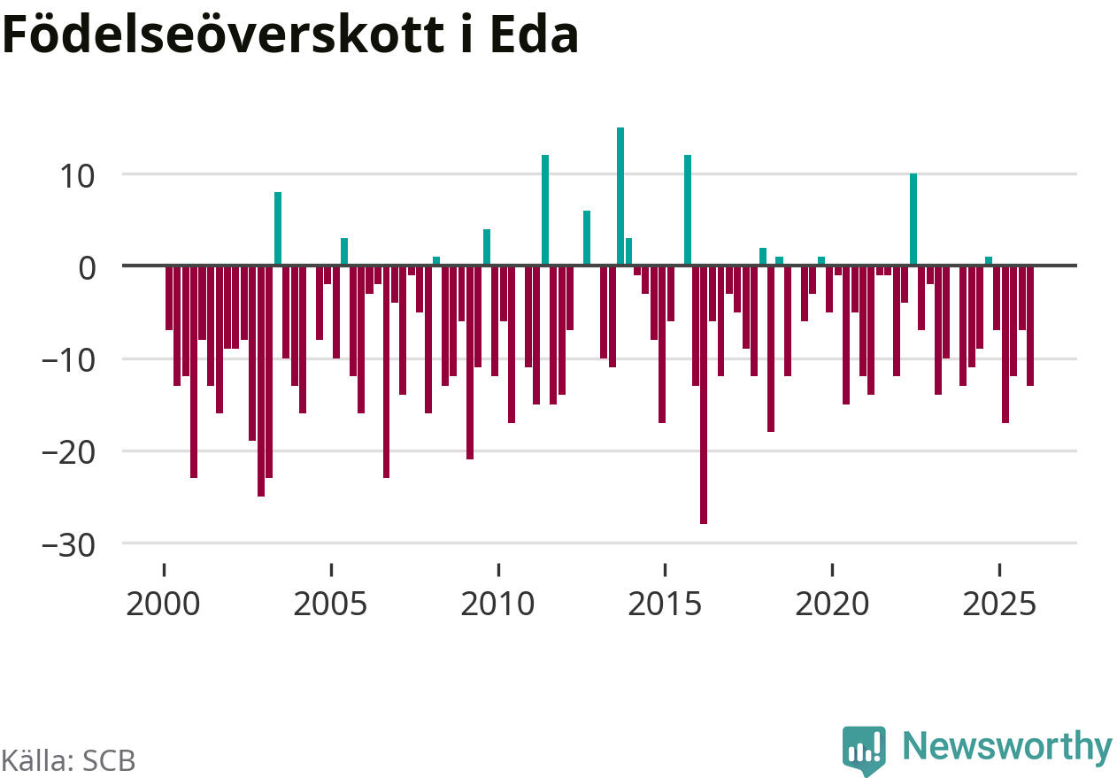 Enligt SCB:s siffror föddes elva barn i Eda under det senaste kvartalet. Samtidigt avled 24 personer. Eda hade alltså ett negativt födelsenetto, vilket kommunen historiskt sett nästan alltid har haft.
