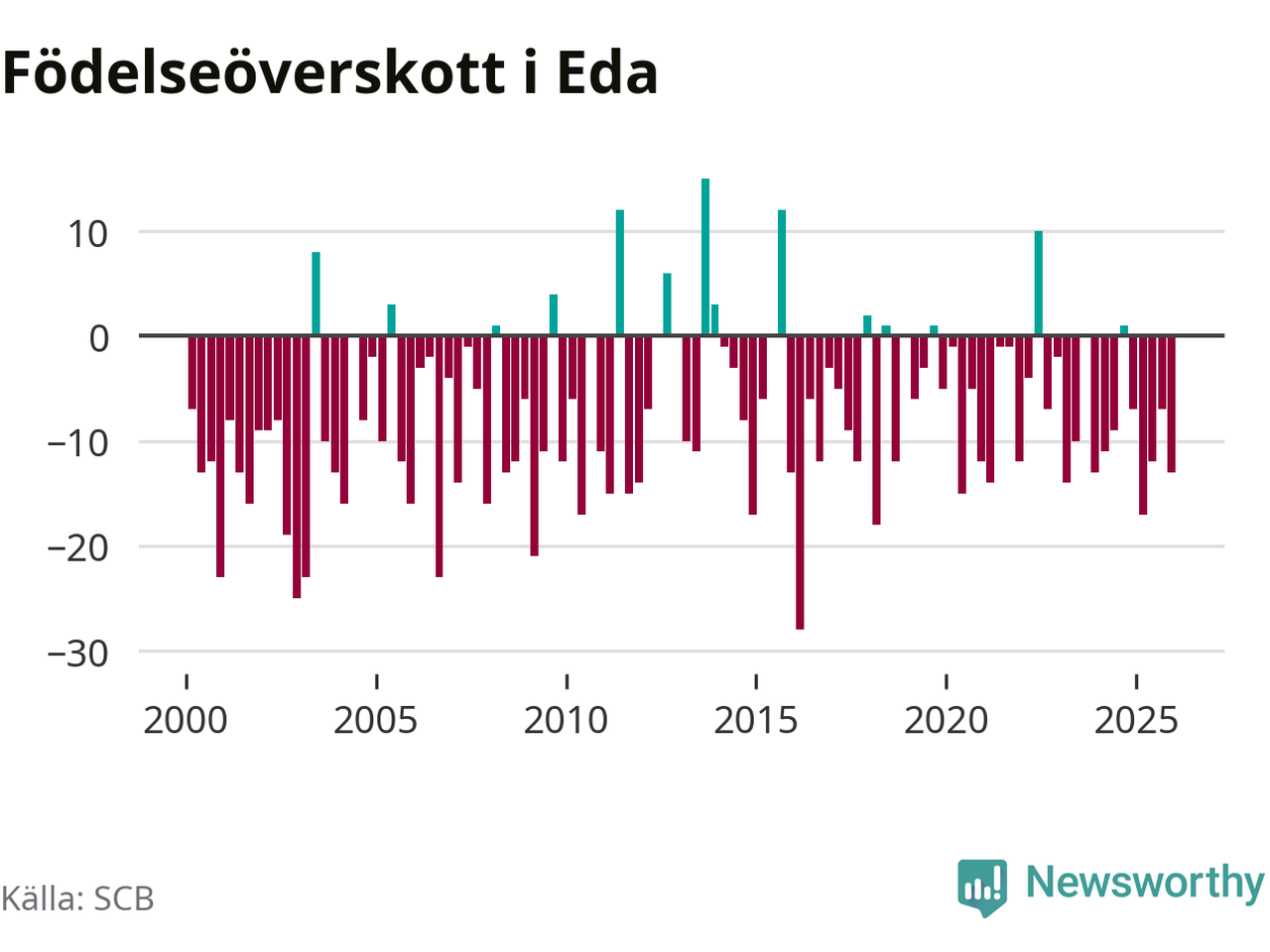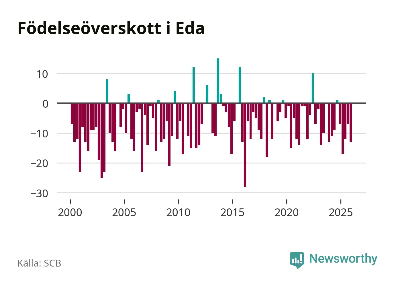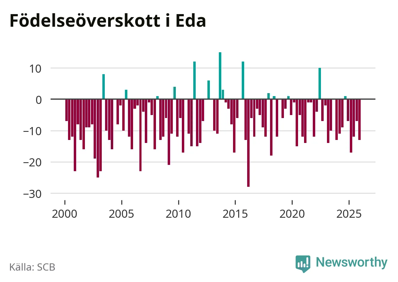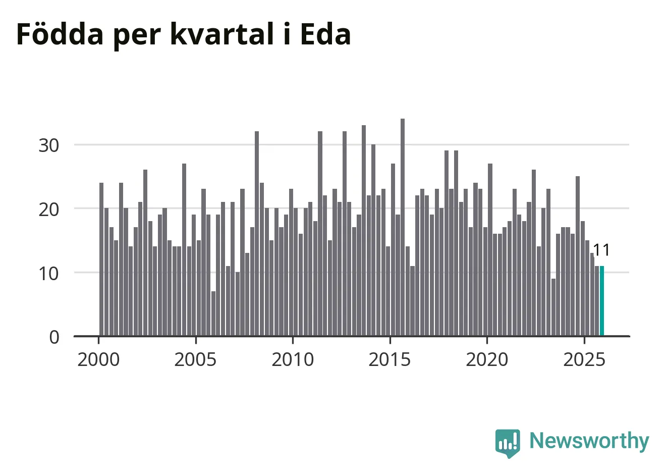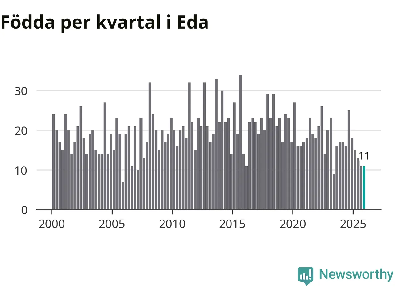 Enligt SCB:s siffror föddes elva barn i Eda under det senaste kvartalet. Samtidigt avled 24 personer. Eda hade alltså ett negativt födelsenetto, vilket kommunen historiskt sett nästan alltid har haft.
