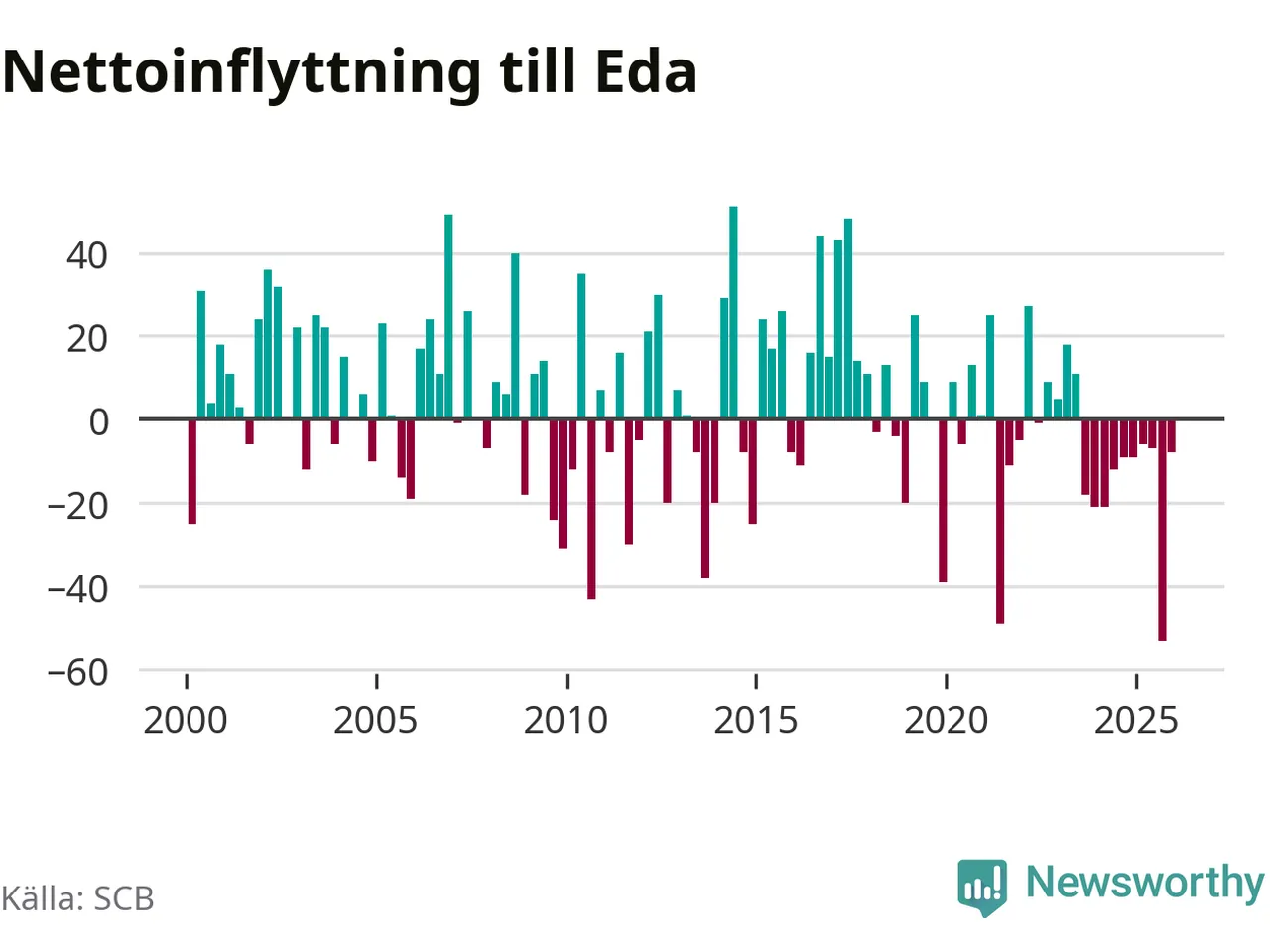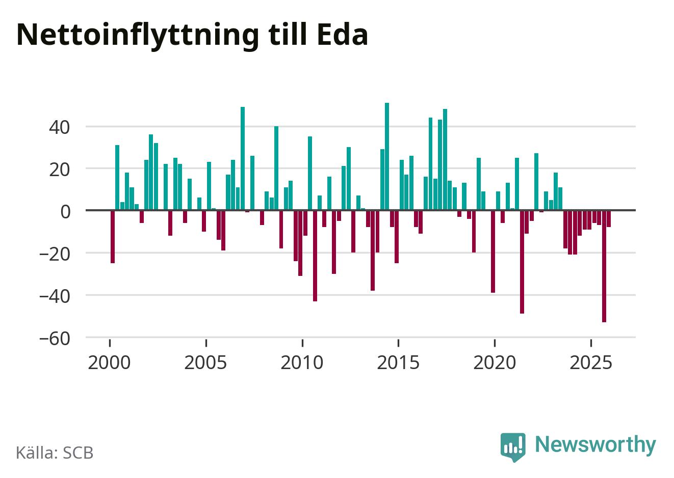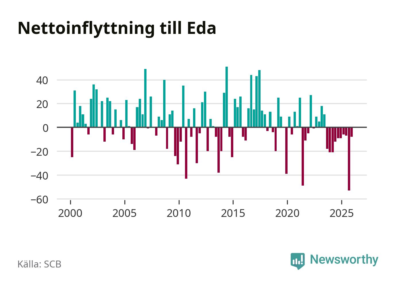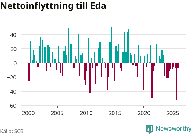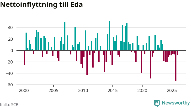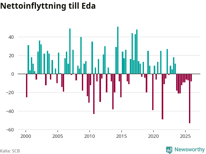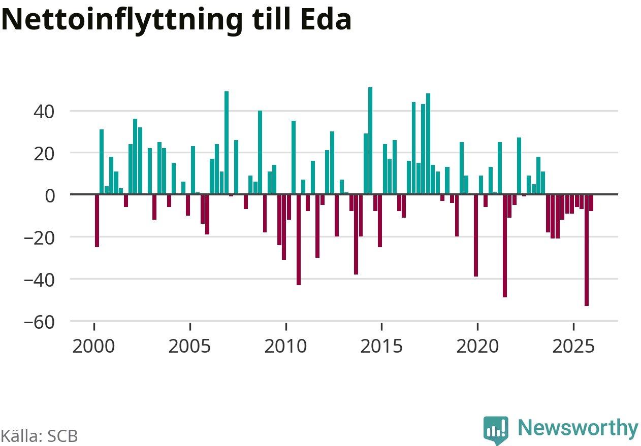 Under fjärde kvartalet 2025 flyttade 83 personer till kommunen medan 91 personer flyttade därifrån. Det är historiskt sett en liten inflyttning under ett kvartal. Sedan seklets början har Eda haft ungefär lika många kvartal med positivt flyttnetto som negativt.