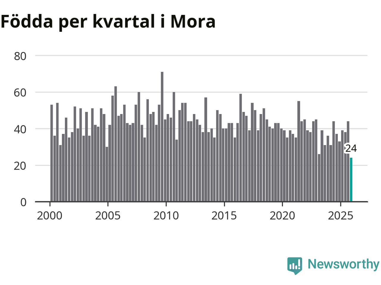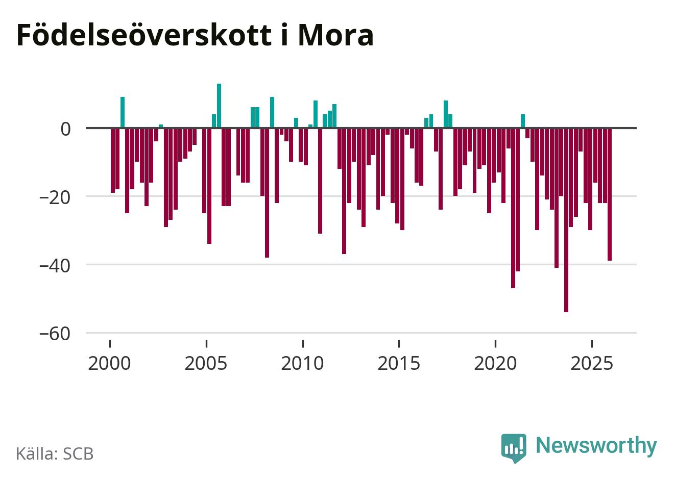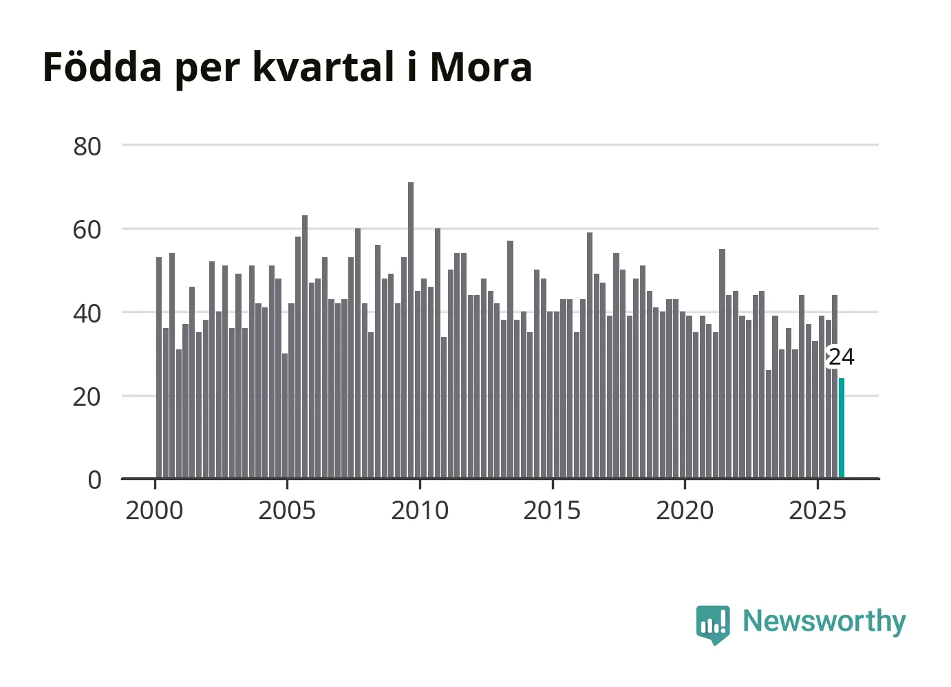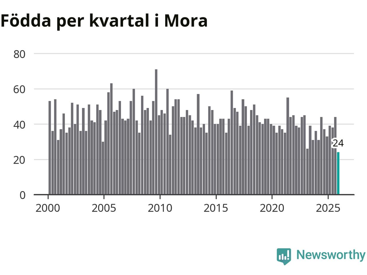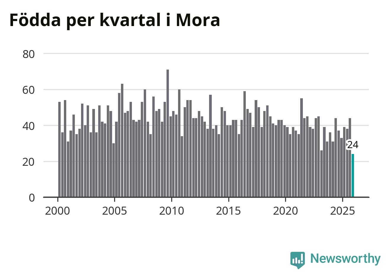 Enligt SCB:s siffror föddes 24 barn i Mora under det senaste kvartalet. Det är det lägsta födelsetal som registrerats i kommunen under 2000-talet. Det finns en osäkerhet här, eftersom SCB lägger på ett slumpmässigt brus på alla siffror. Klart är i alla fall att det rör sig om historiskt låga nivåer. Samtidigt avled 63 personer. Mora hade alltså ett negativt födelsenetto, vilket kommunen historiskt sett nästan alltid har haft.