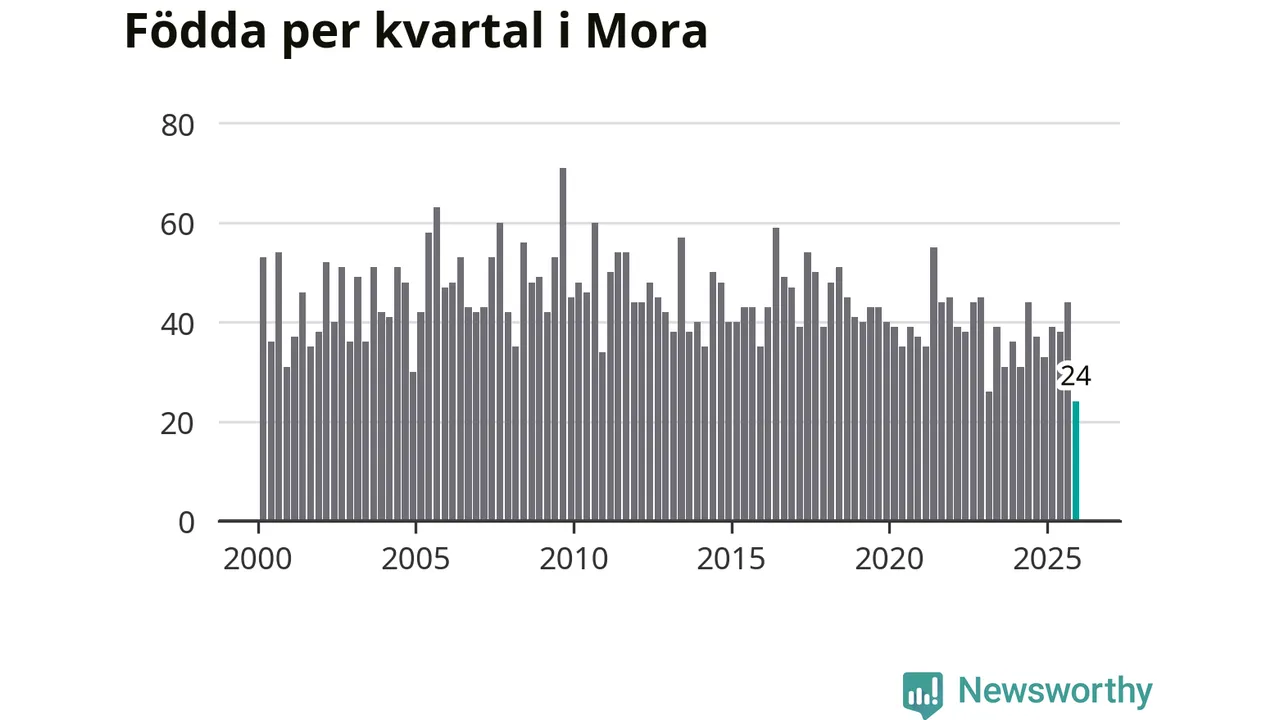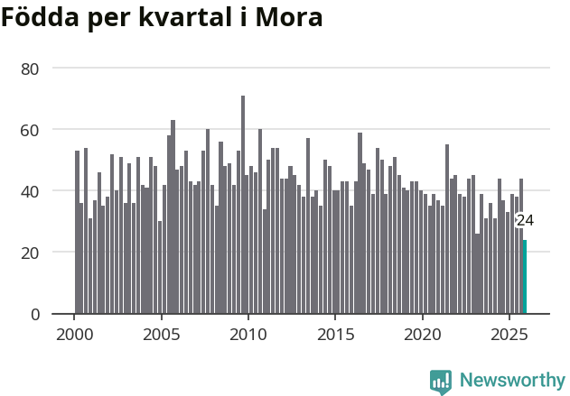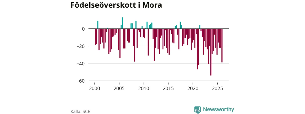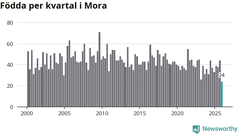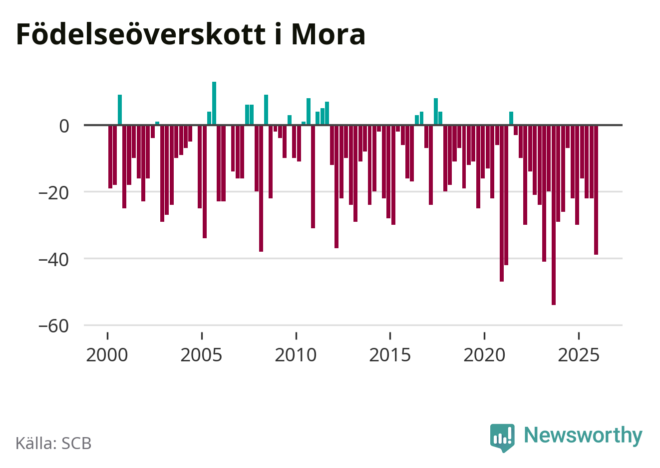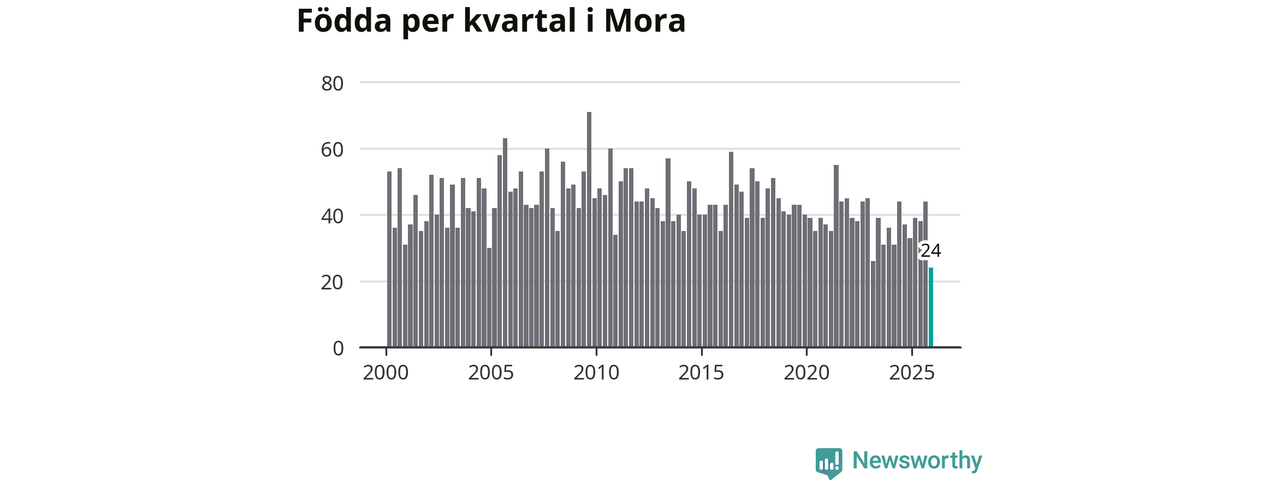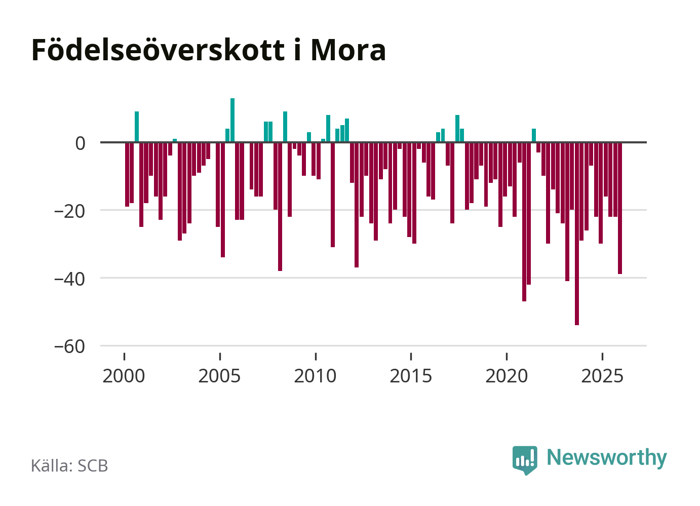 Enligt SCB:s siffror föddes 24 barn i Mora under det senaste kvartalet. Det är det lägsta födelsetal som registrerats i kommunen under 2000-talet. Det finns en osäkerhet här, eftersom SCB lägger på ett slumpmässigt brus på alla siffror. Klart är i alla fall att det rör sig om historiskt låga nivåer. Samtidigt avled 63 personer. Mora hade alltså ett negativt födelsenetto, vilket kommunen historiskt sett nästan alltid har haft.