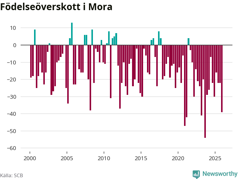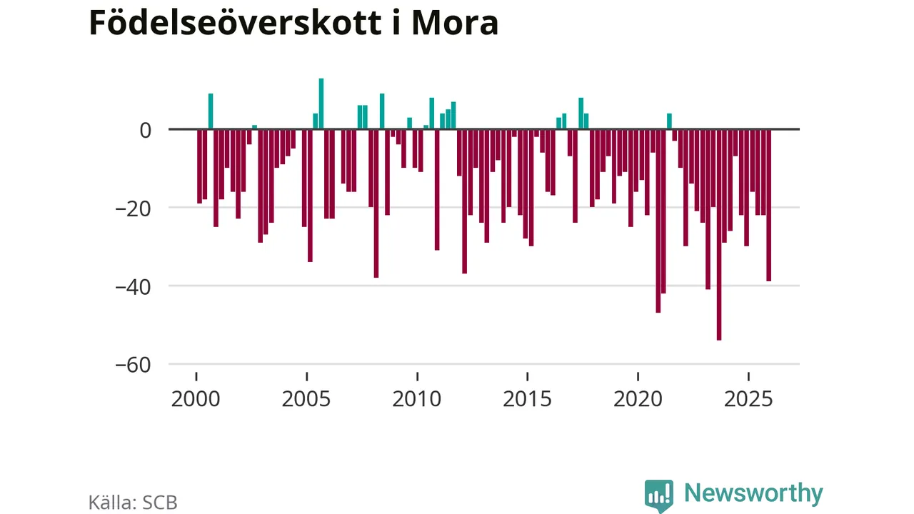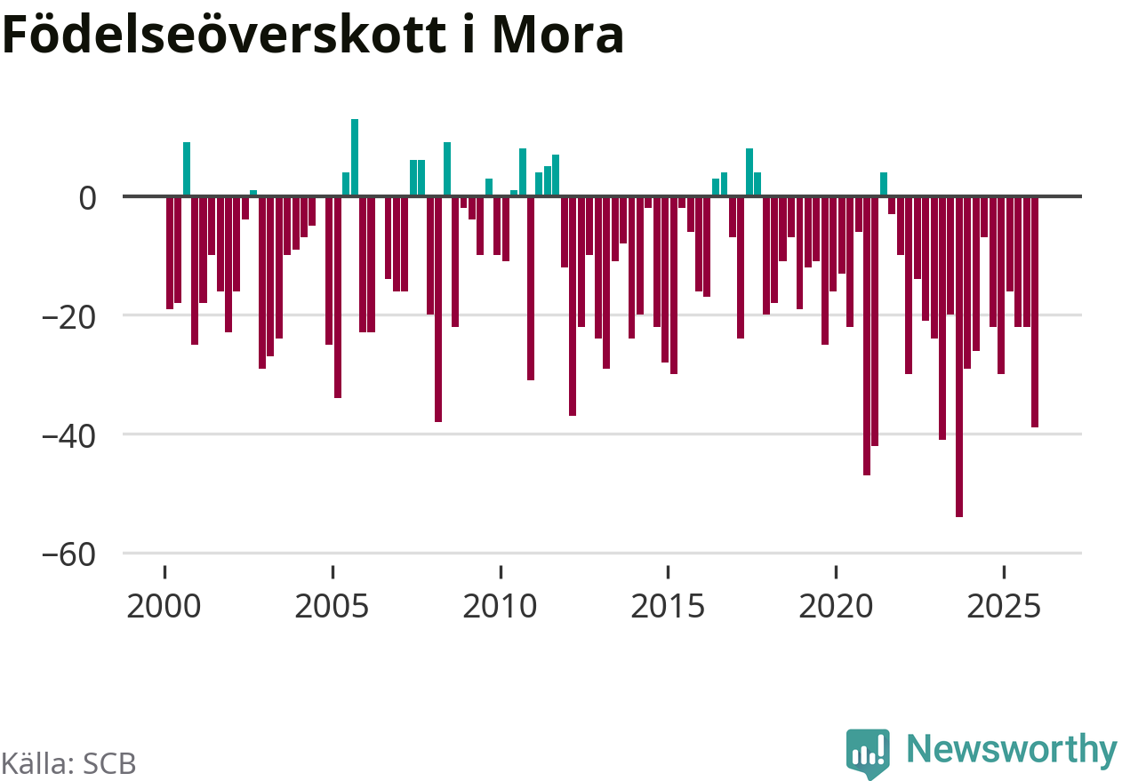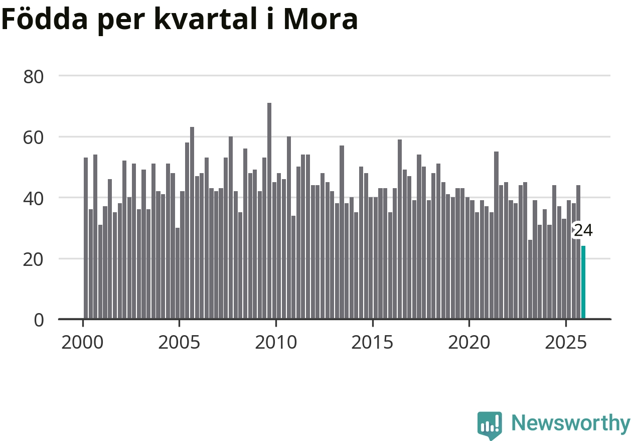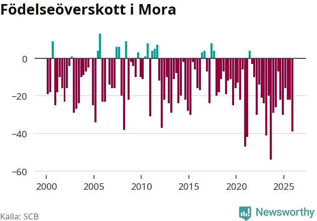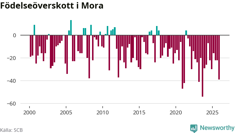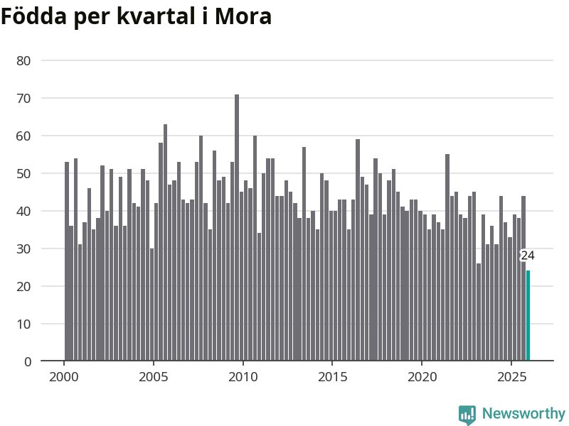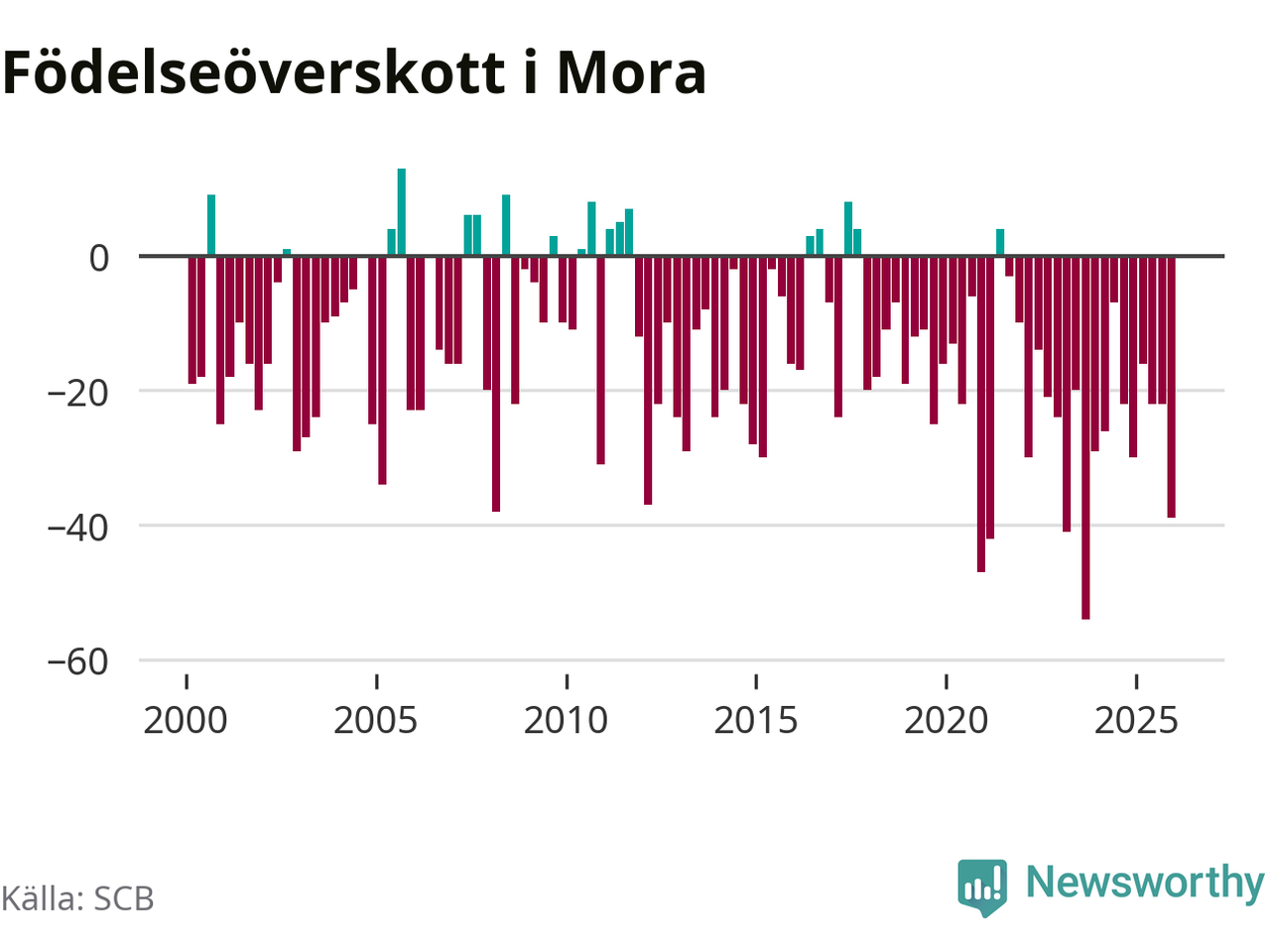 Enligt SCB:s siffror föddes 24 barn i Mora under det senaste kvartalet. Det är det lägsta födelsetal som registrerats i kommunen under 2000-talet. Det finns en osäkerhet här, eftersom SCB lägger på ett slumpmässigt brus på alla siffror. Klart är i alla fall att det rör sig om historiskt låga nivåer. Samtidigt avled 63 personer. Mora hade alltså ett negativt födelsenetto, vilket kommunen historiskt sett nästan alltid har haft.