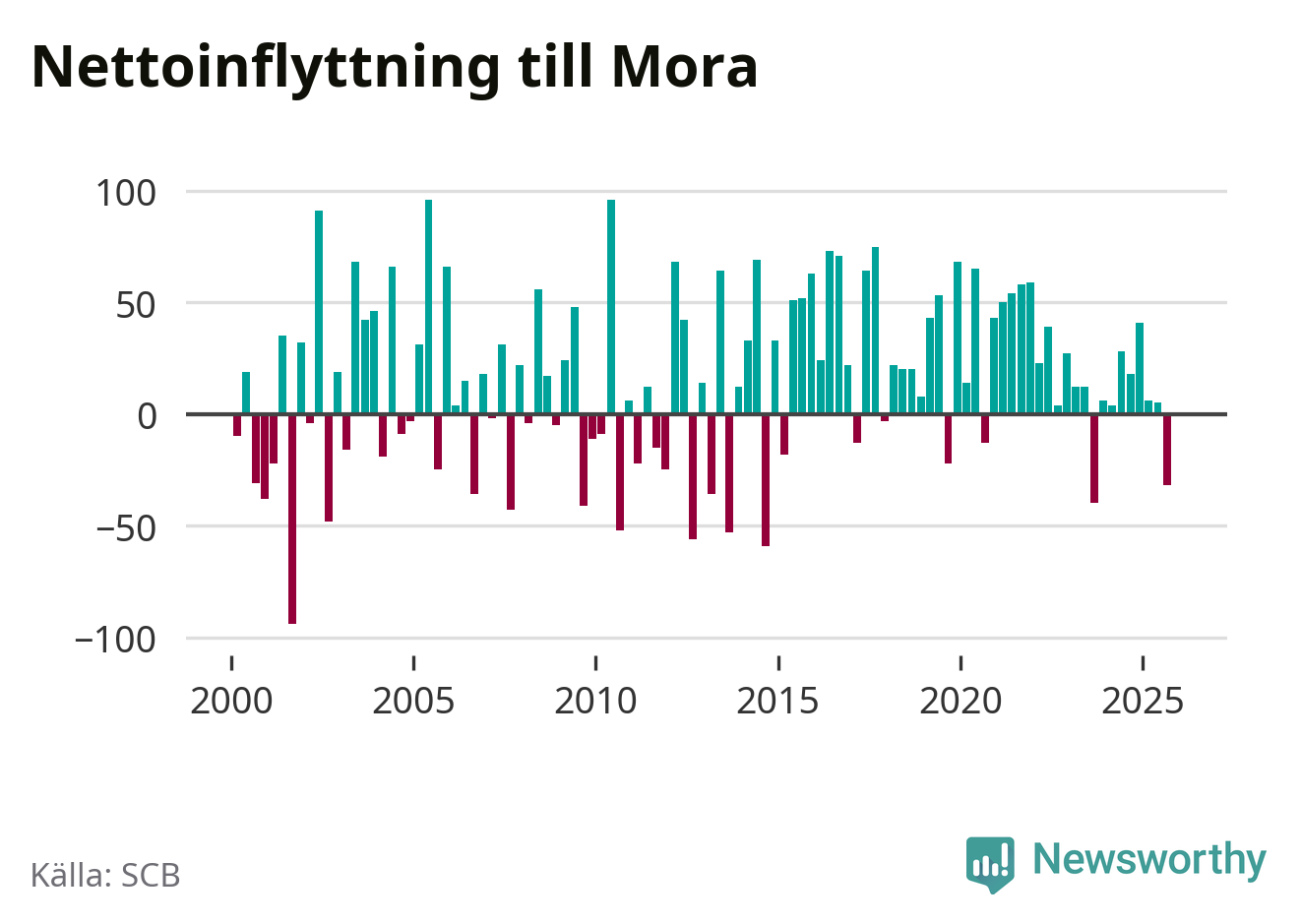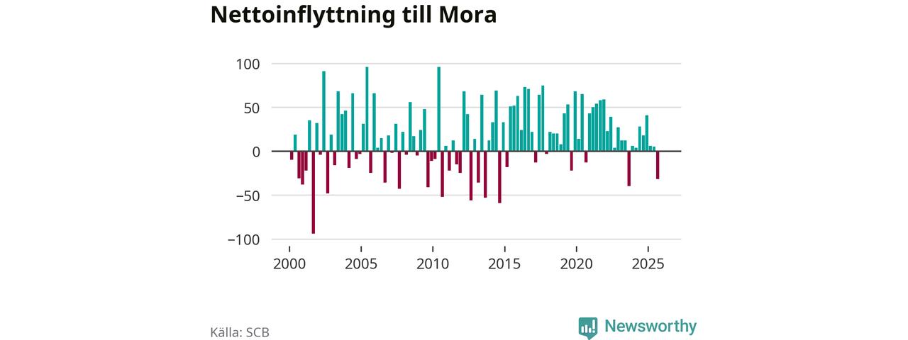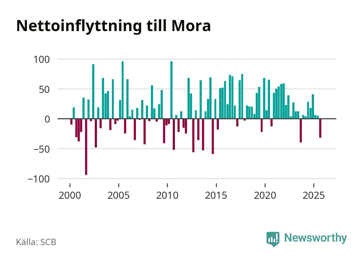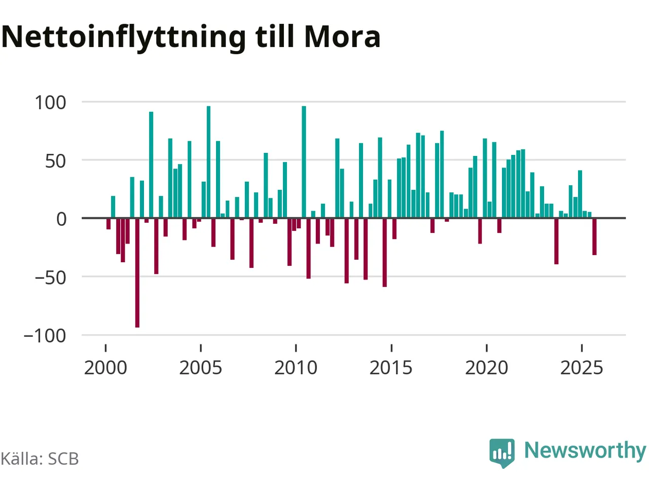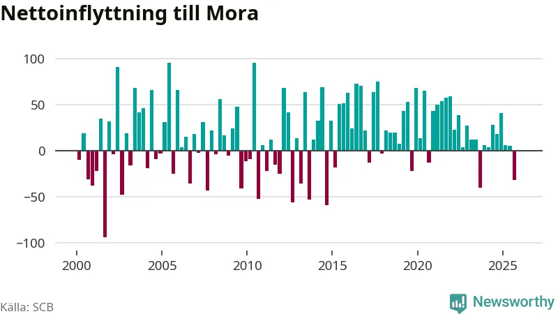 Under fjärde kvartalet 2025 flyttade 182 personer till kommunen samtidigt som lika många flyttade därifrån. Sedan seklets början har Mora oftast haft ett positivt flyttnetto.