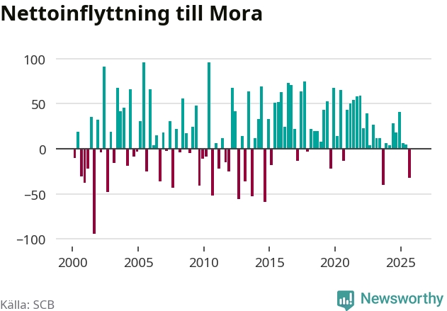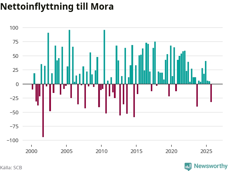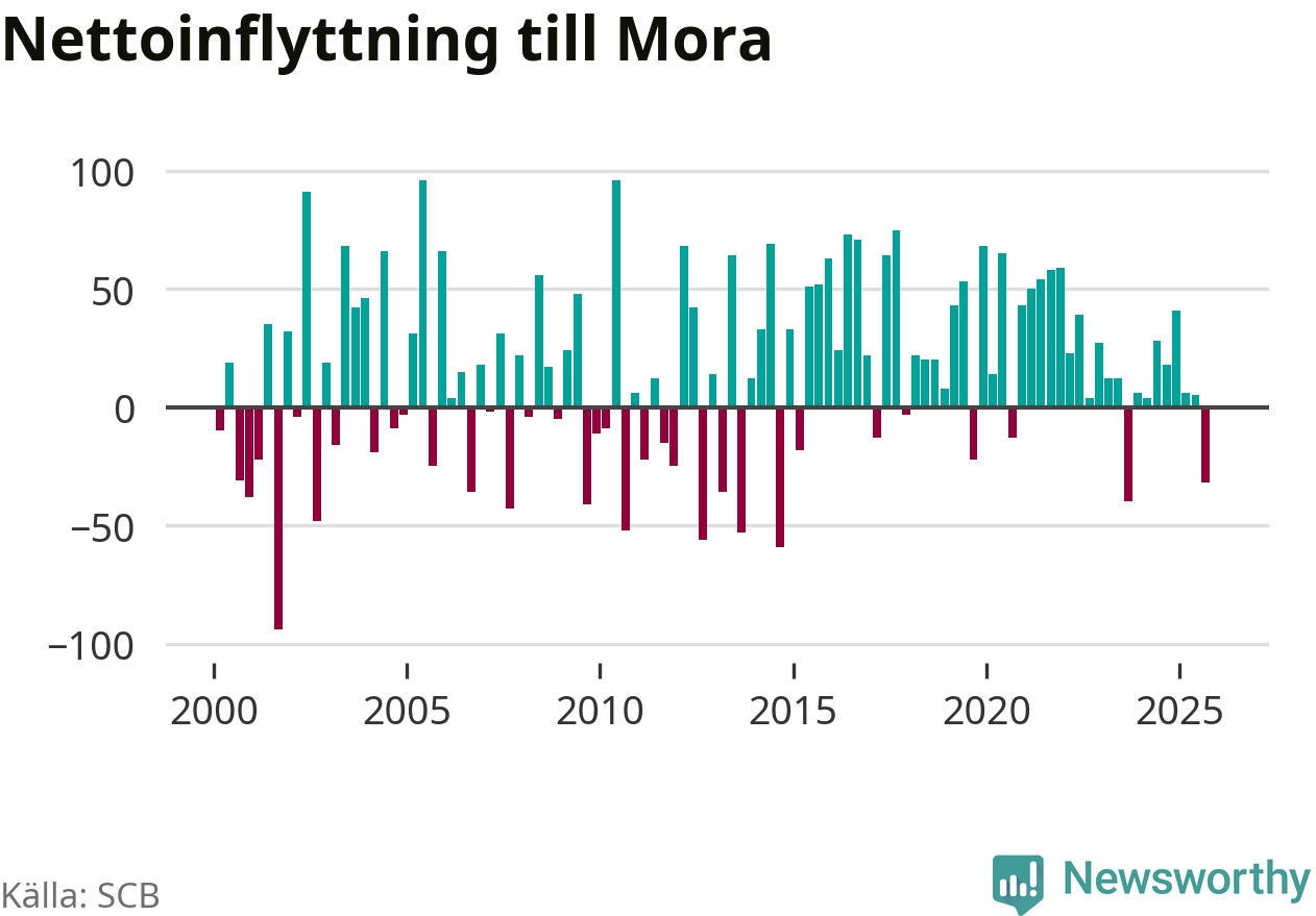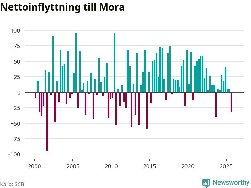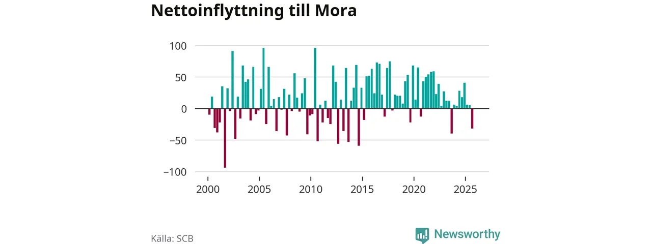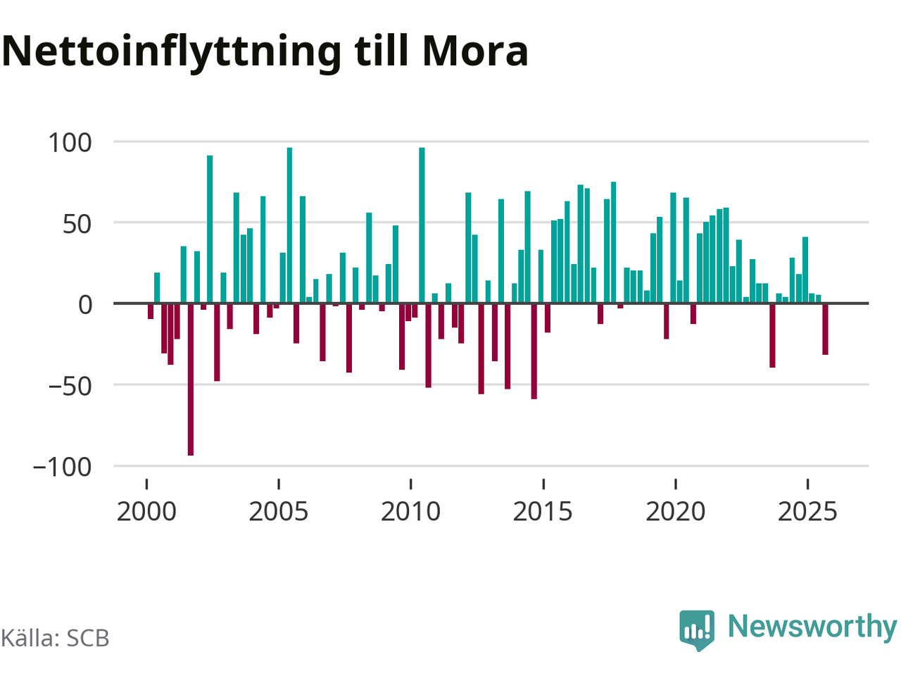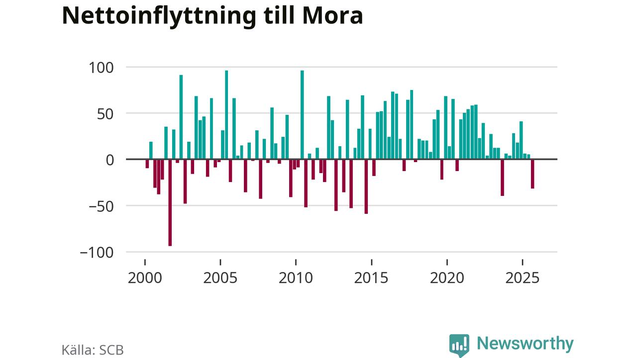 Under fjärde kvartalet 2025 flyttade 182 personer till kommunen samtidigt som lika många flyttade därifrån. Sedan seklets början har Mora oftast haft ett positivt flyttnetto.