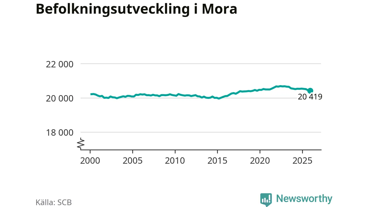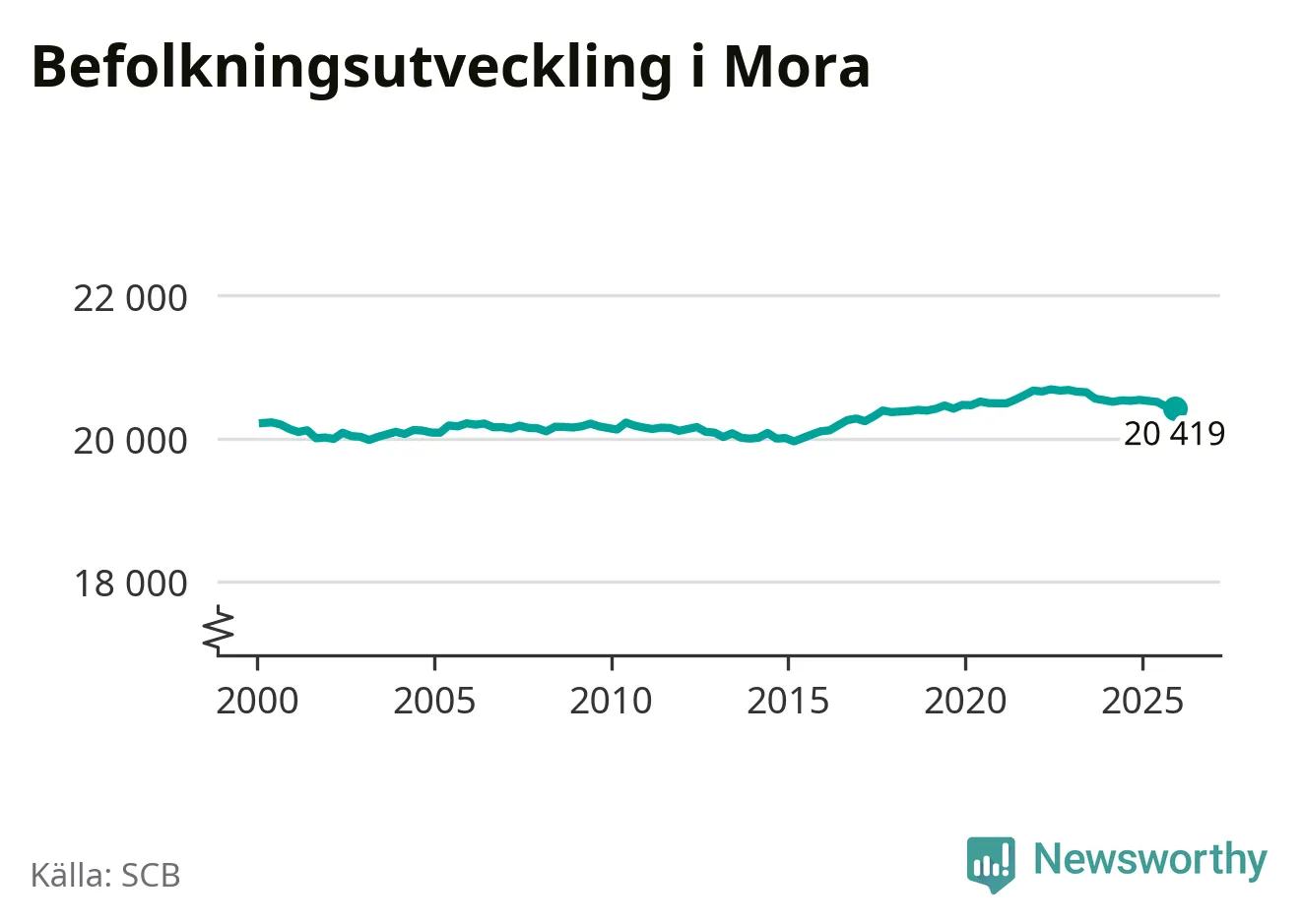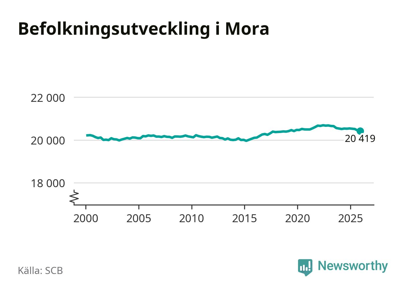 Jämfört med för ett år sedan har befolkningen i Mora minskat med ungefär 120 personer – vilket motsvarar en nedgång på 0,6 procent. Sedan millennieskiftet har folkmängden ökat med runt 200 personer, eller en procent.