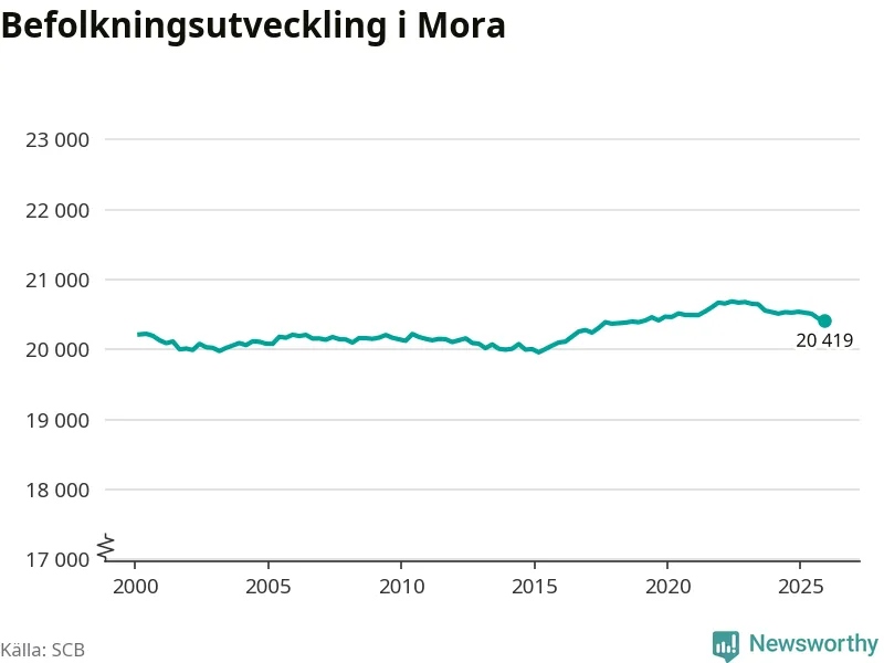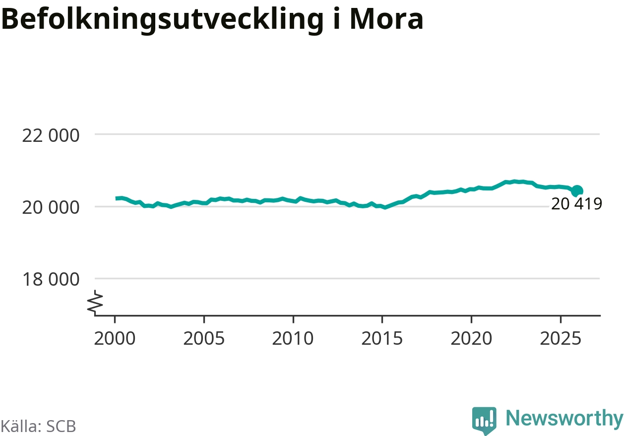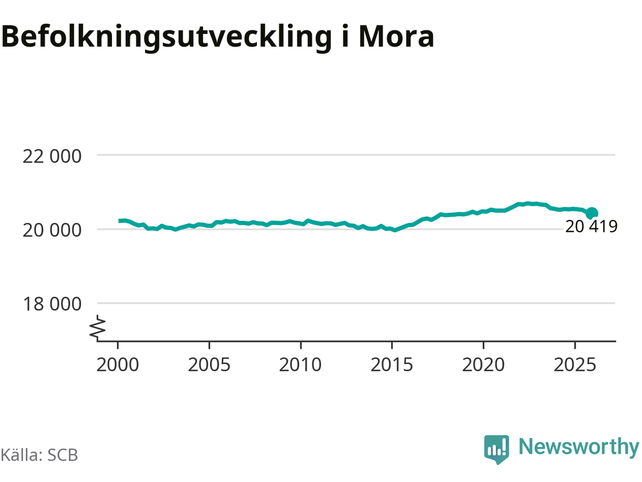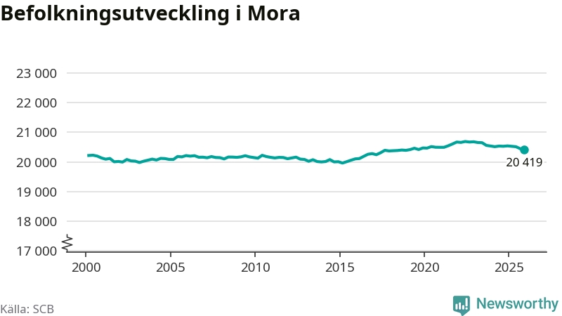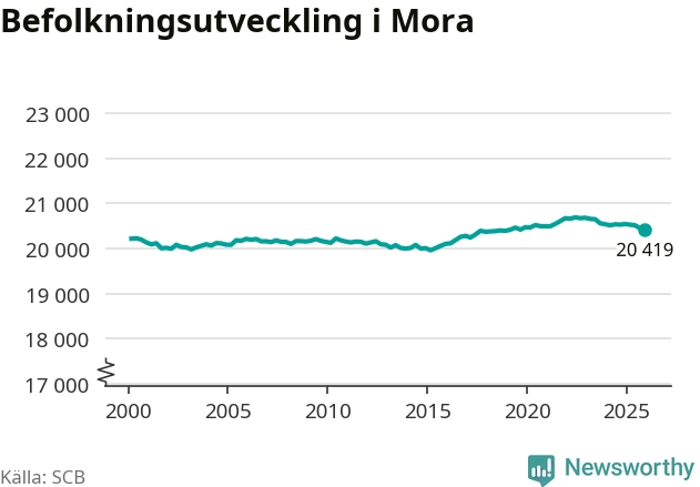 Jämfört med för ett år sedan har befolkningen i Mora minskat med ungefär 120 personer – vilket motsvarar en nedgång på 0,6 procent. Sedan millennieskiftet har folkmängden ökat med runt 200 personer, eller en procent.