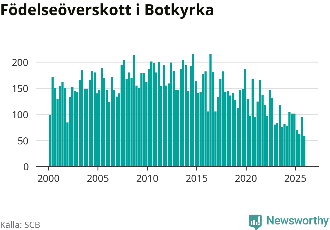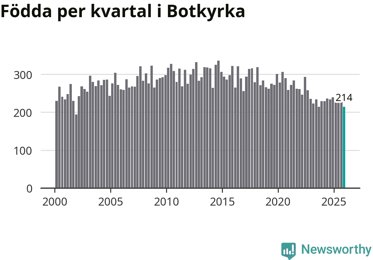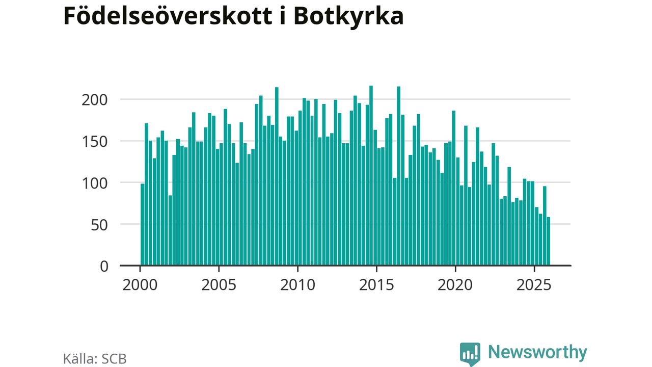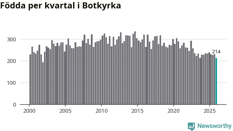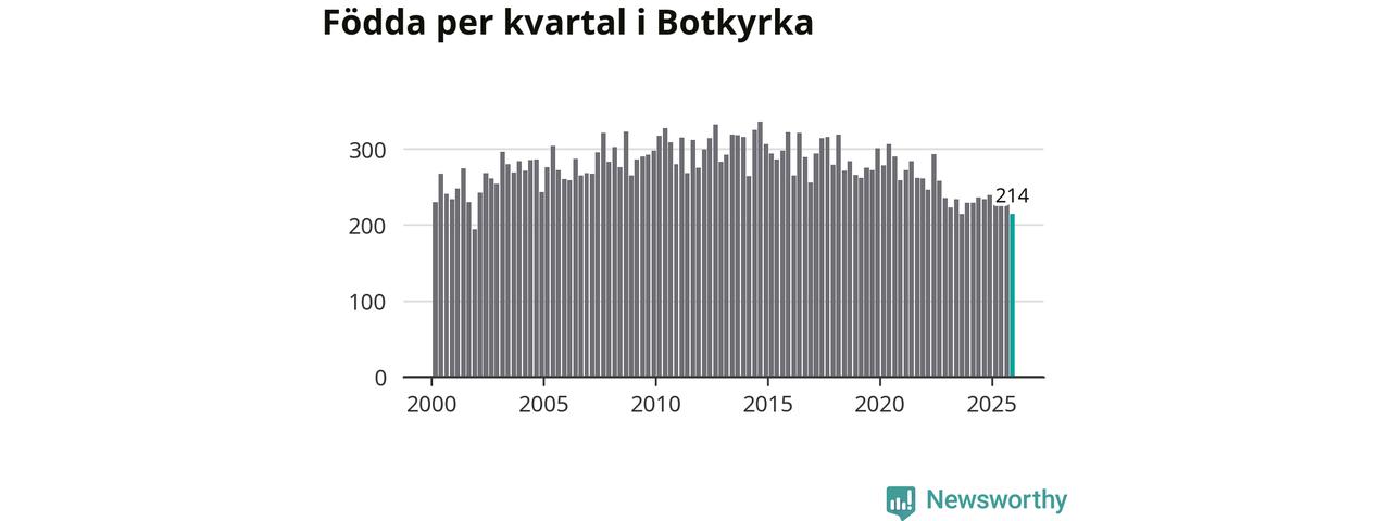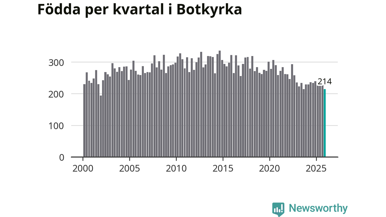 Enligt SCB:s siffror föddes 214 barn i Botkyrka under det senaste kvartalet. Samtidigt avled 156 personer. Botkyrka hade alltså ett positivt födelsenetto, vilket kommunen historiskt sett i princip alltid har haft.