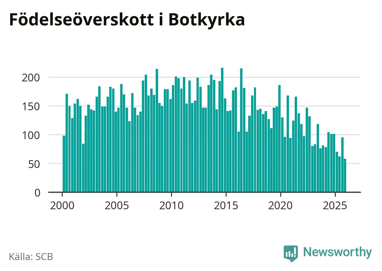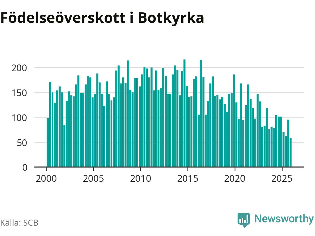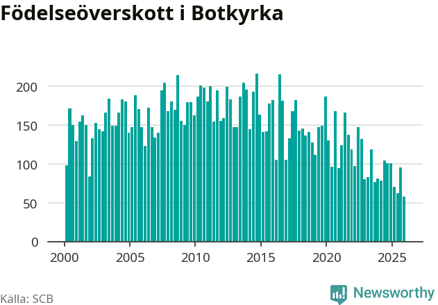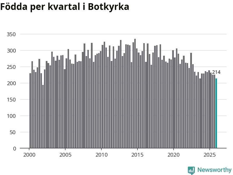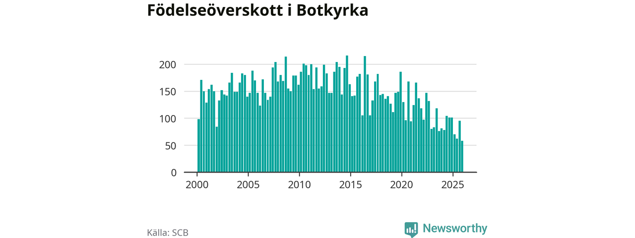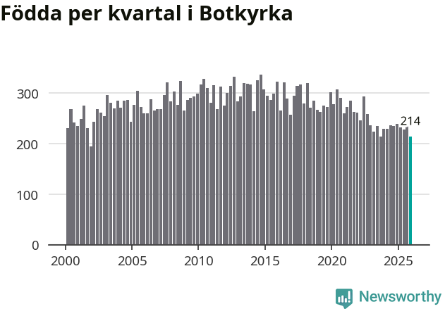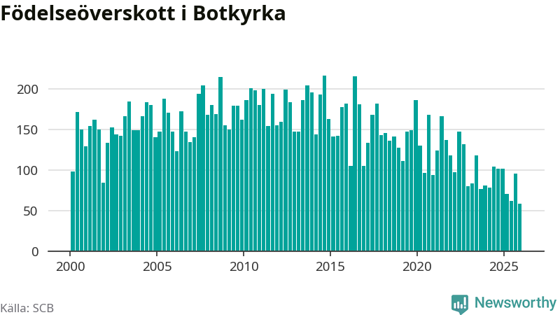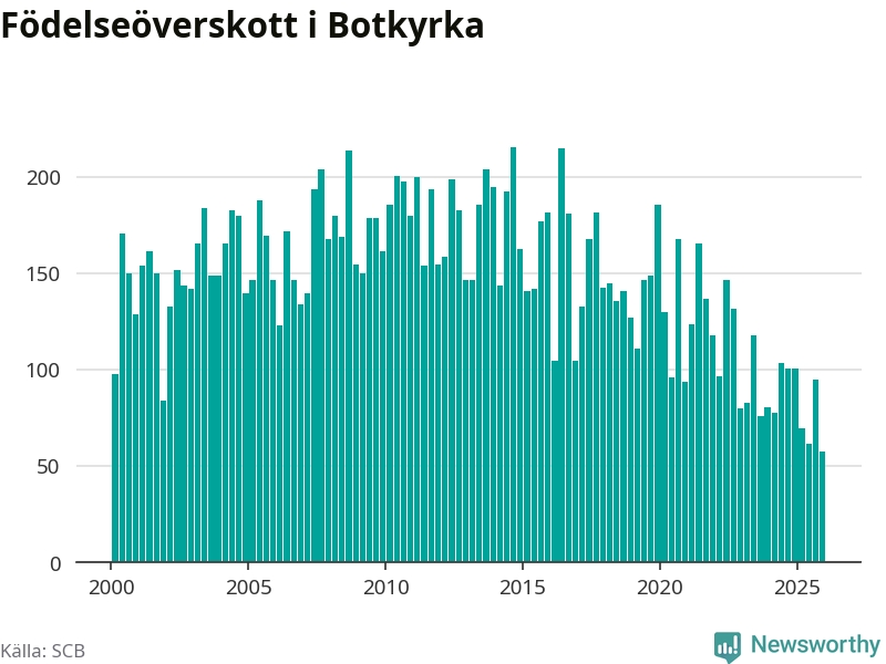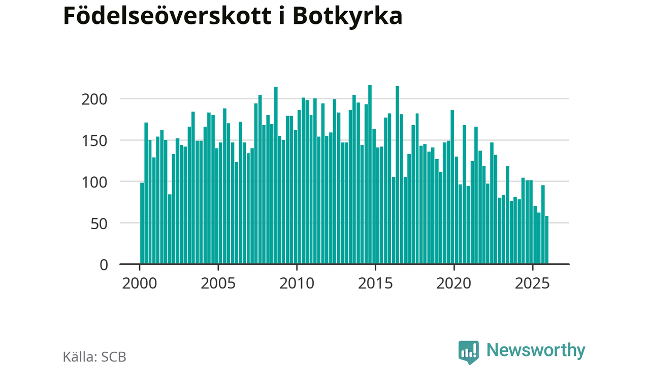 Enligt SCB:s siffror föddes 214 barn i Botkyrka under det senaste kvartalet. Samtidigt avled 156 personer. Botkyrka hade alltså ett positivt födelsenetto, vilket kommunen historiskt sett i princip alltid har haft.
