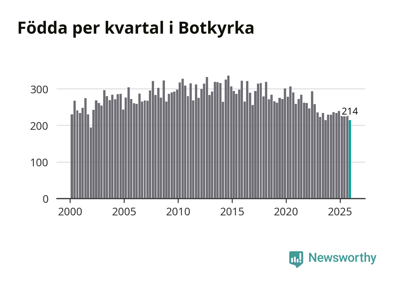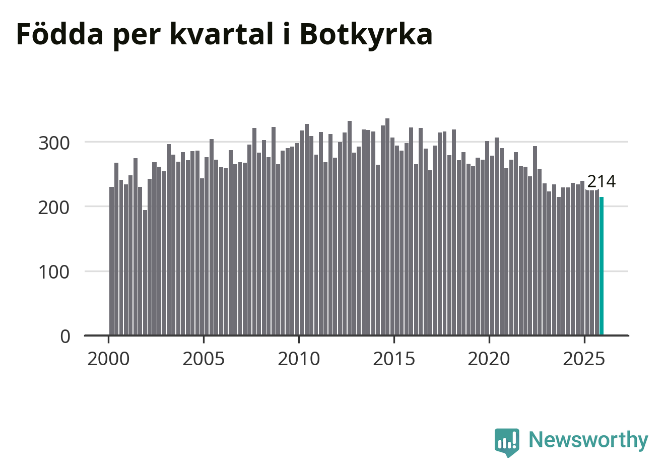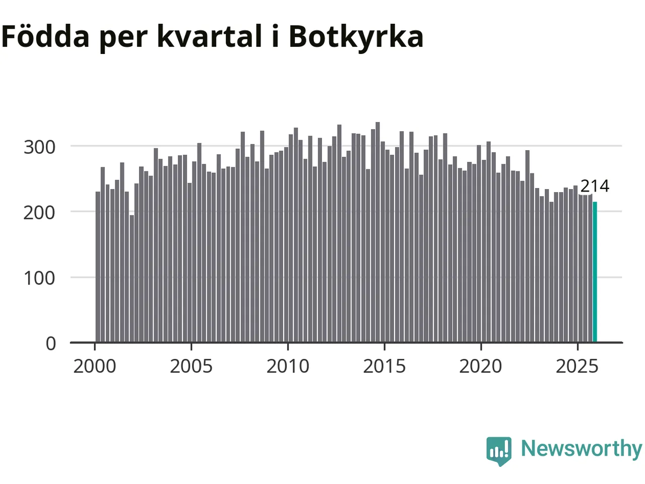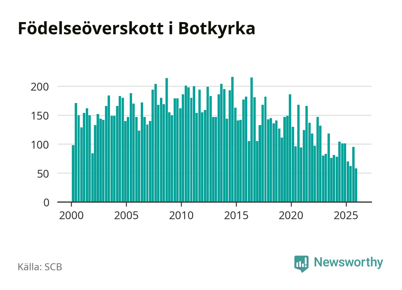 Enligt SCB:s siffror föddes 214 barn i Botkyrka under det senaste kvartalet. Samtidigt avled 156 personer. Botkyrka hade alltså ett positivt födelsenetto, vilket kommunen historiskt sett i princip alltid har haft.