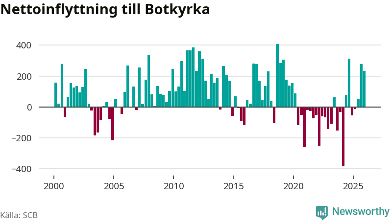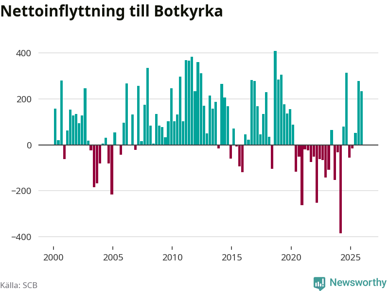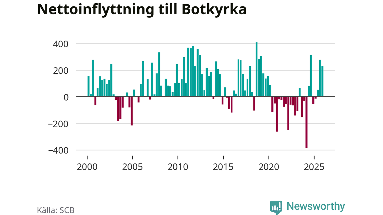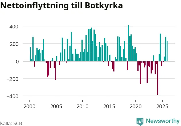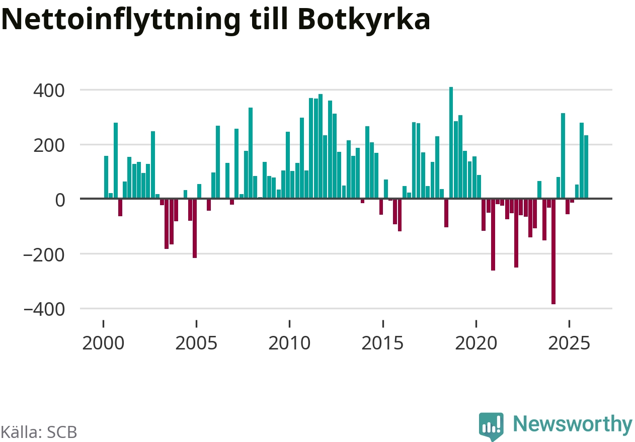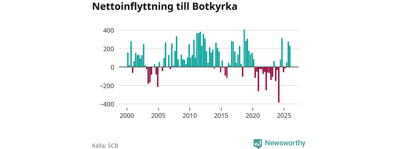 Under fjärde kvartalet 2025 flyttade 2 135 personer till kommunen medan 1 902 personer flyttade därifrån. Sedan seklets början har Botkyrka haft ungefär lika många kvartal med positivt flyttnetto som negativt, inklusive det senaste kvartalet.