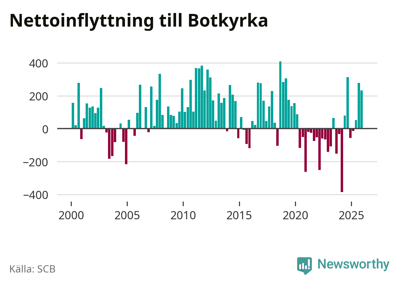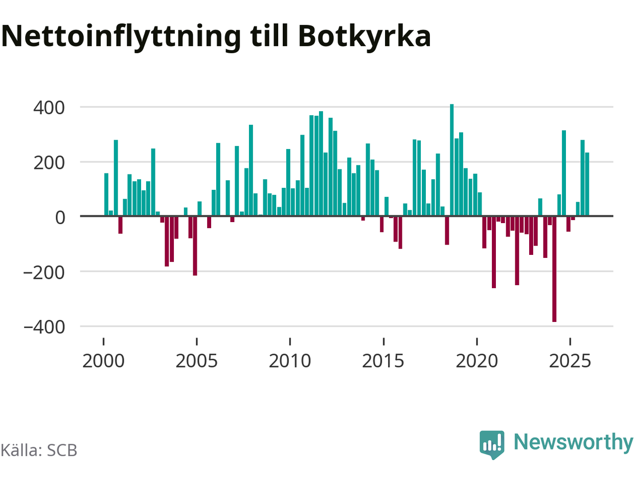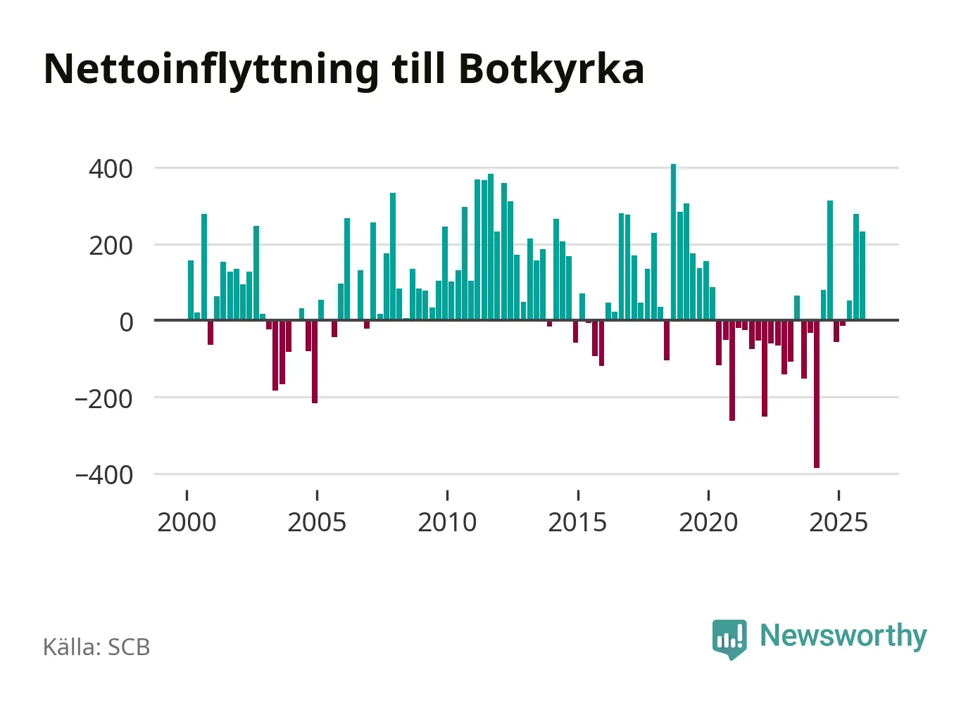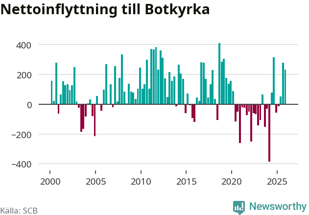 Under fjärde kvartalet 2025 flyttade 2 135 personer till kommunen medan 1 902 personer flyttade därifrån. Sedan seklets början har Botkyrka haft ungefär lika många kvartal med positivt flyttnetto som negativt, inklusive det senaste kvartalet.