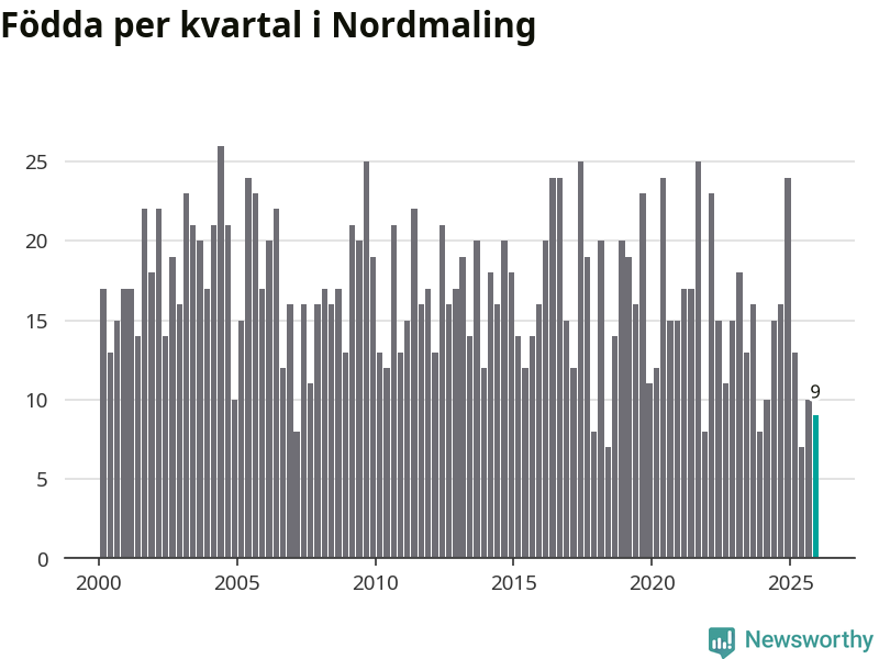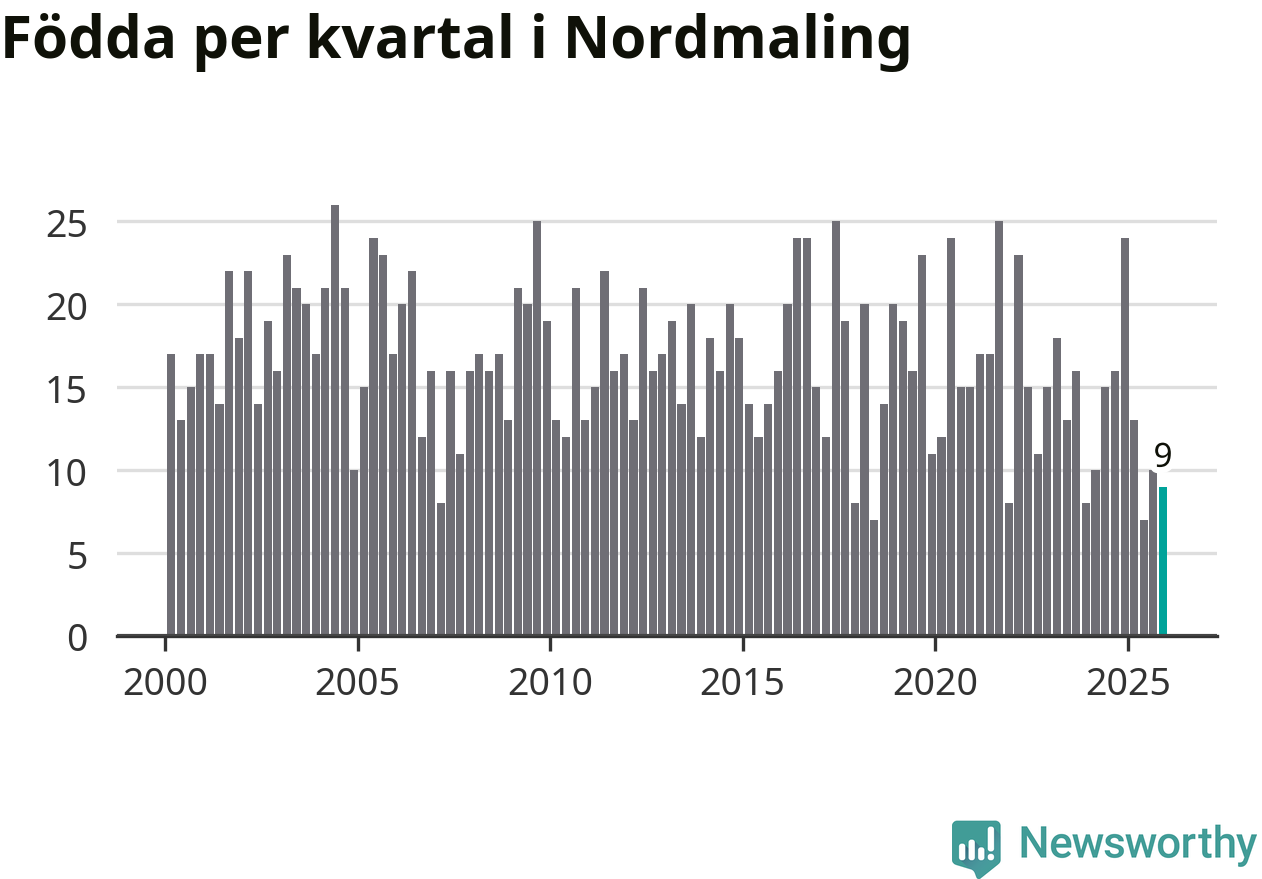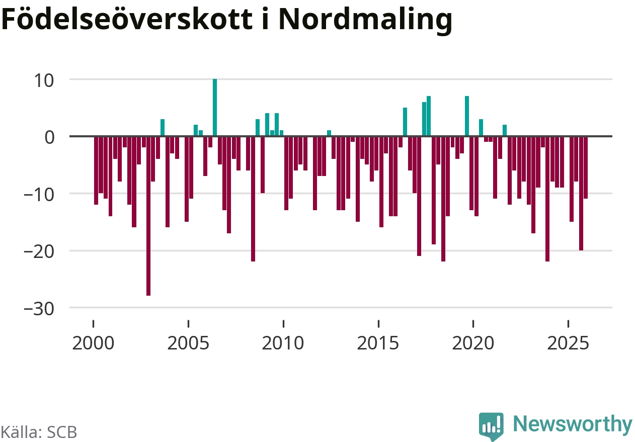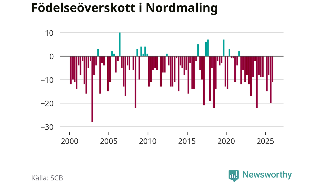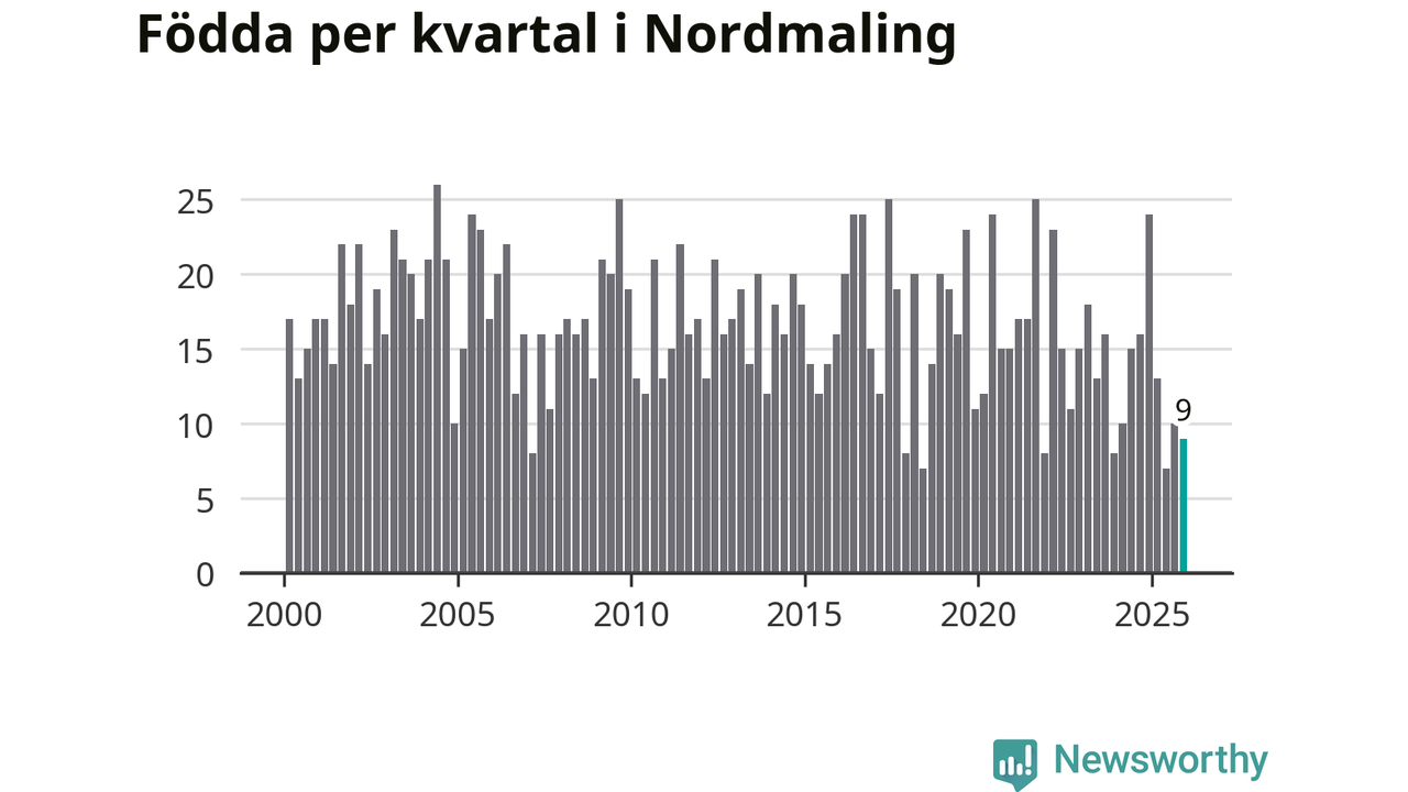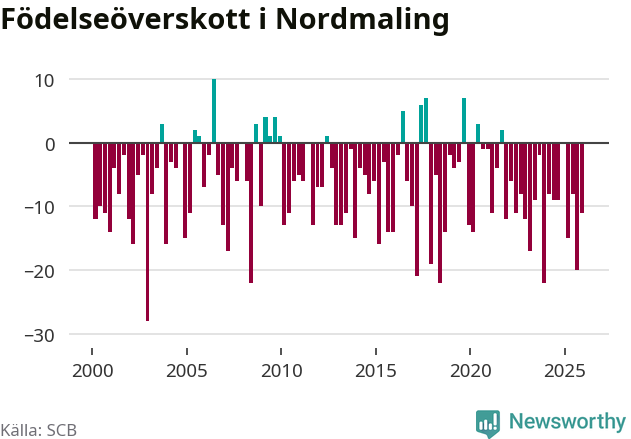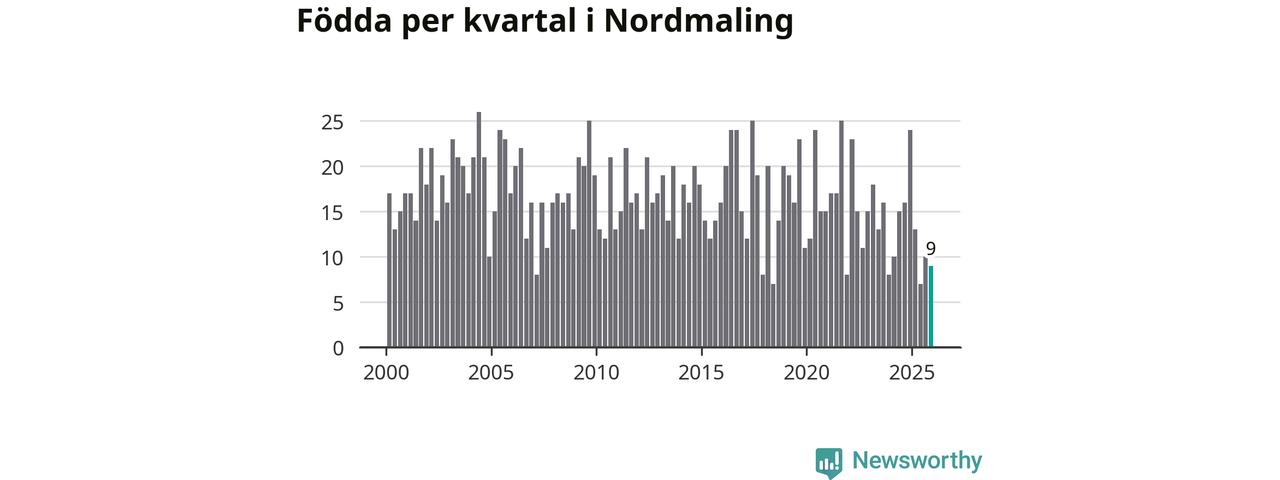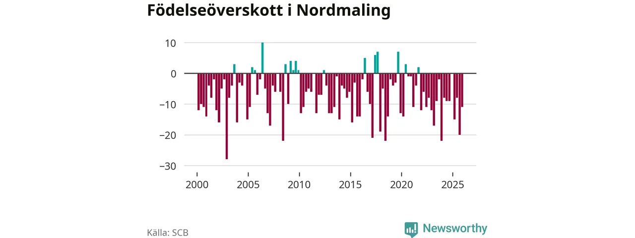 Enligt SCB:s siffror föddes nio barn i Nordmaling under det senaste kvartalet. Samtidigt avled 20 personer. Nordmaling hade alltså ett negativt födelsenetto, vilket kommunen historiskt sett nästan alltid har haft.