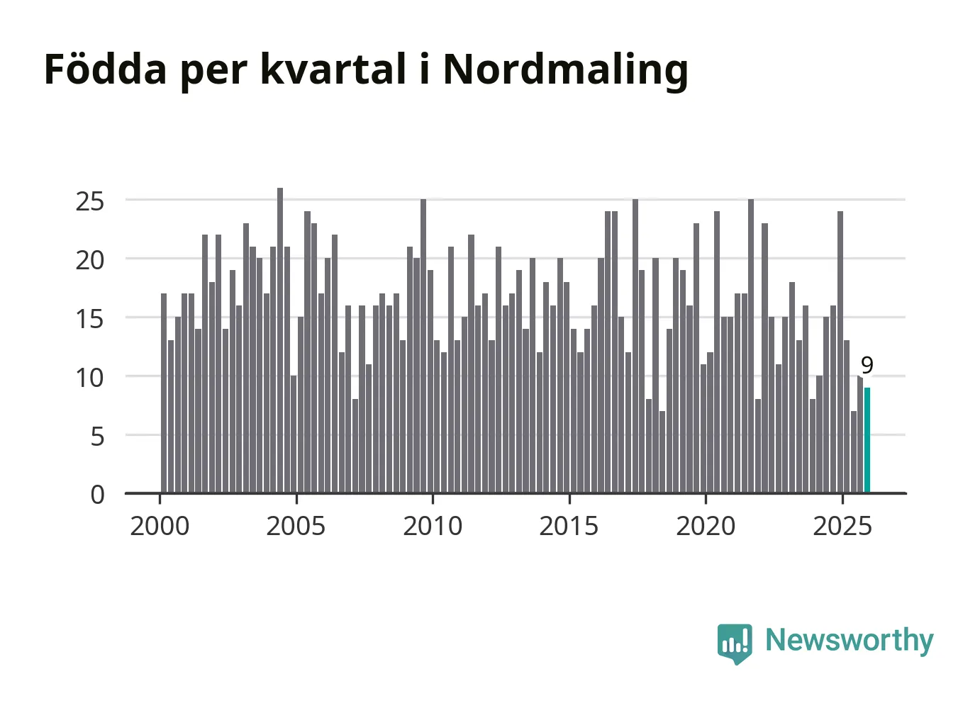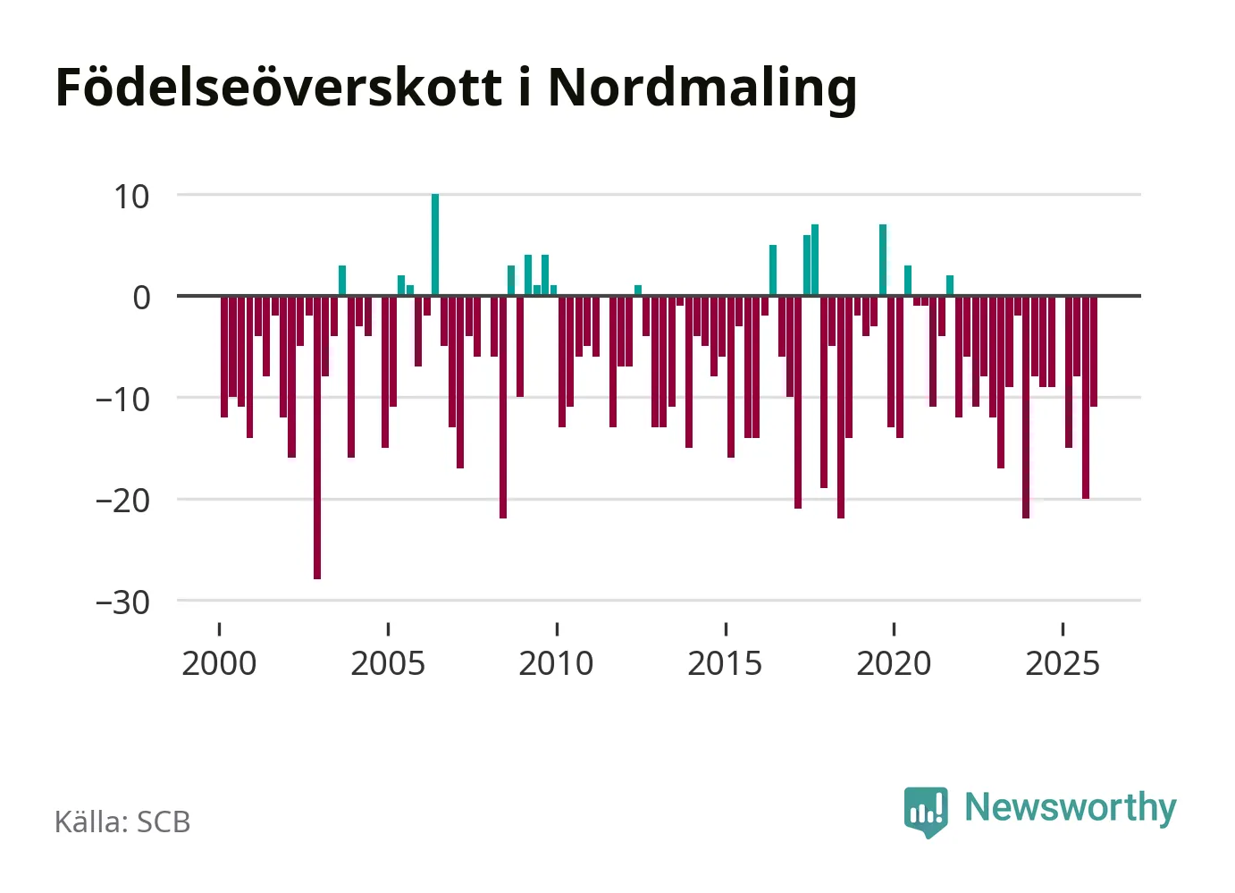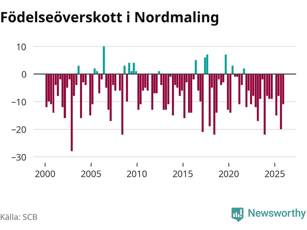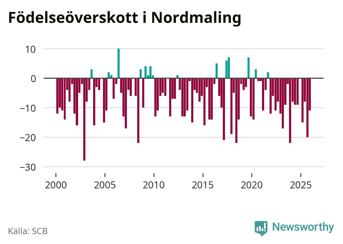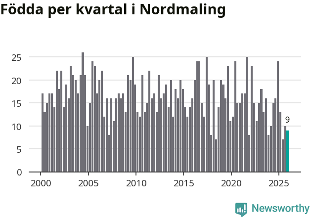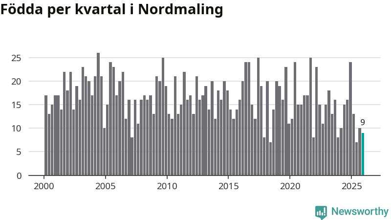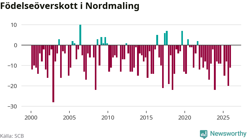 Enligt SCB:s siffror föddes nio barn i Nordmaling under det senaste kvartalet. Samtidigt avled 20 personer. Nordmaling hade alltså ett negativt födelsenetto, vilket kommunen historiskt sett nästan alltid har haft.