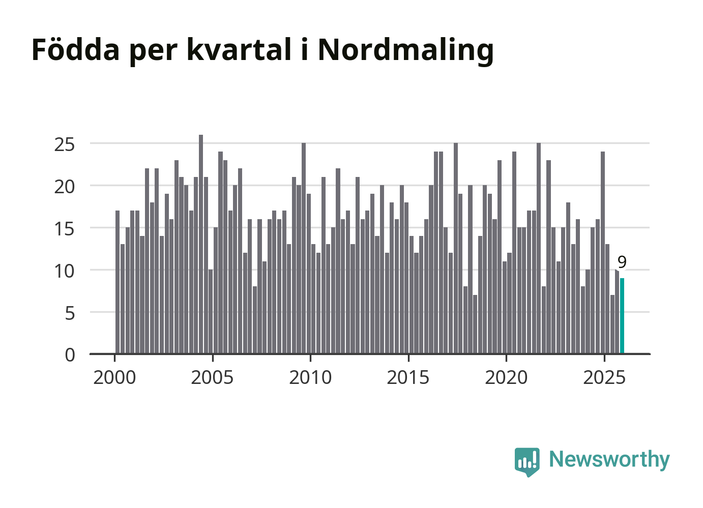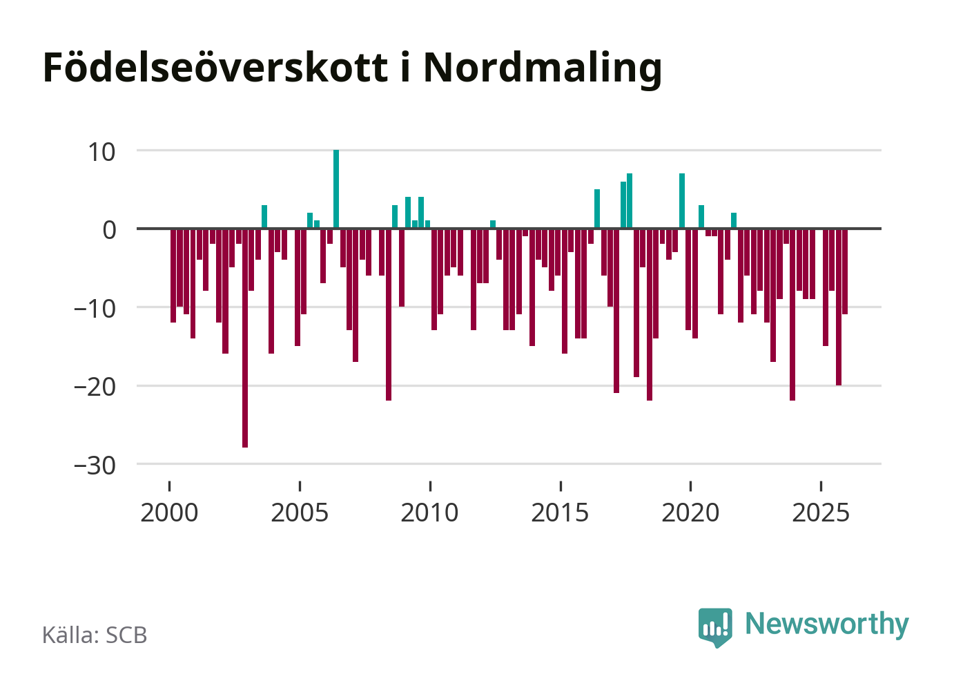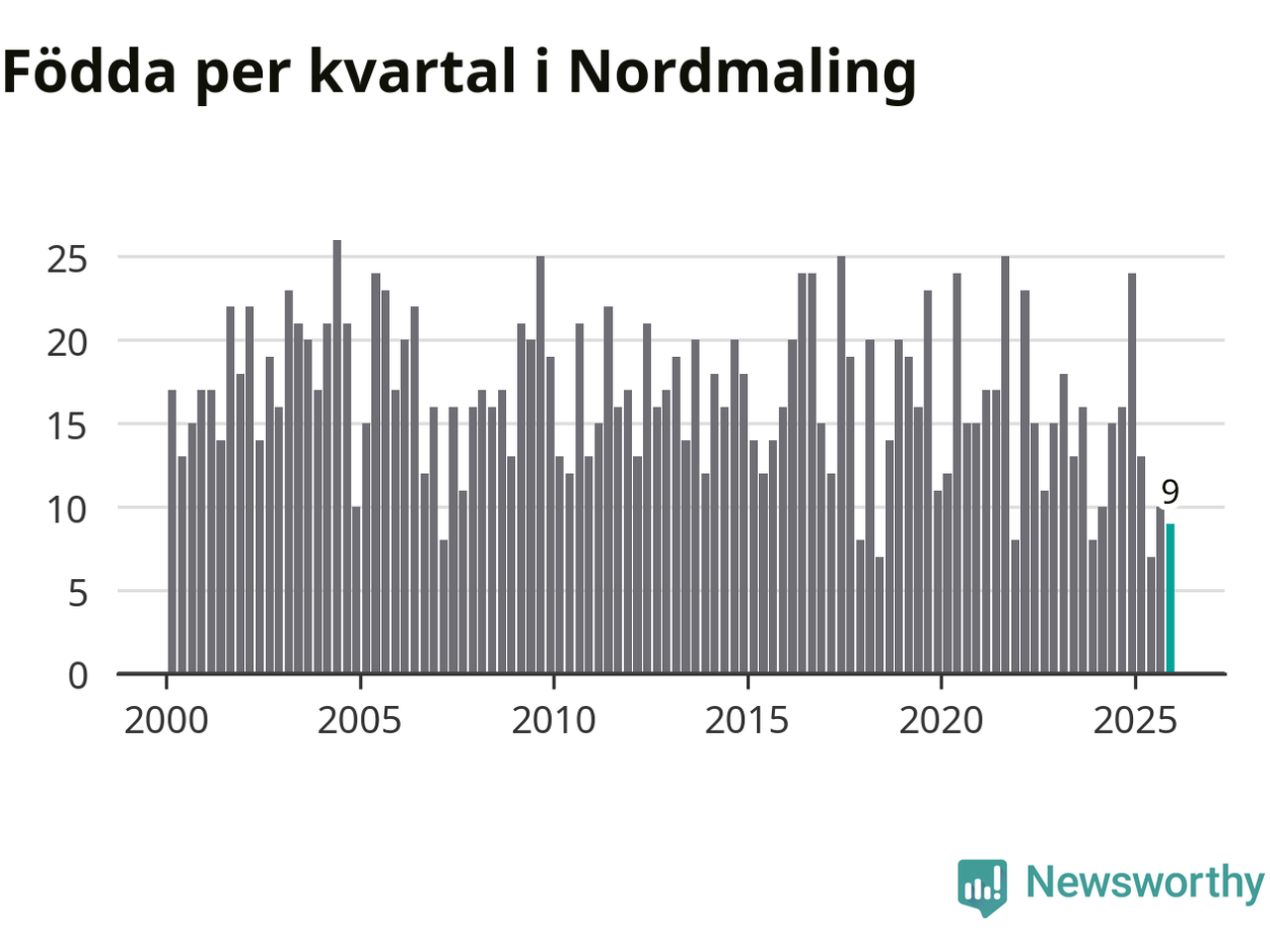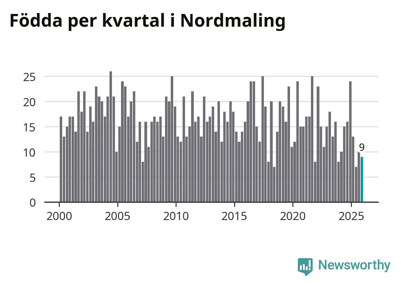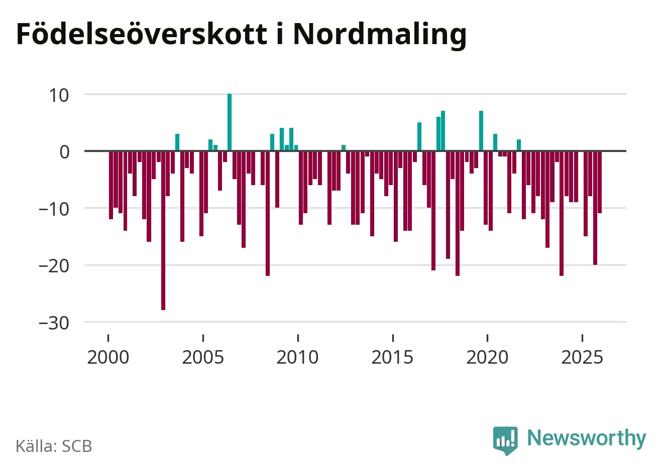 Enligt SCB:s siffror föddes nio barn i Nordmaling under det senaste kvartalet. Samtidigt avled 20 personer. Nordmaling hade alltså ett negativt födelsenetto, vilket kommunen historiskt sett nästan alltid har haft.