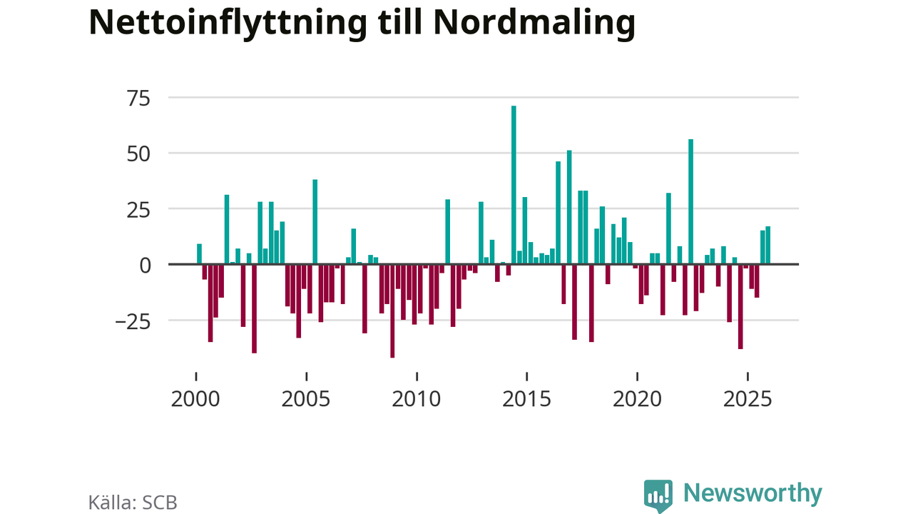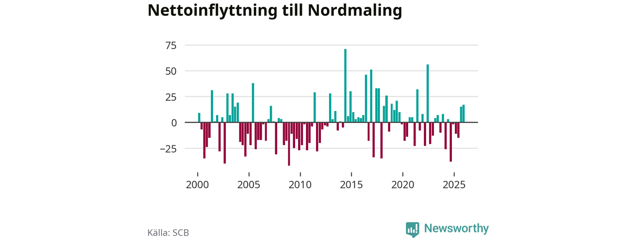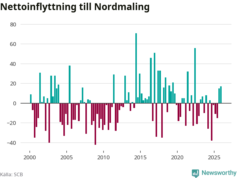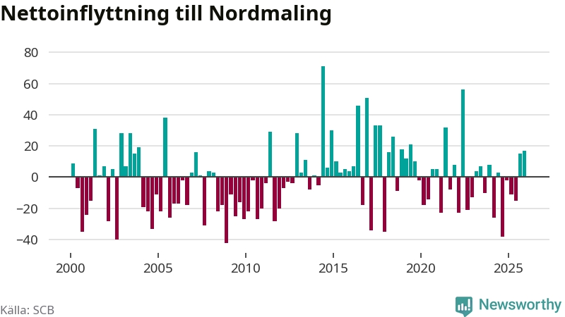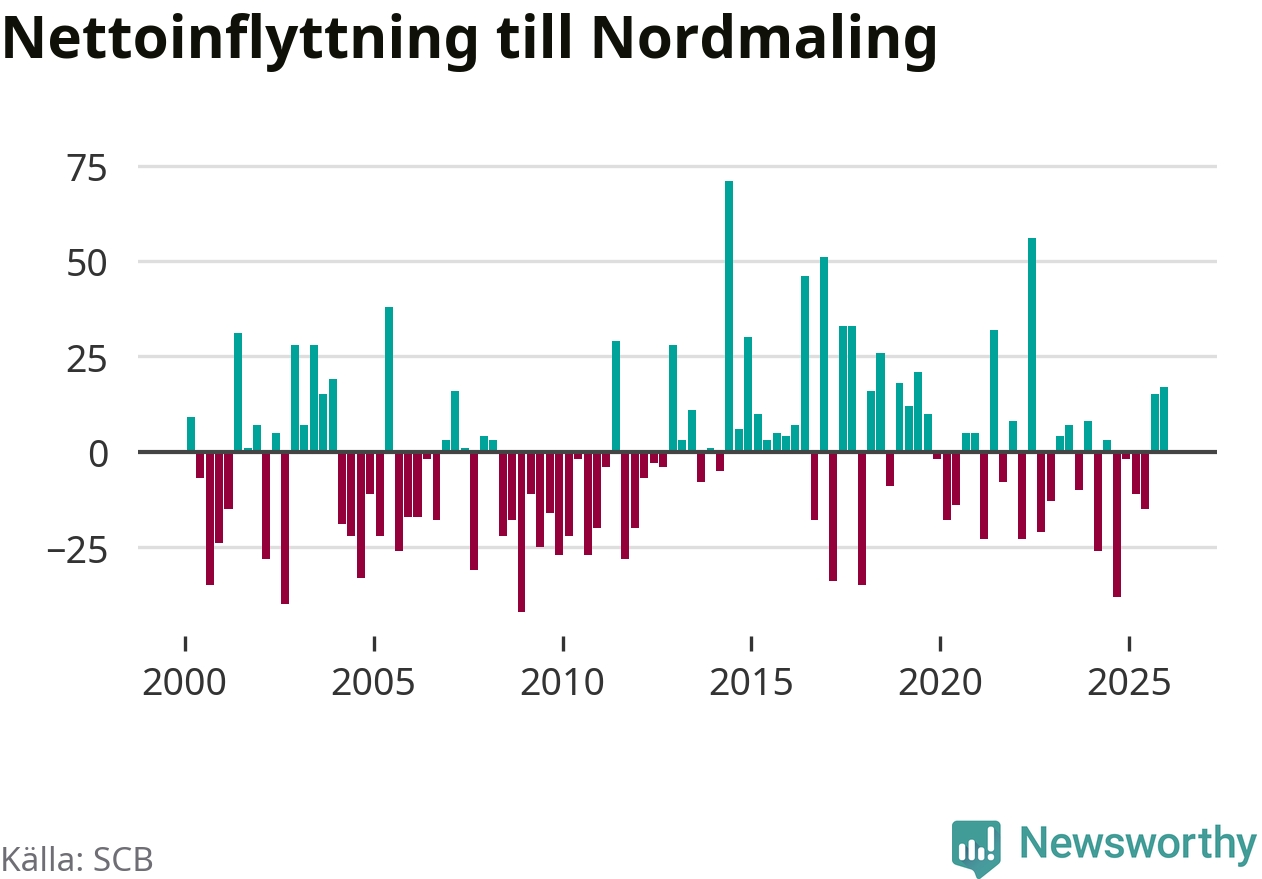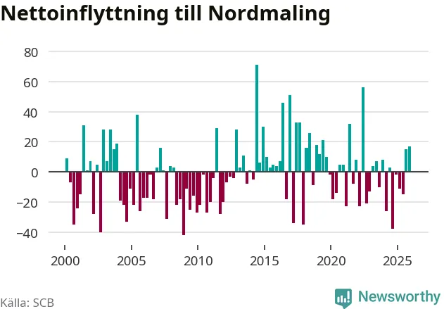 Under fjärde kvartalet 2025 flyttade 89 personer till kommunen medan 72 personer flyttade därifrån. Sedan seklets början har Nordmaling oftast haft ett positivt flyttnetto, inklusive det senaste kvartalet.