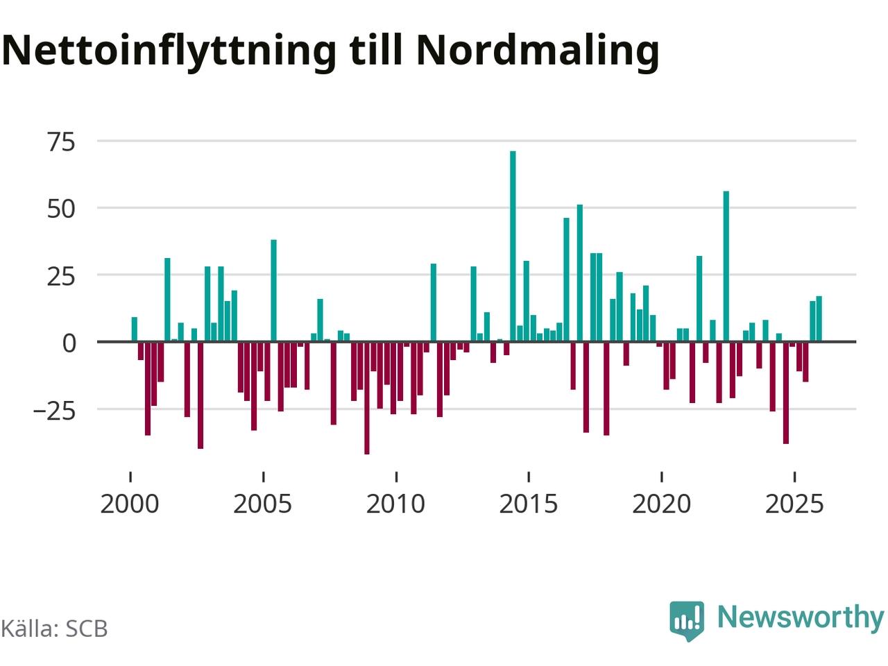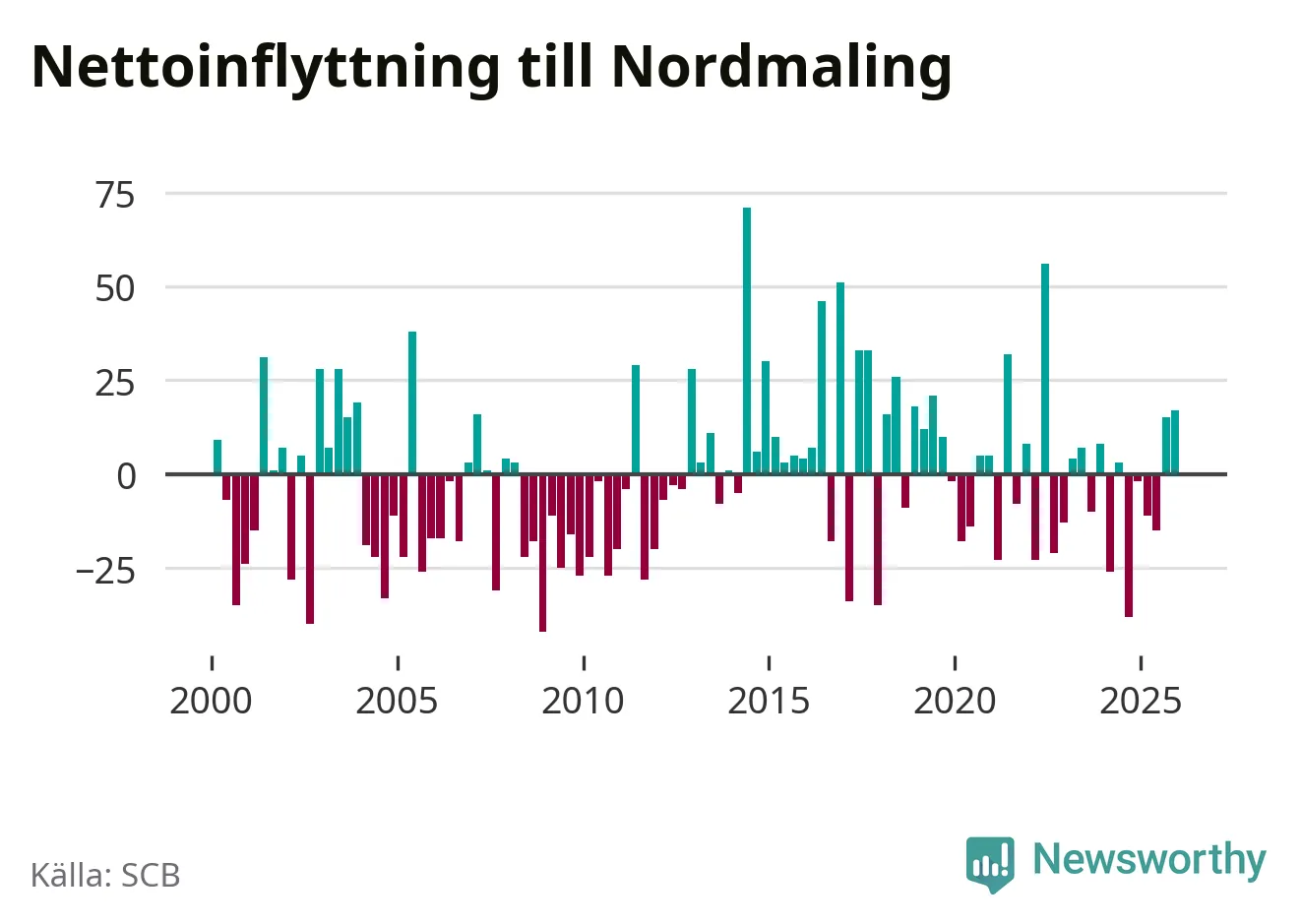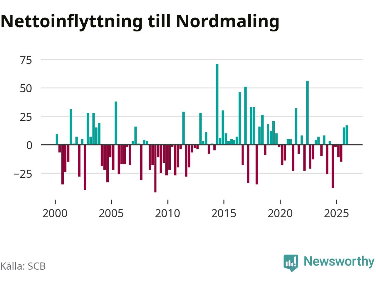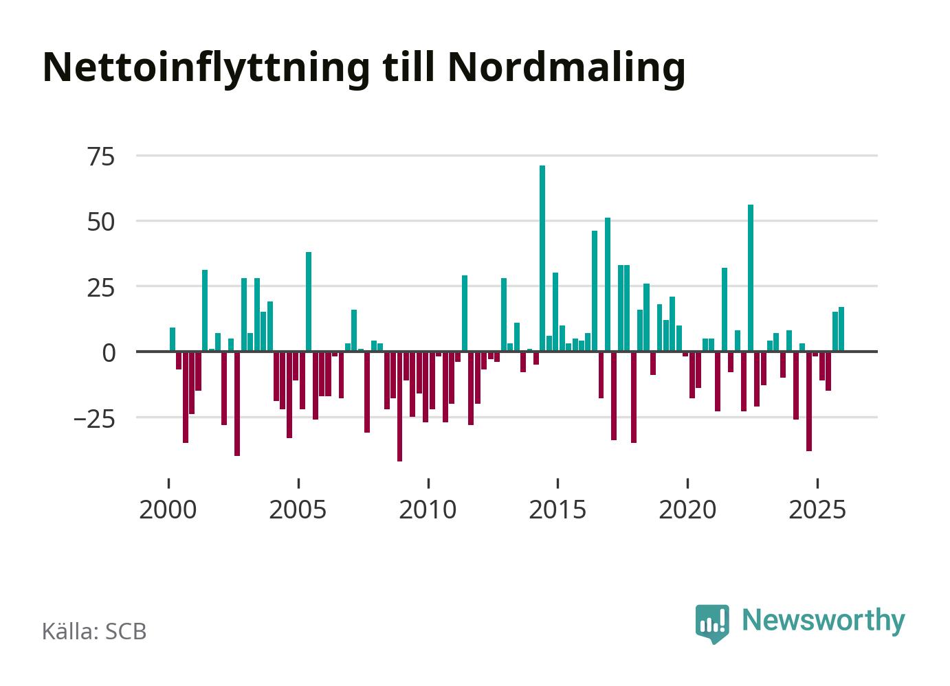 Under fjärde kvartalet 2025 flyttade 89 personer till kommunen medan 72 personer flyttade därifrån. Sedan seklets början har Nordmaling oftast haft ett positivt flyttnetto, inklusive det senaste kvartalet.