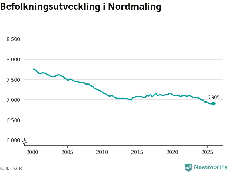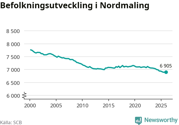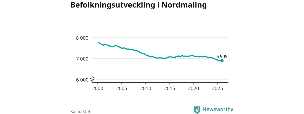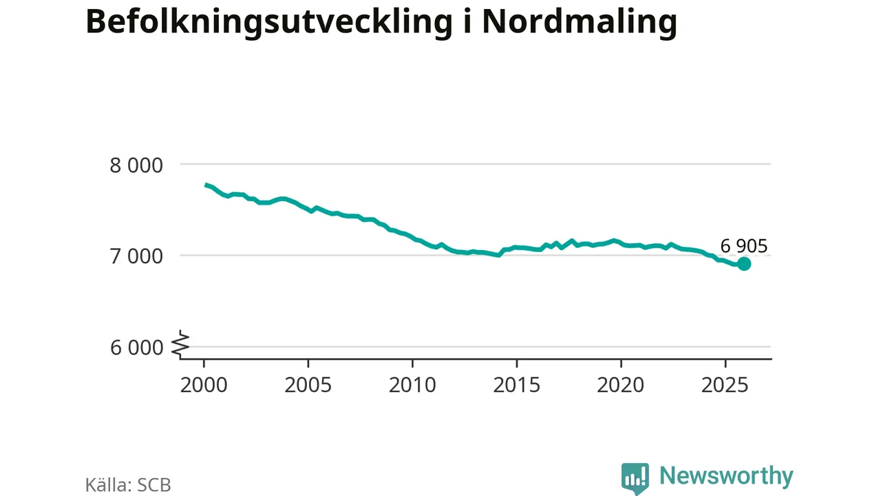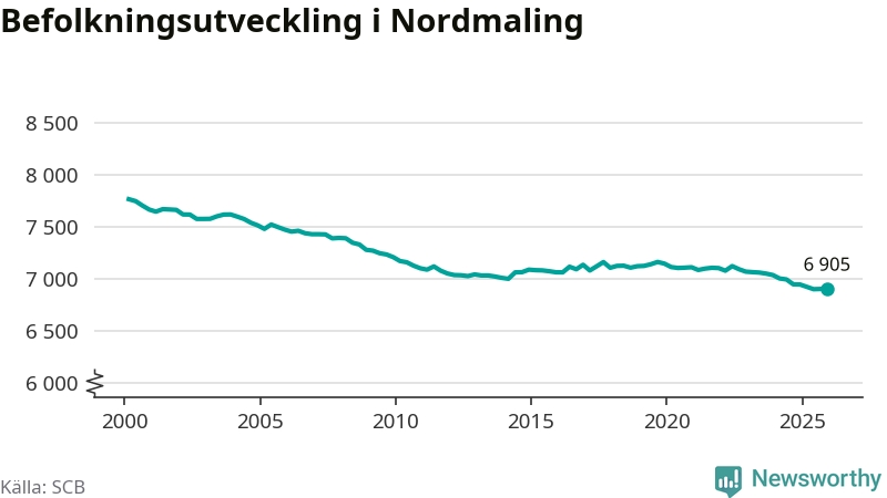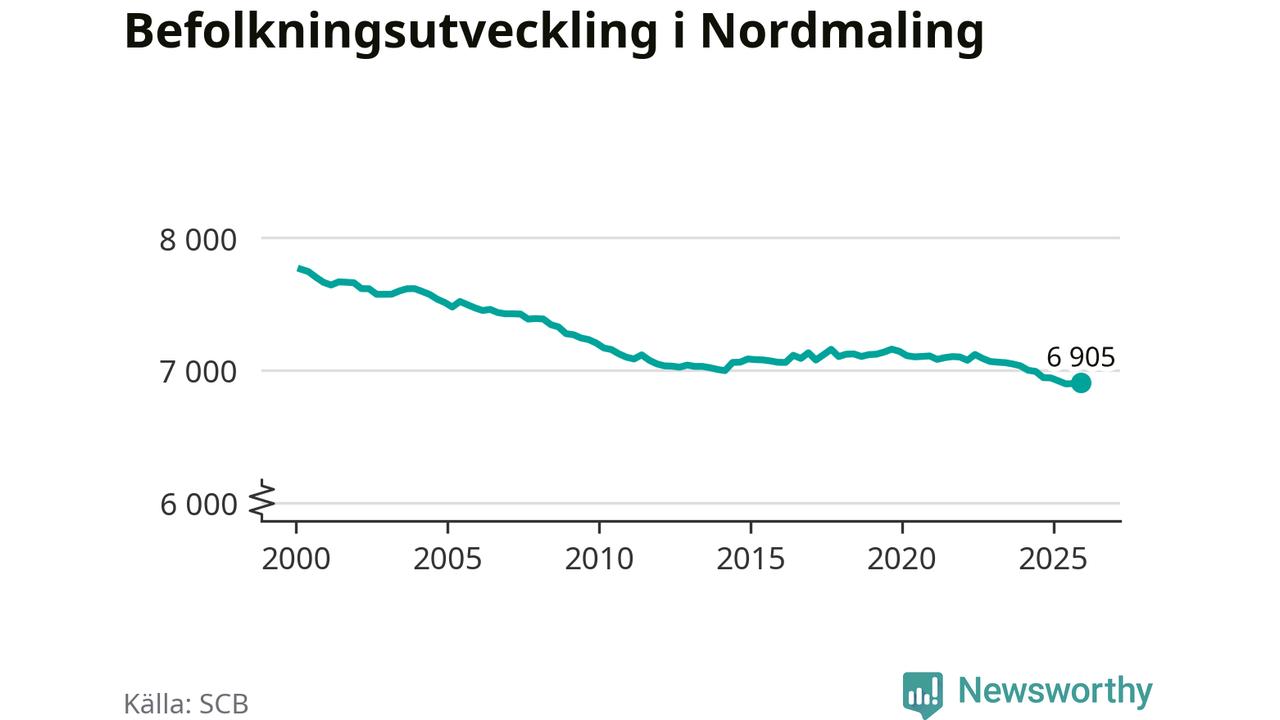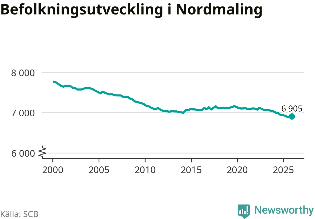 Jämfört med för ett år sedan har befolkningen i Nordmaling minskat med knappt 40 personer – vilket motsvarar en nedgång på 0,5 procent. Sedan millennieskiftet har folkmängden minskat med runt 860 personer, eller elva procent.