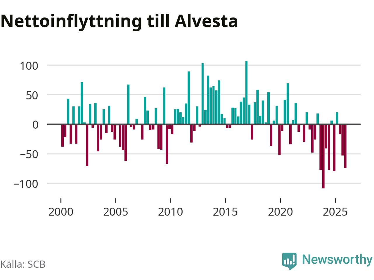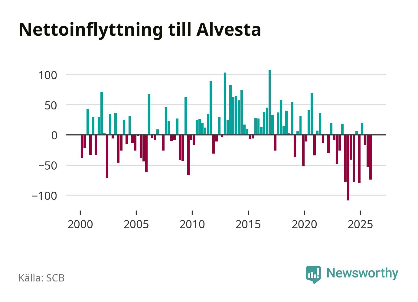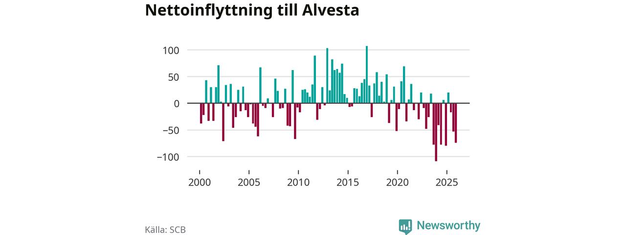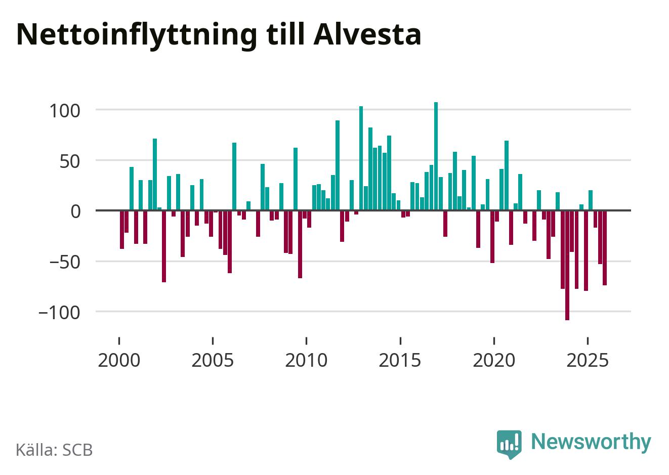 Under fjärde kvartalet 2025 flyttade 215 personer till kommunen medan 289 personer flyttade därifrån. Sedan seklets början har Alvesta haft ungefär lika många kvartal med positivt flyttnetto som negativt.