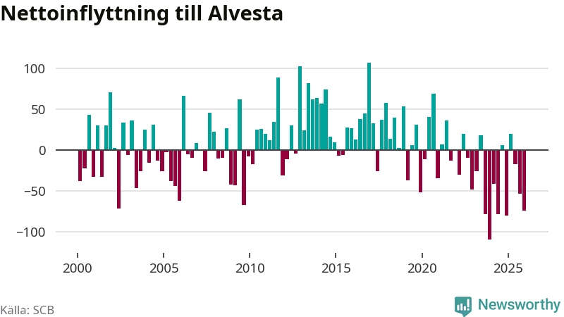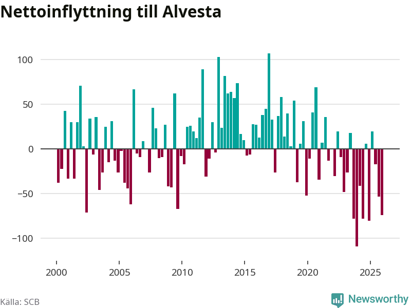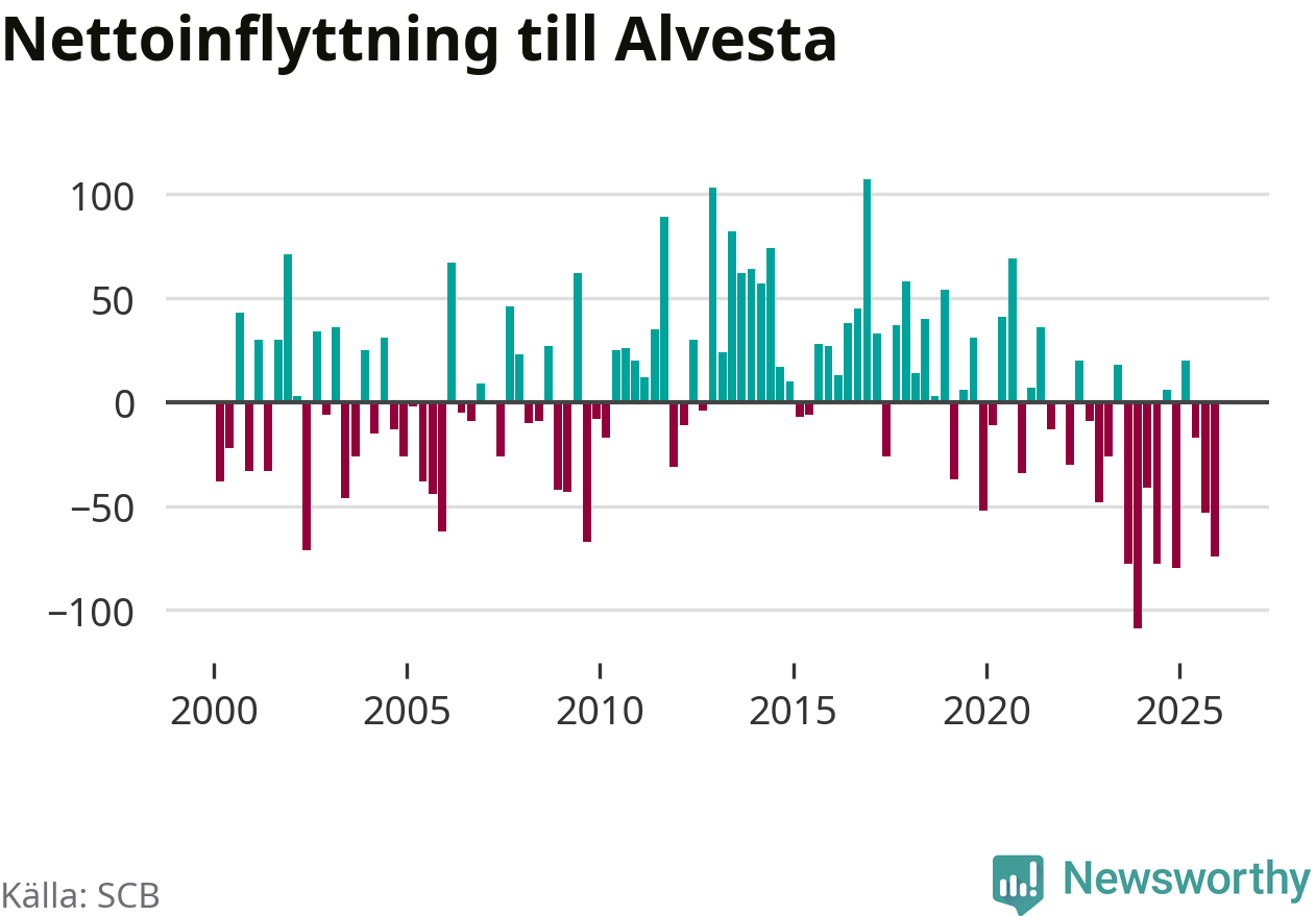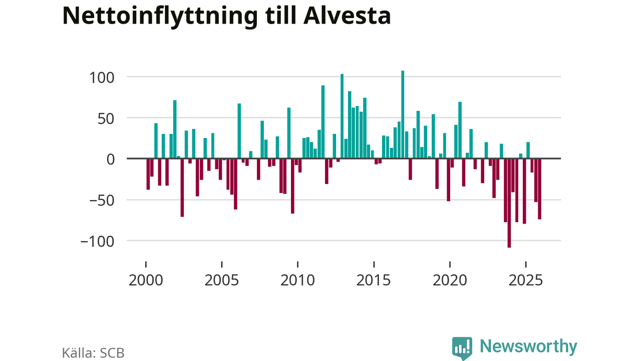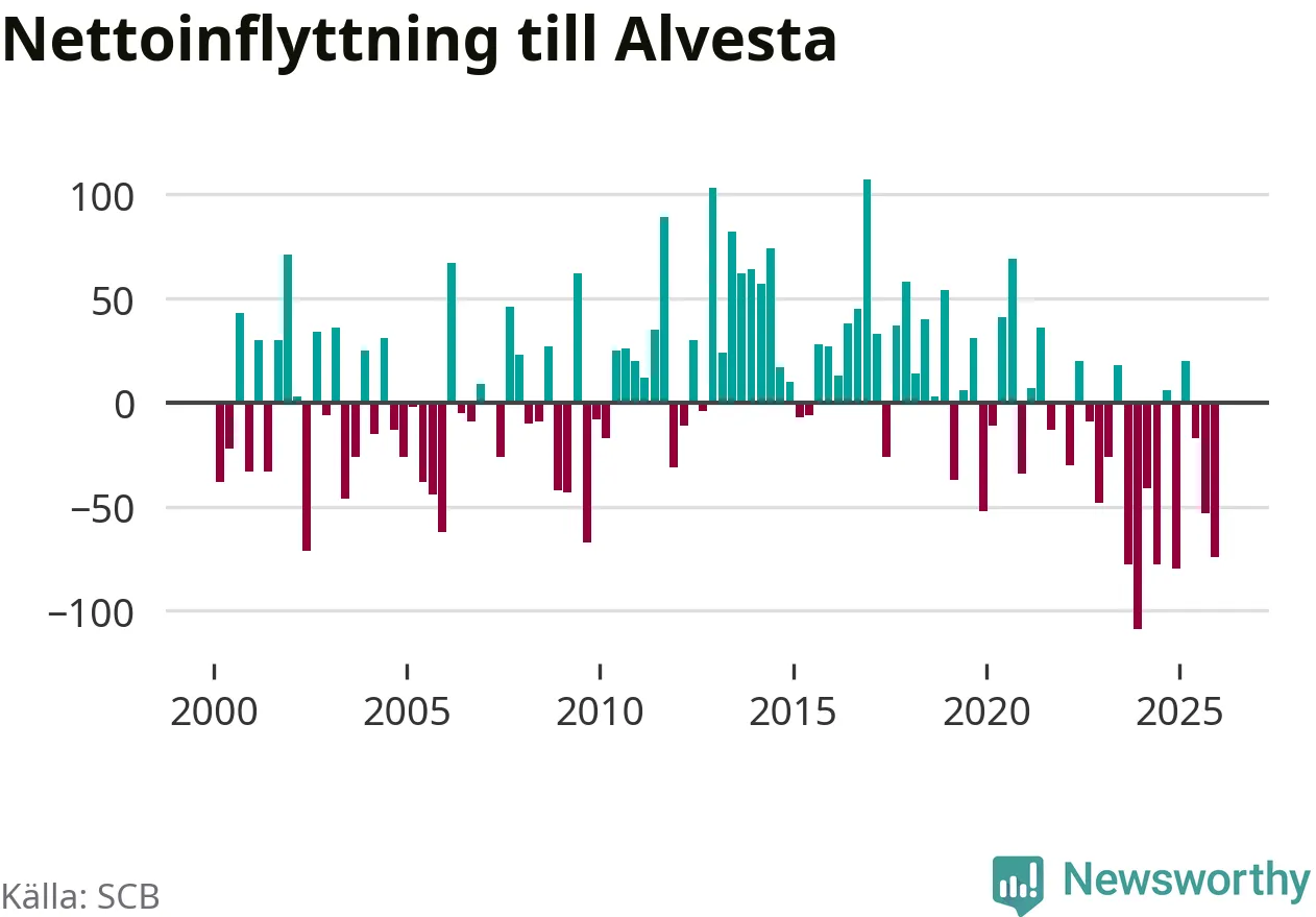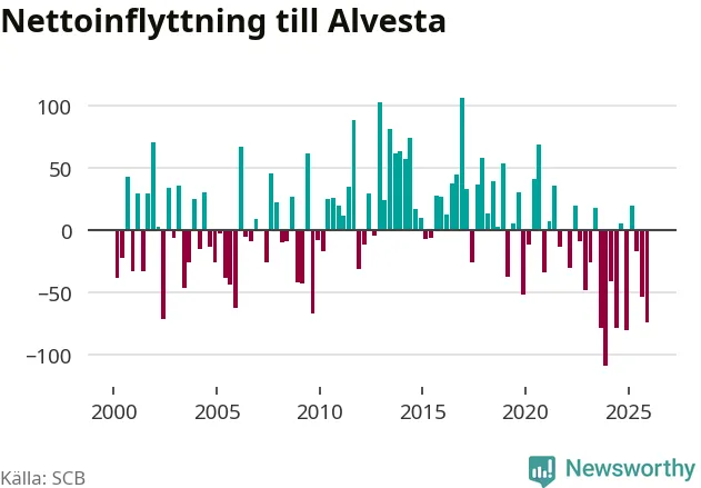 Under fjärde kvartalet 2025 flyttade 215 personer till kommunen medan 289 personer flyttade därifrån. Sedan seklets början har Alvesta haft ungefär lika många kvartal med positivt flyttnetto som negativt.