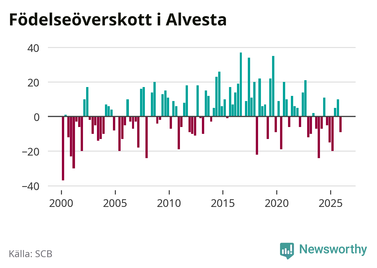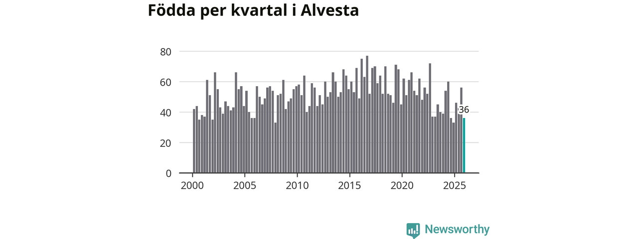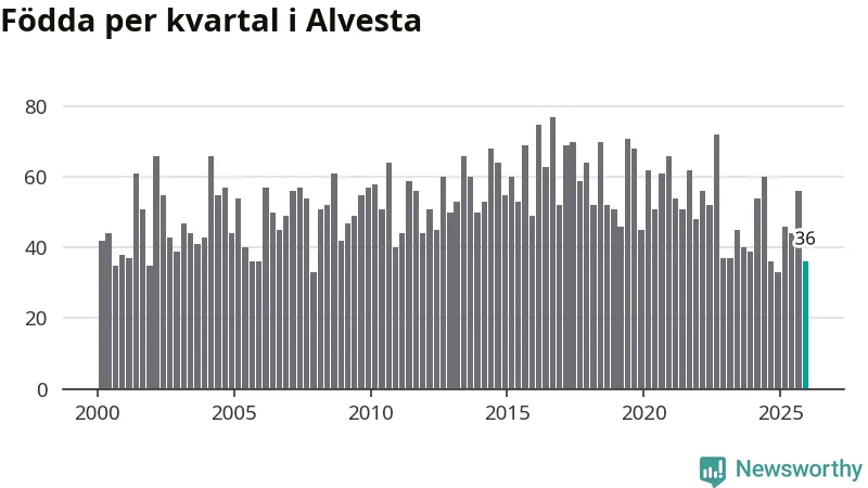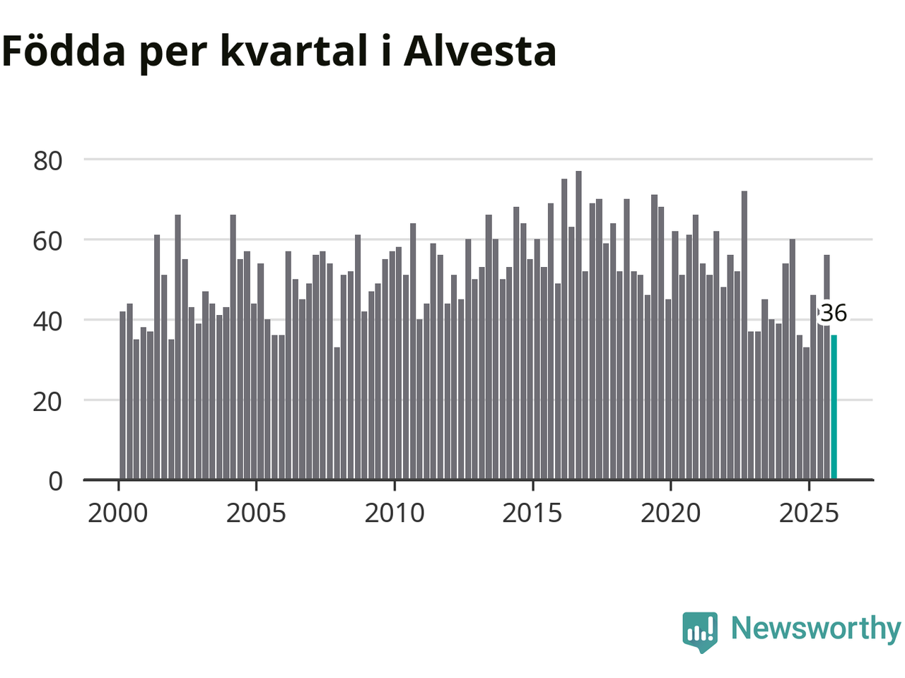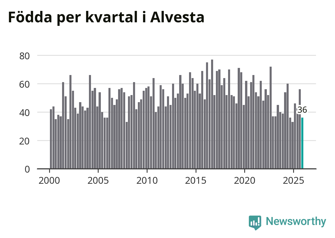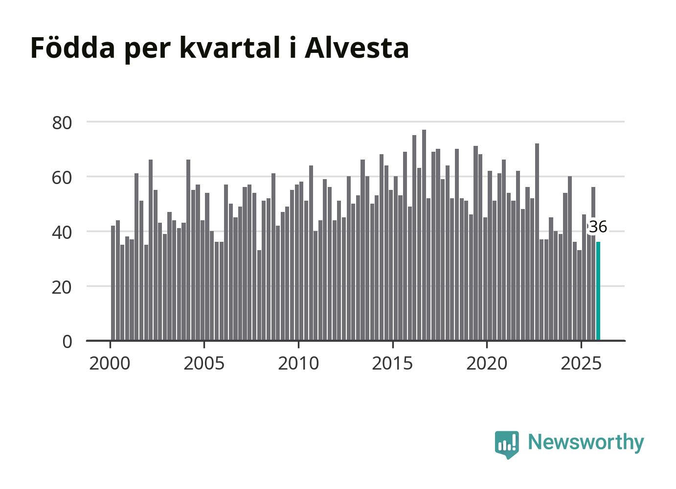 Enligt SCB:s siffror föddes 36 barn i Alvesta under det senaste kvartalet. Samtidigt avled 45 personer. Alvesta hade alltså ett negativt födelsenetto under fjärde kvartalet. Historiskt har dock födelsenettot oftast varit positivt.