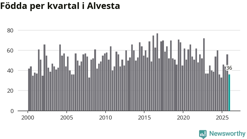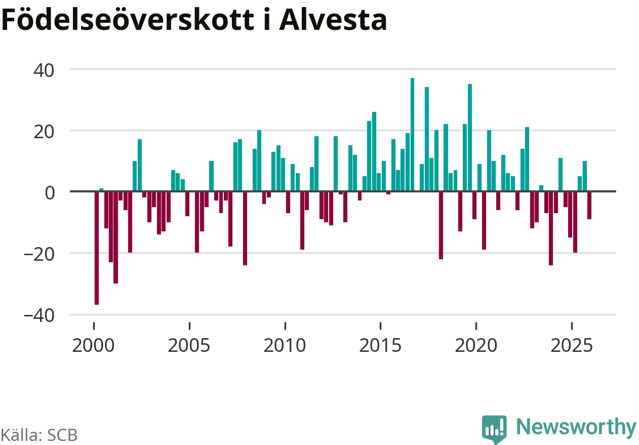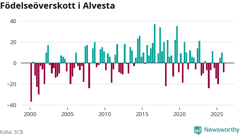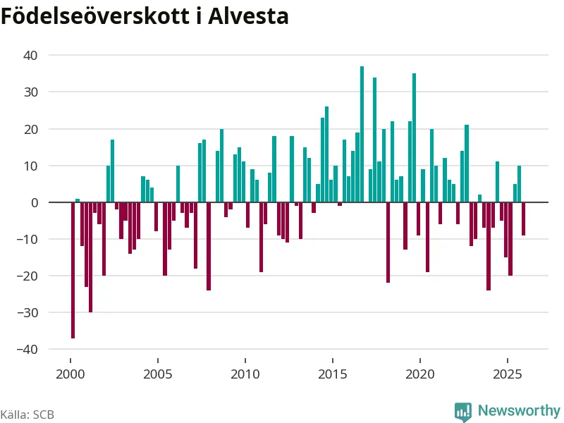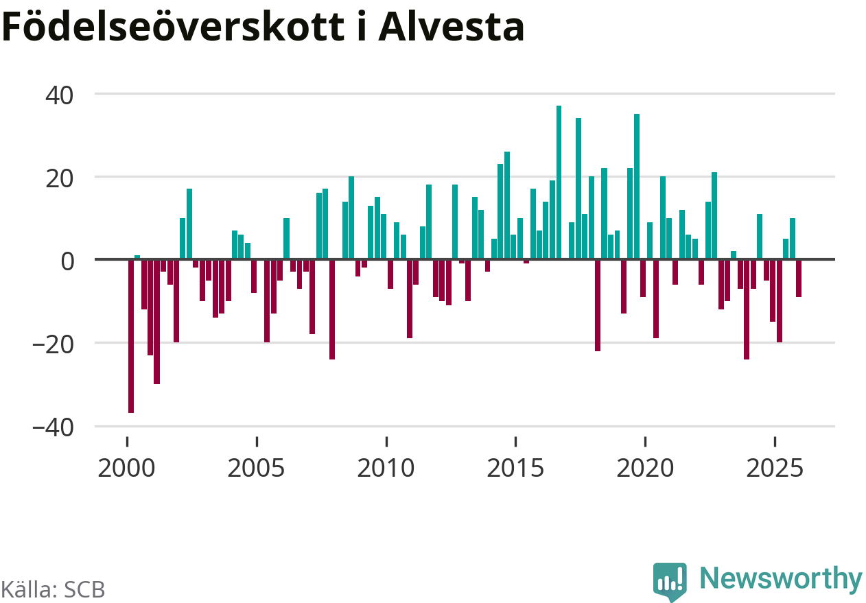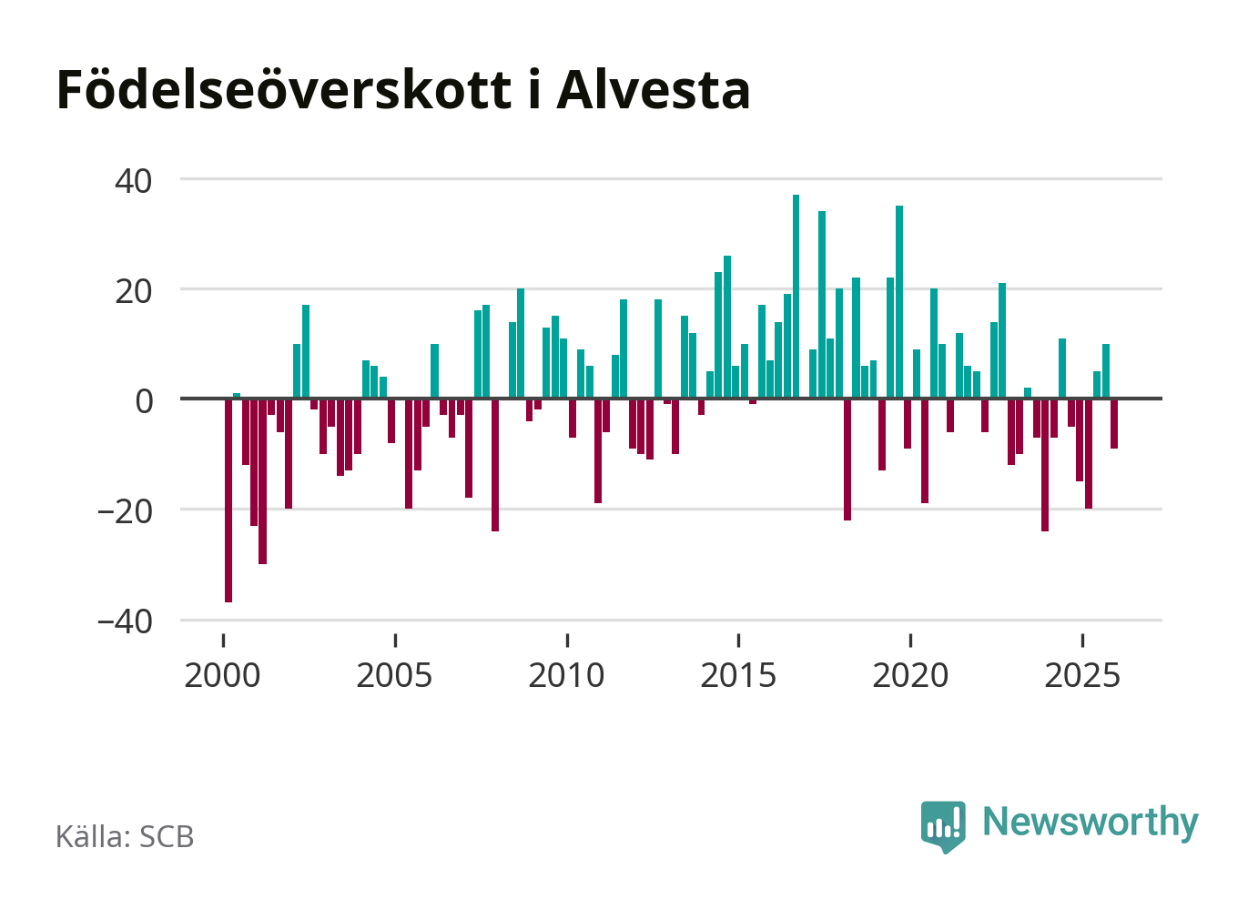 Enligt SCB:s siffror föddes 36 barn i Alvesta under det senaste kvartalet. Samtidigt avled 45 personer. Alvesta hade alltså ett negativt födelsenetto under fjärde kvartalet. Historiskt har dock födelsenettot oftast varit positivt.