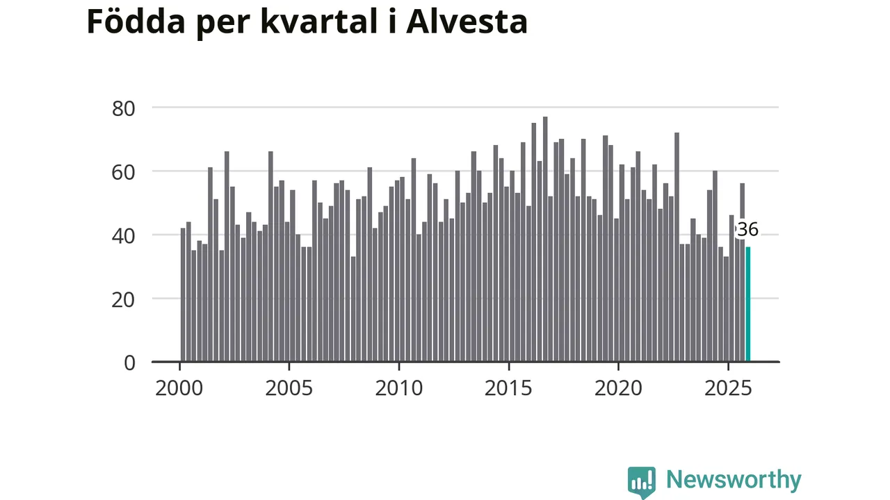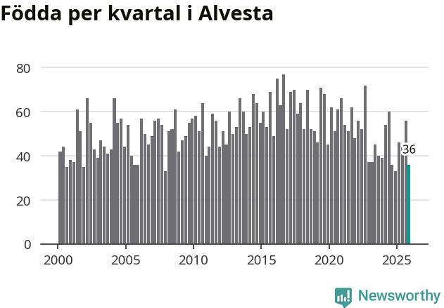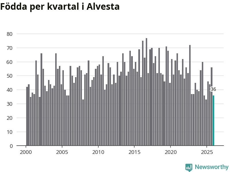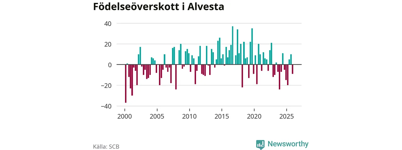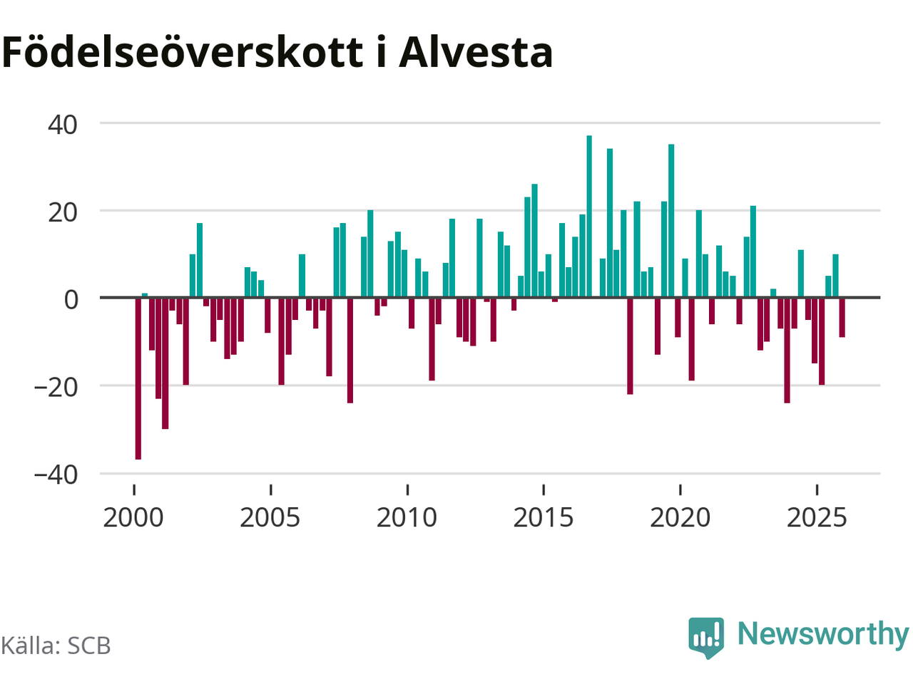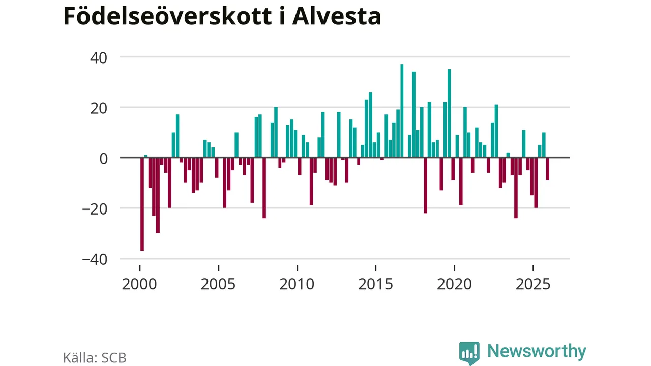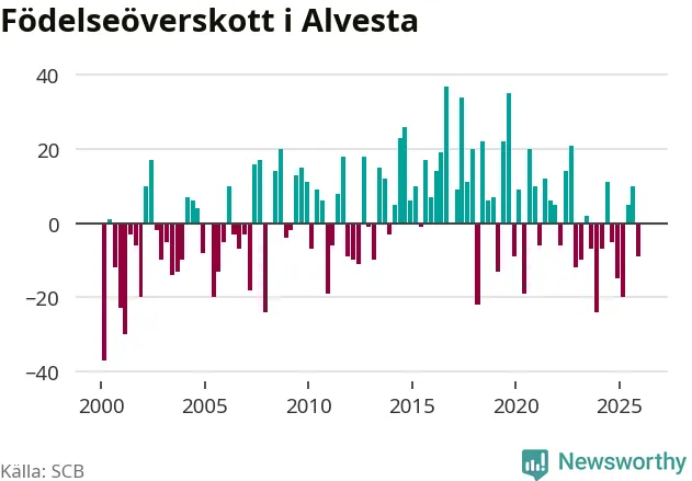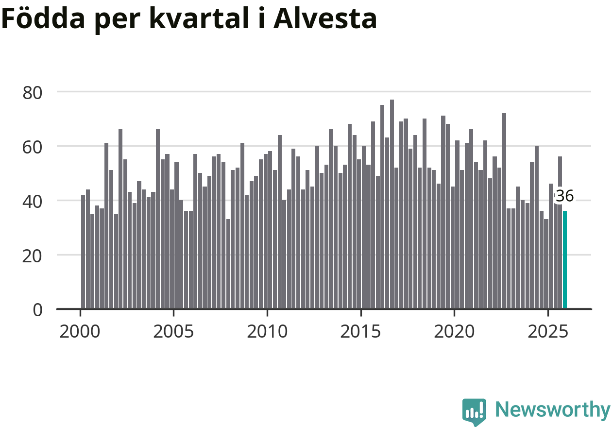 Enligt SCB:s siffror föddes 36 barn i Alvesta under det senaste kvartalet. Samtidigt avled 45 personer. Alvesta hade alltså ett negativt födelsenetto under fjärde kvartalet. Historiskt har dock födelsenettot oftast varit positivt.