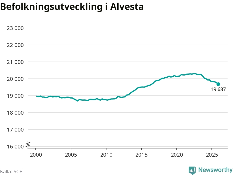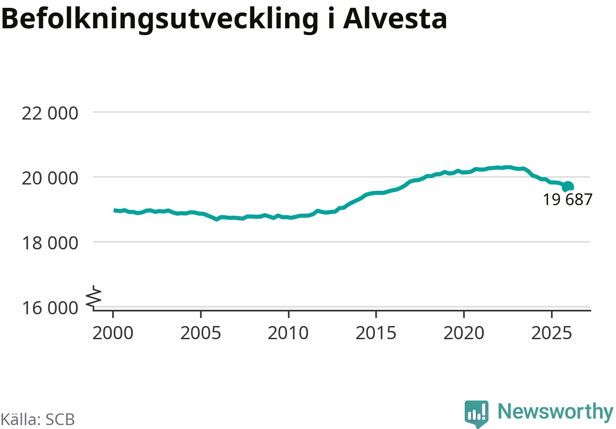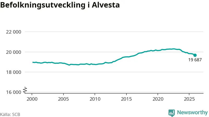 Jämfört med för ett år sedan har befolkningen i Alvesta minskat med ungefär 140 personer – vilket motsvarar en nedgång på 0,7 procent. Sedan millennieskiftet har folkmängden ökat med runt 730 personer, eller fyra procent.