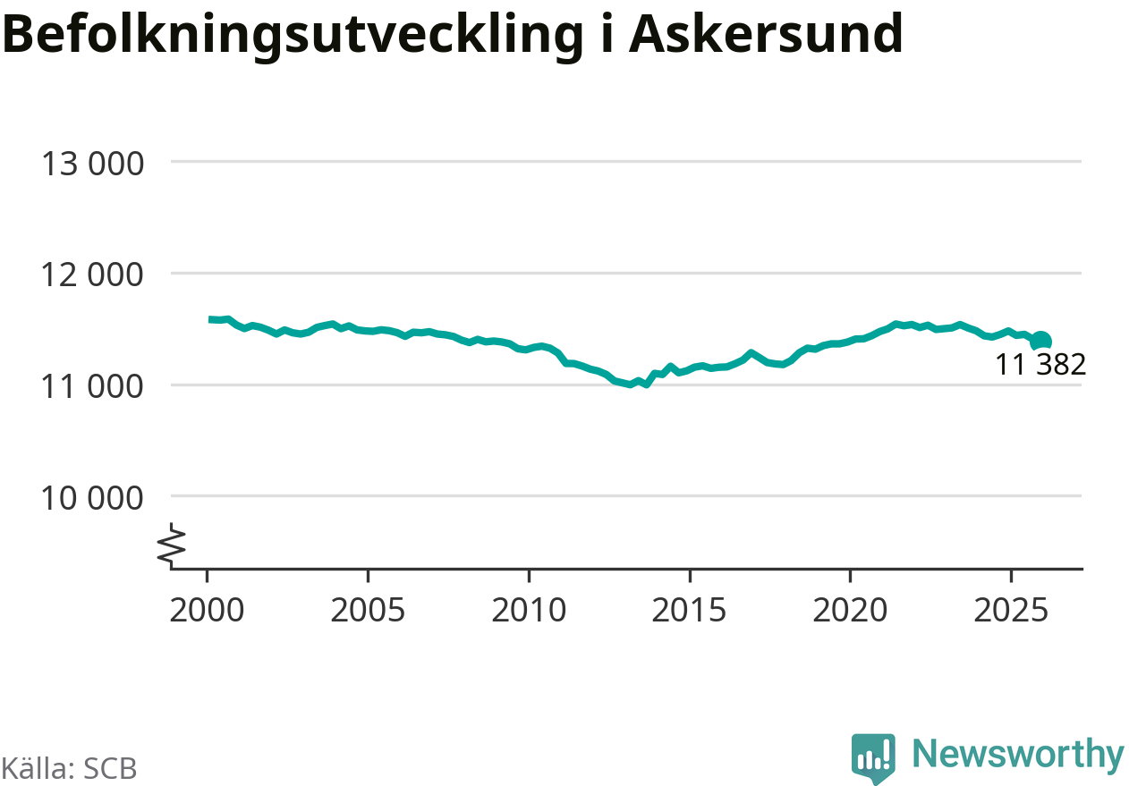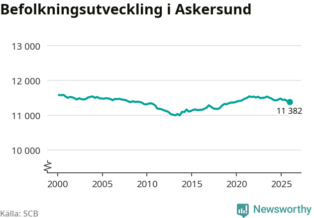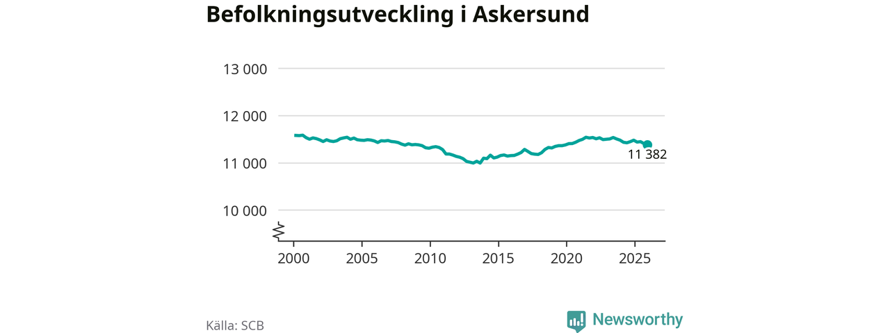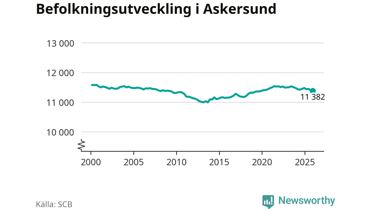 Befolkningen minskade i Askersunds kommun under det fjärde kvartalet 2025. Den 31 december bodde enligt SCB:s senaste siffror 11 382 personer i kommunen, vilket är 23 färre än i slutet av tredje kvartalet.