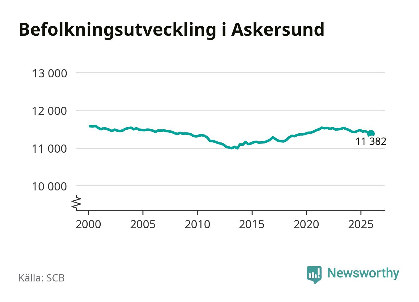 Jämfört med för ett år sedan har befolkningen i Askersund minskat med knappt 100 personer – vilket motsvarar en nedgång på 0,8 procent. Sedan millennieskiftet har folkmängden minskat med runt 200 personer, eller två procent.