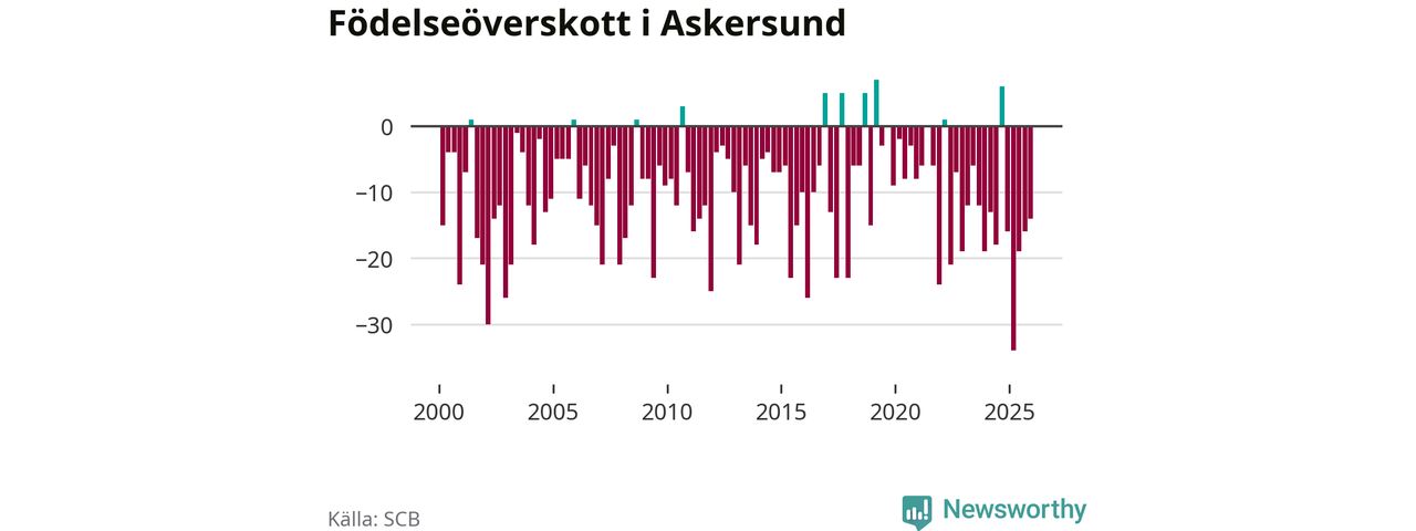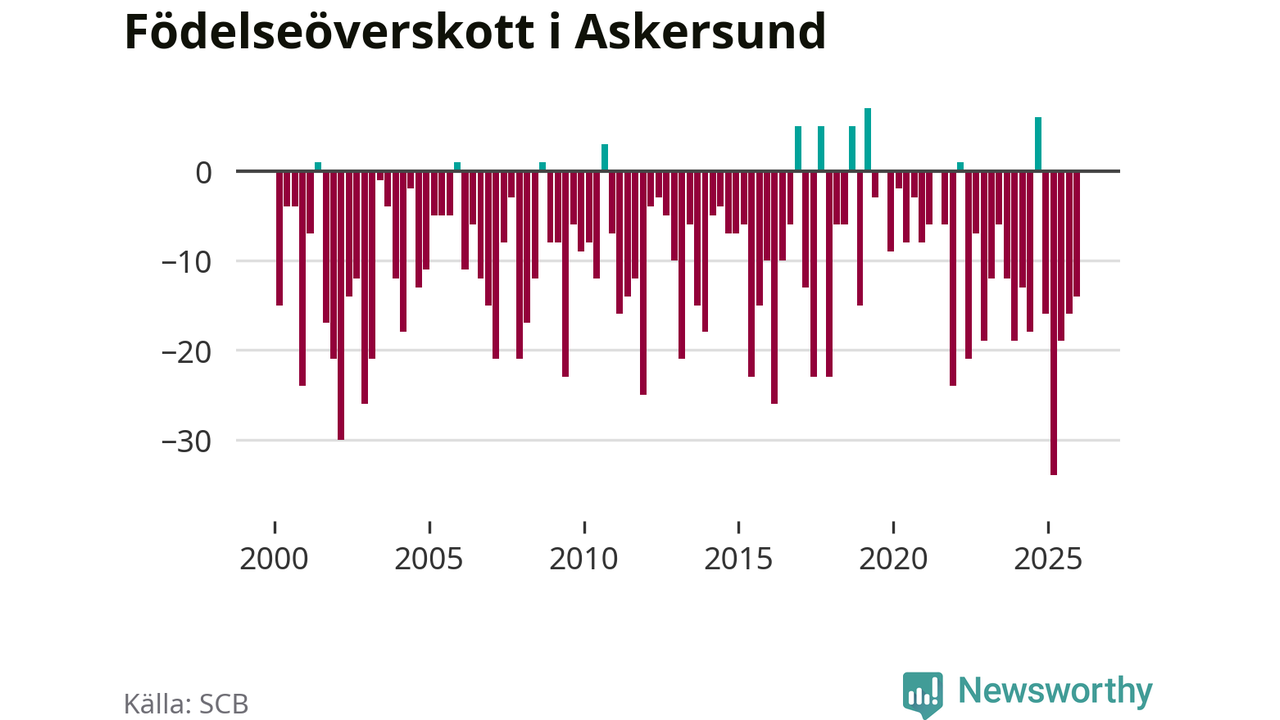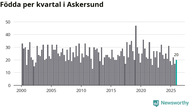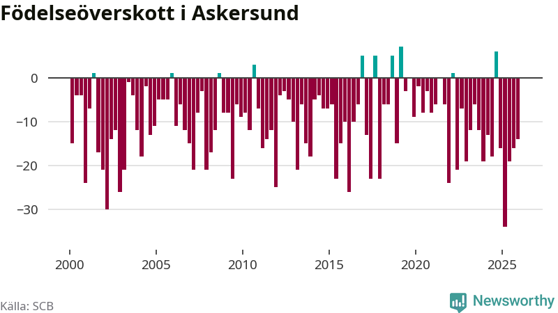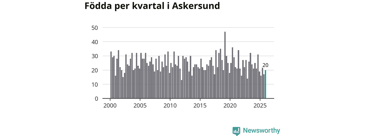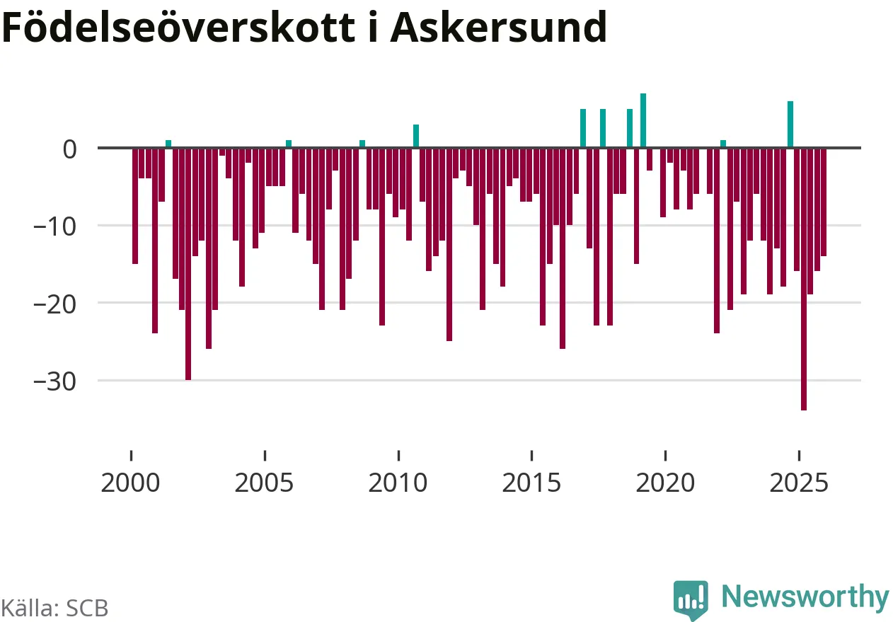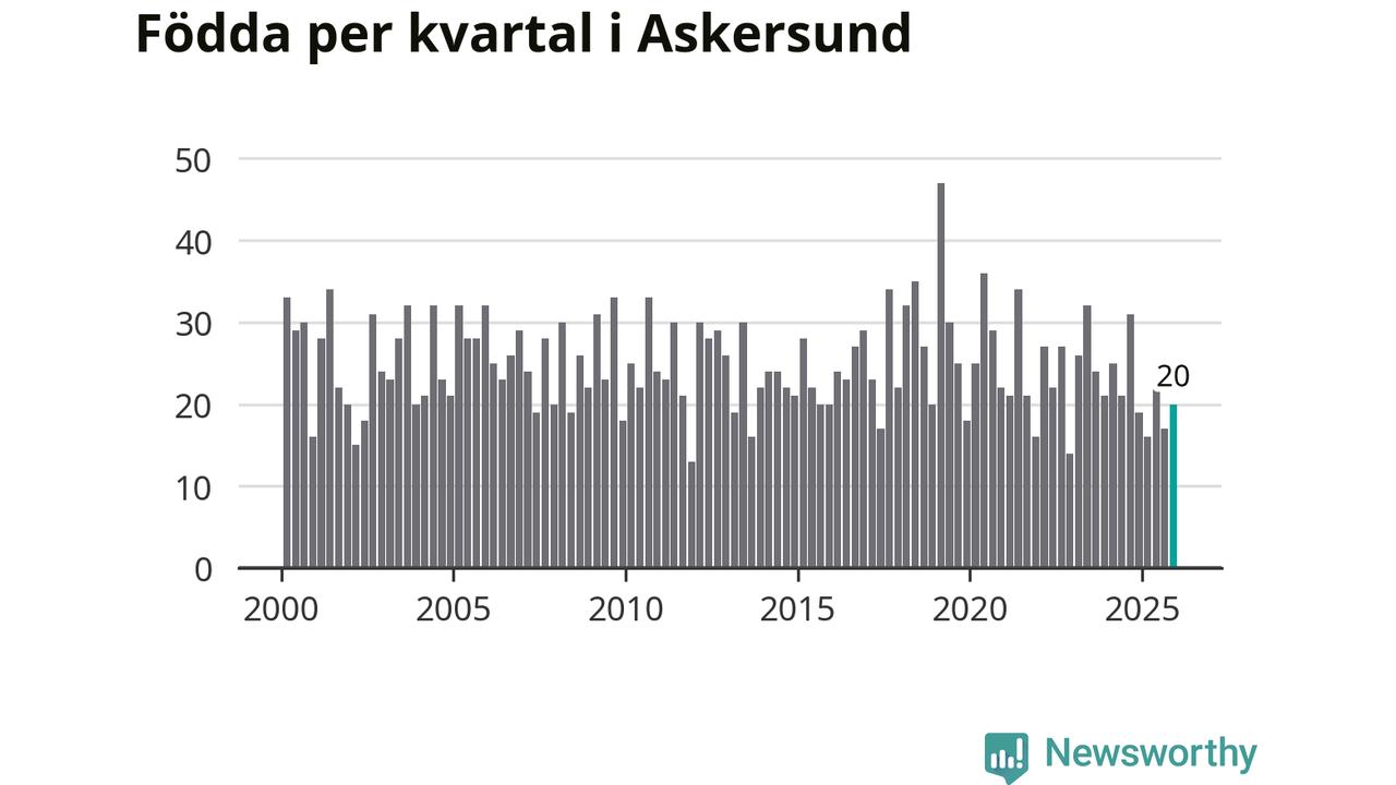 Enligt SCB:s siffror föddes 20 barn i Askersund under det senaste kvartalet. Samtidigt avled 34 personer. Askersund hade alltså ett negativt födelsenetto, vilket kommunen historiskt sett nästan alltid har haft.