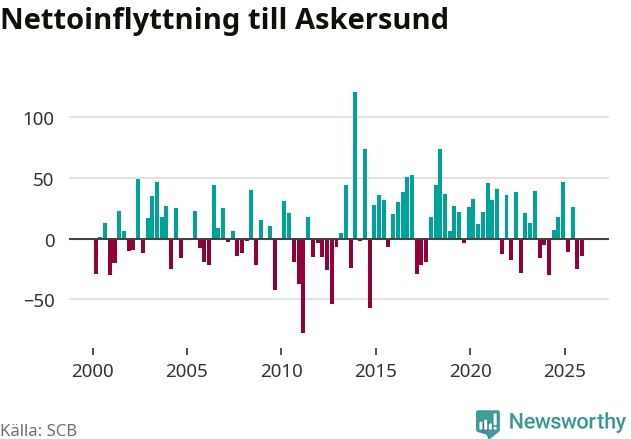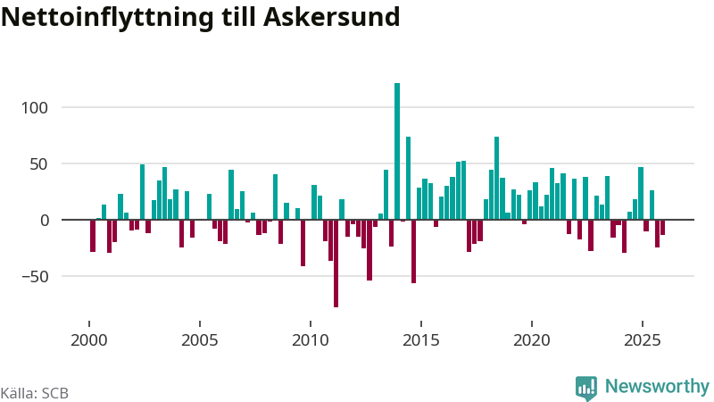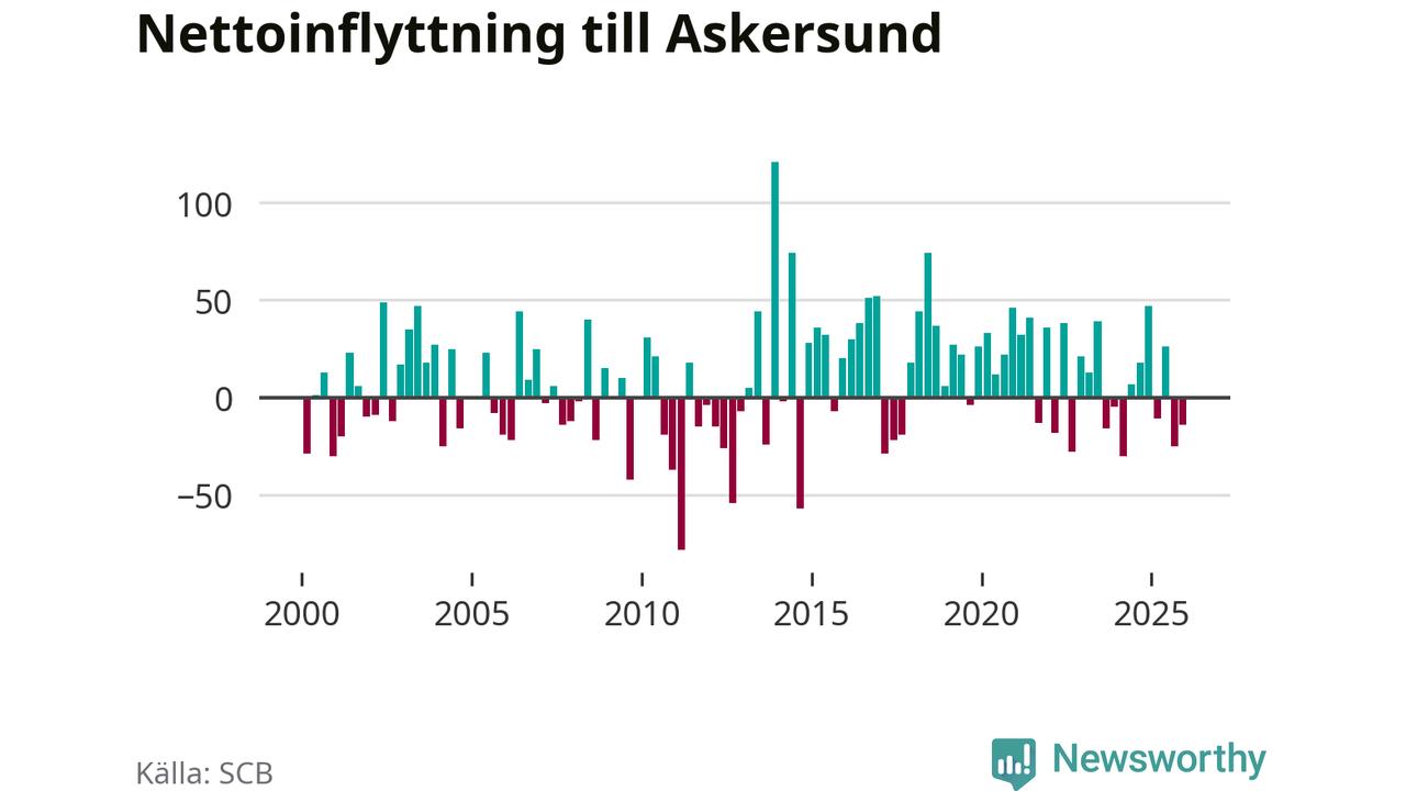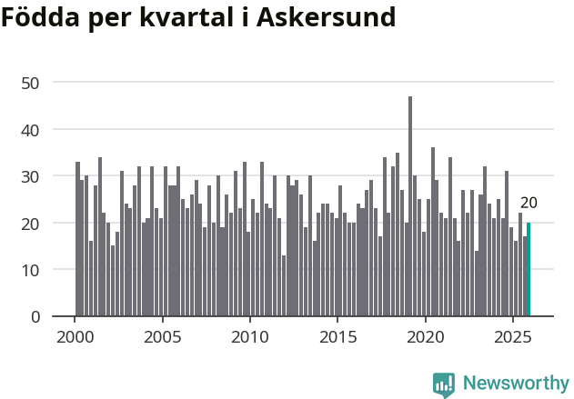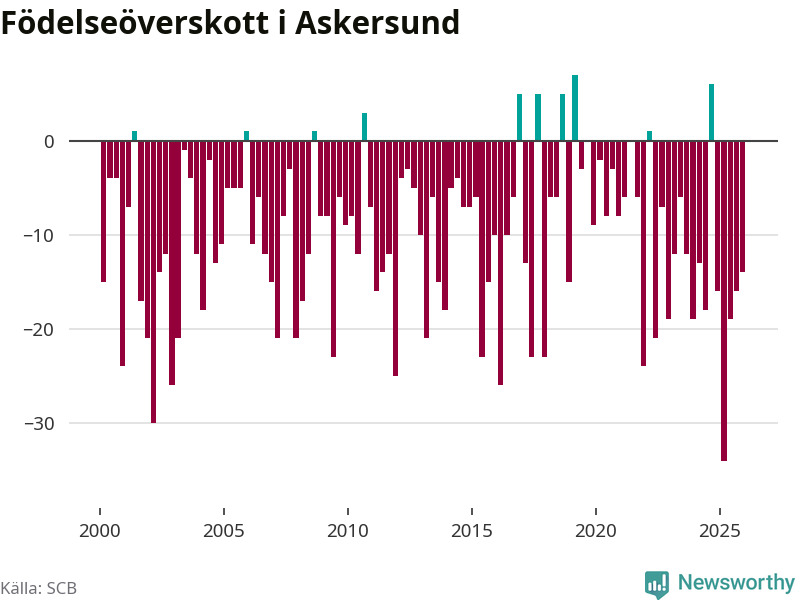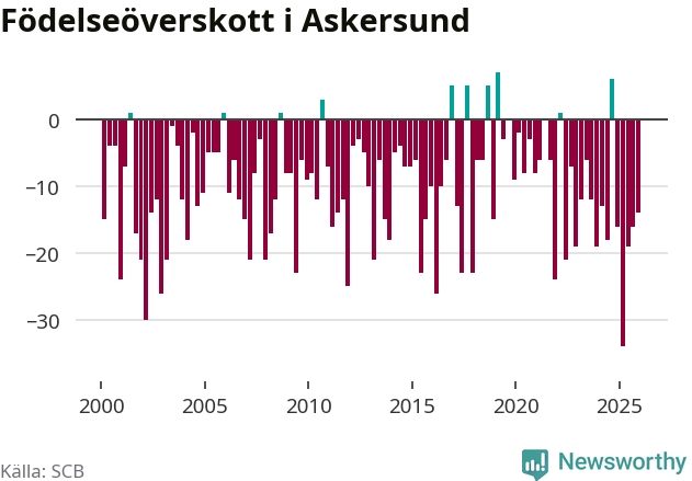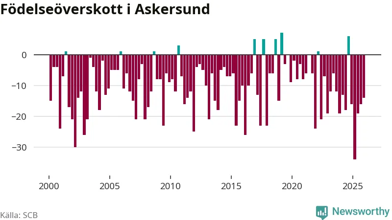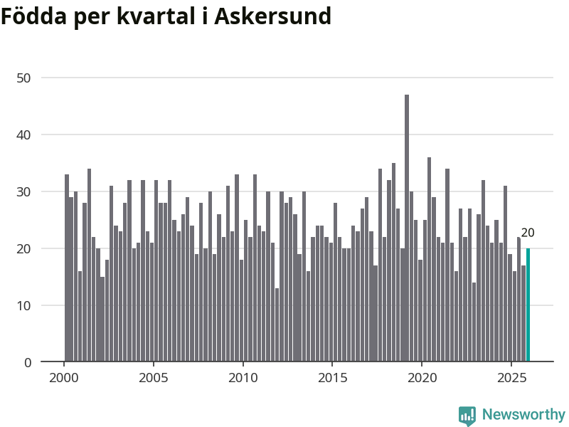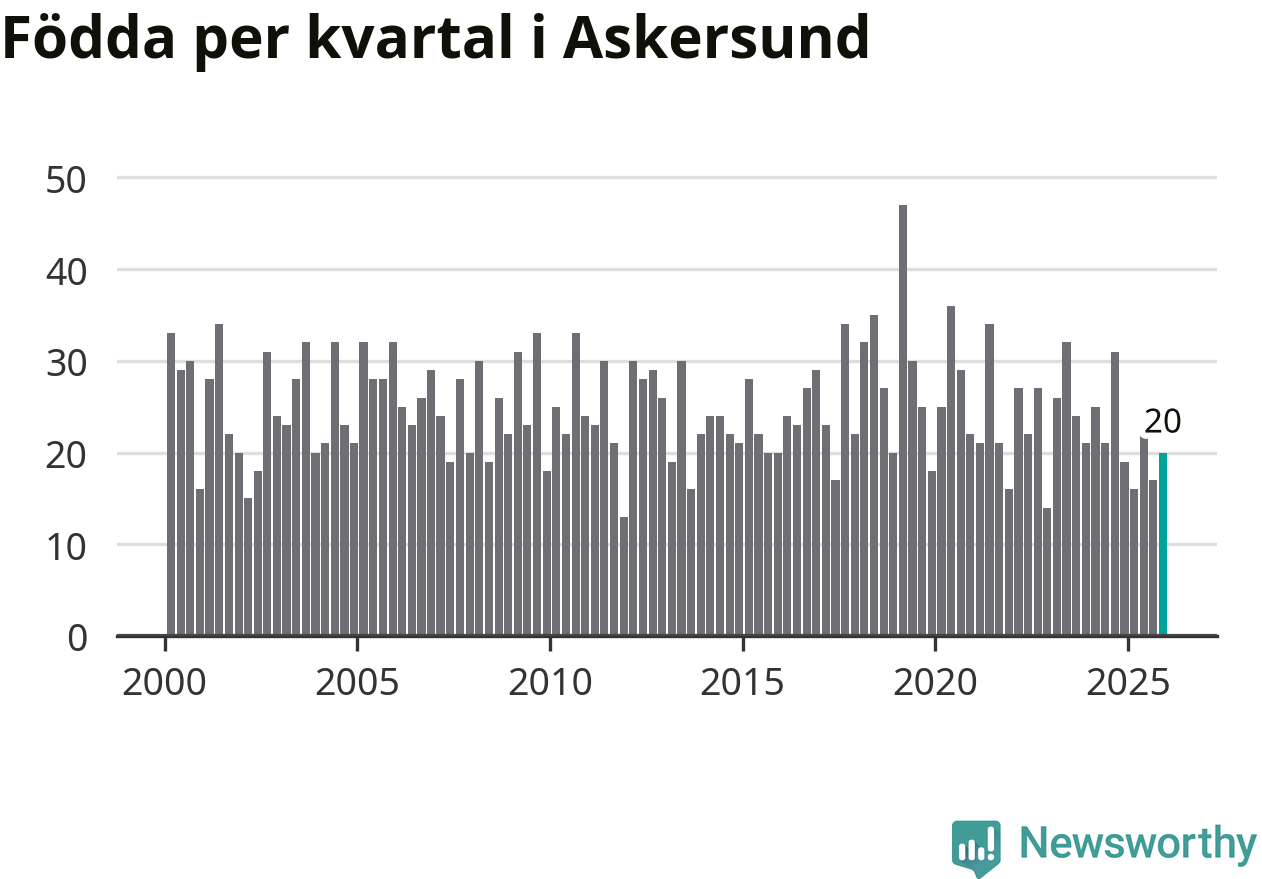 Enligt SCB:s siffror föddes 20 barn i Askersund under det senaste kvartalet. Samtidigt avled 34 personer. Askersund hade alltså ett negativt födelsenetto, vilket kommunen historiskt sett nästan alltid har haft.