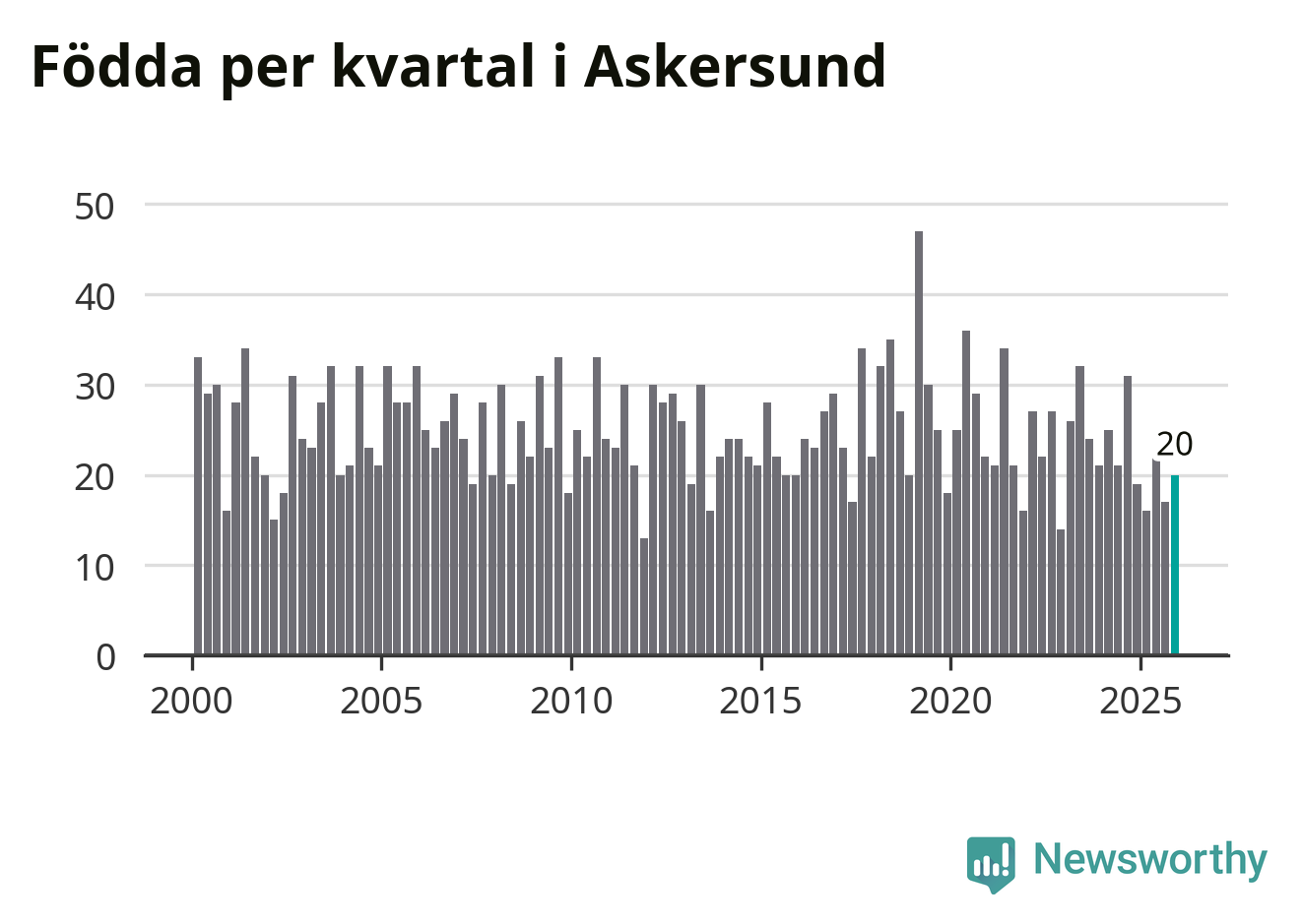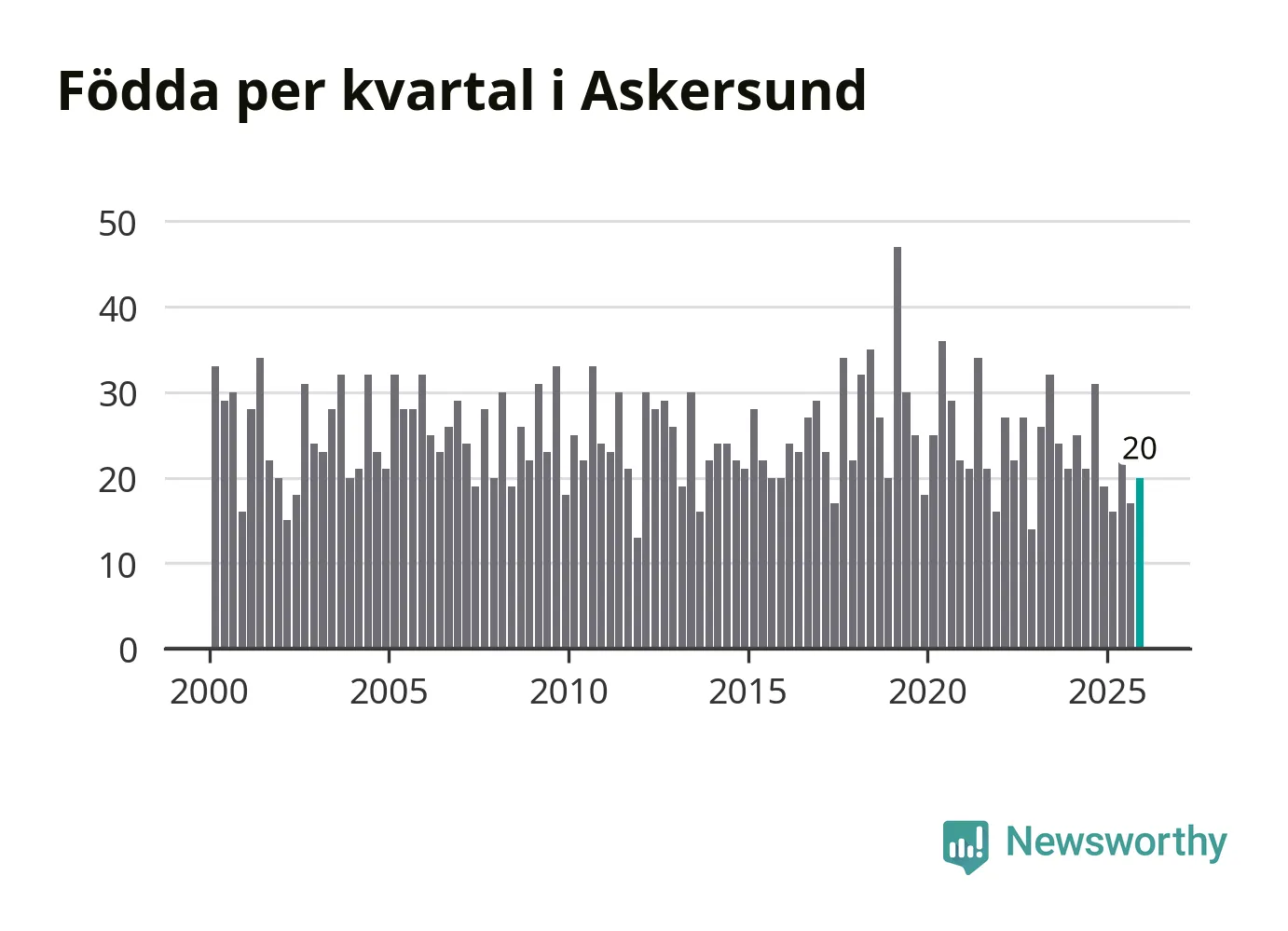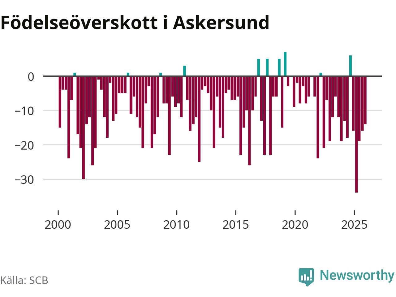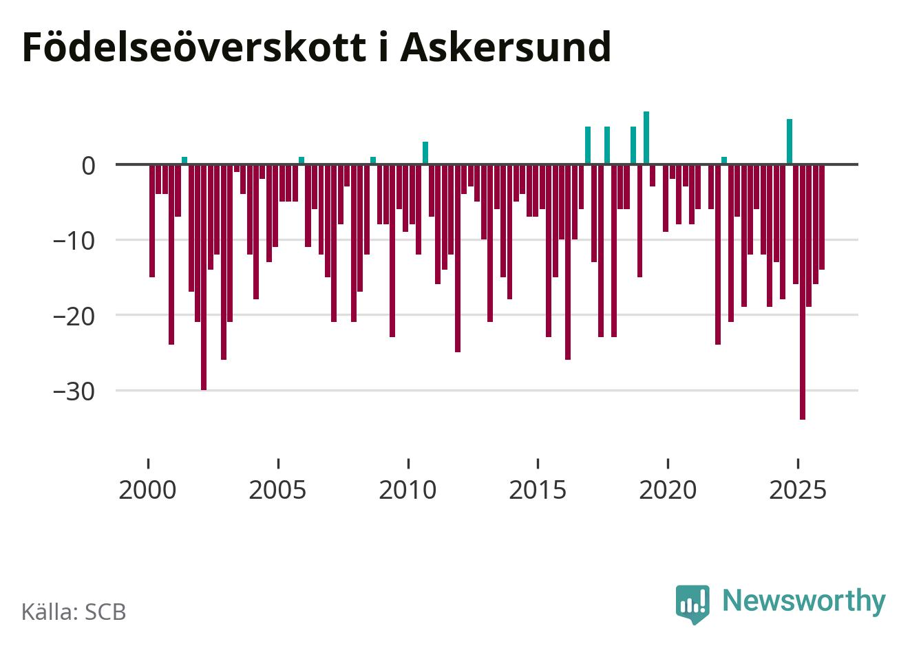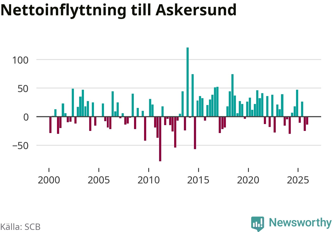 Enligt SCB:s siffror föddes 20 barn i Askersund under det senaste kvartalet. Samtidigt avled 34 personer. Askersund hade alltså ett negativt födelsenetto, vilket kommunen historiskt sett nästan alltid har haft.