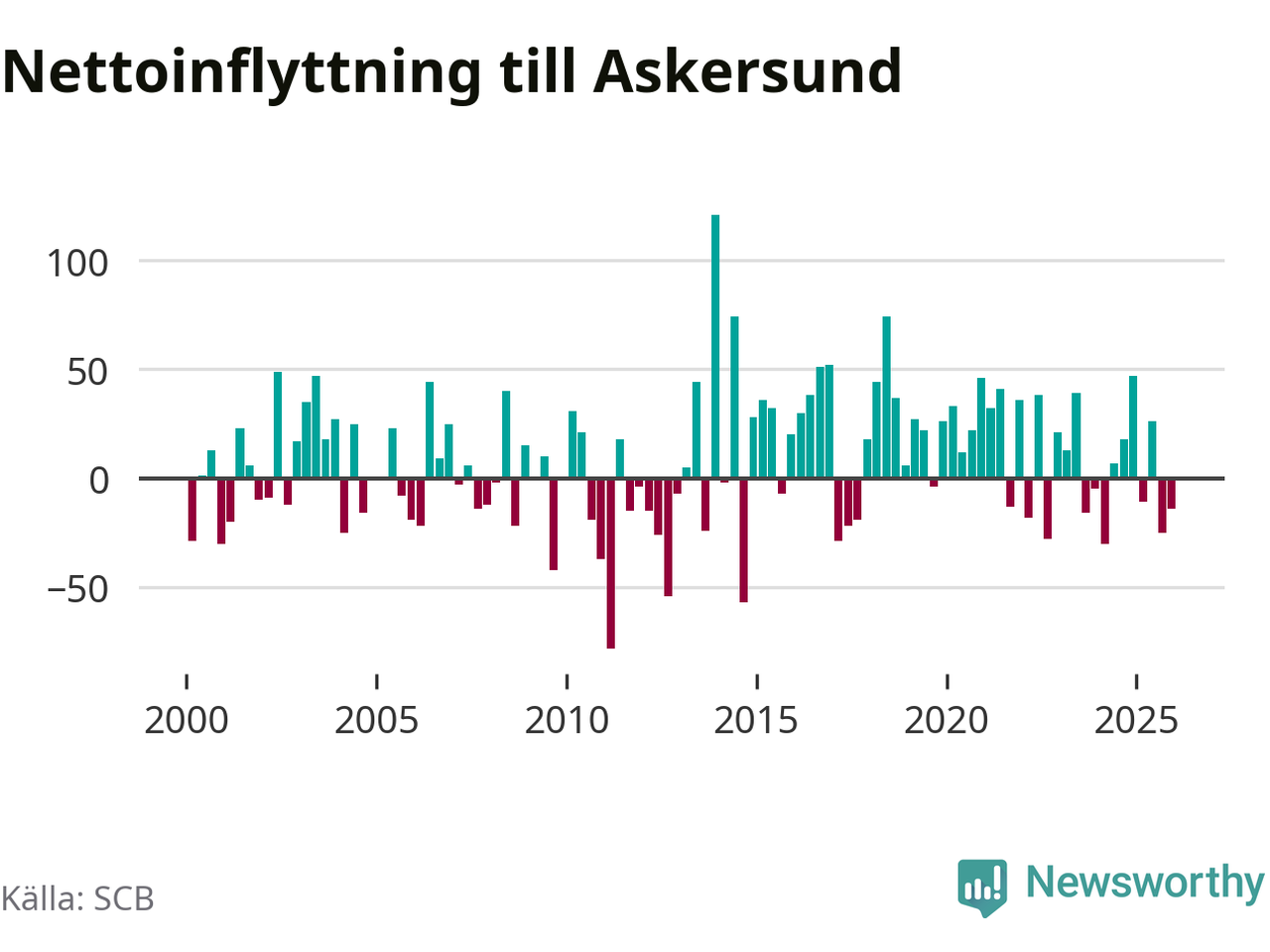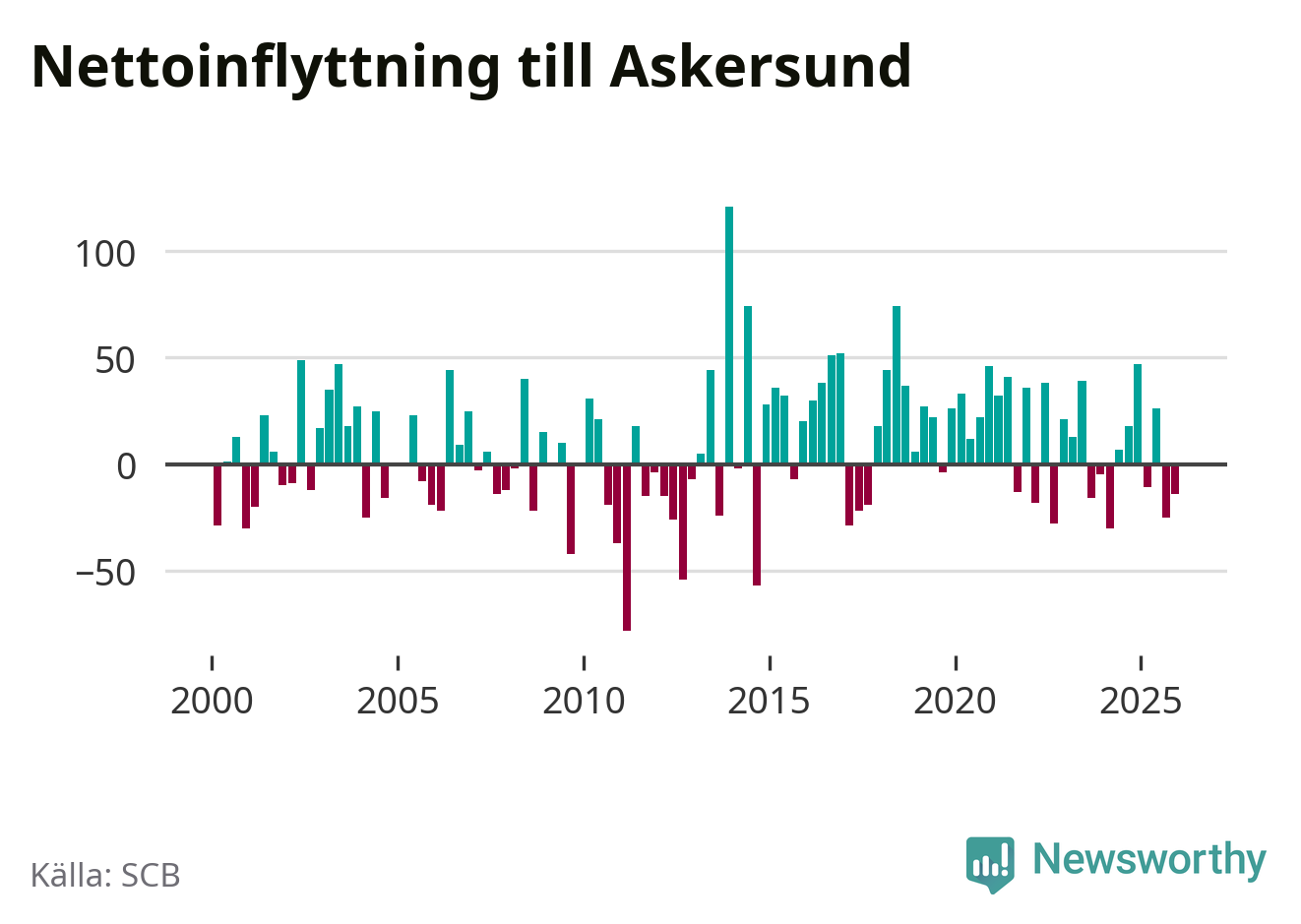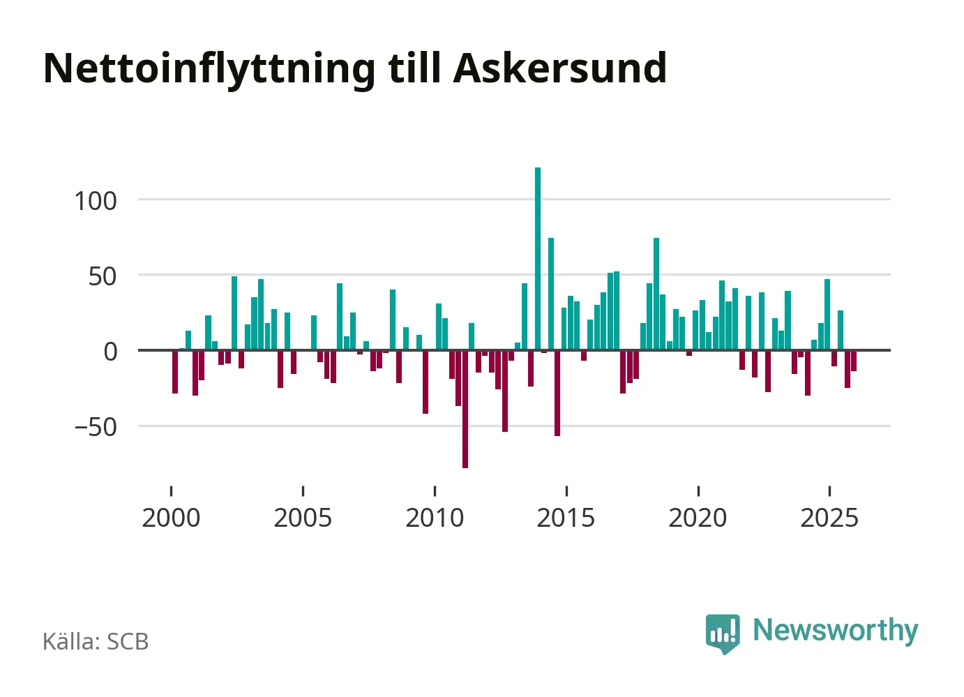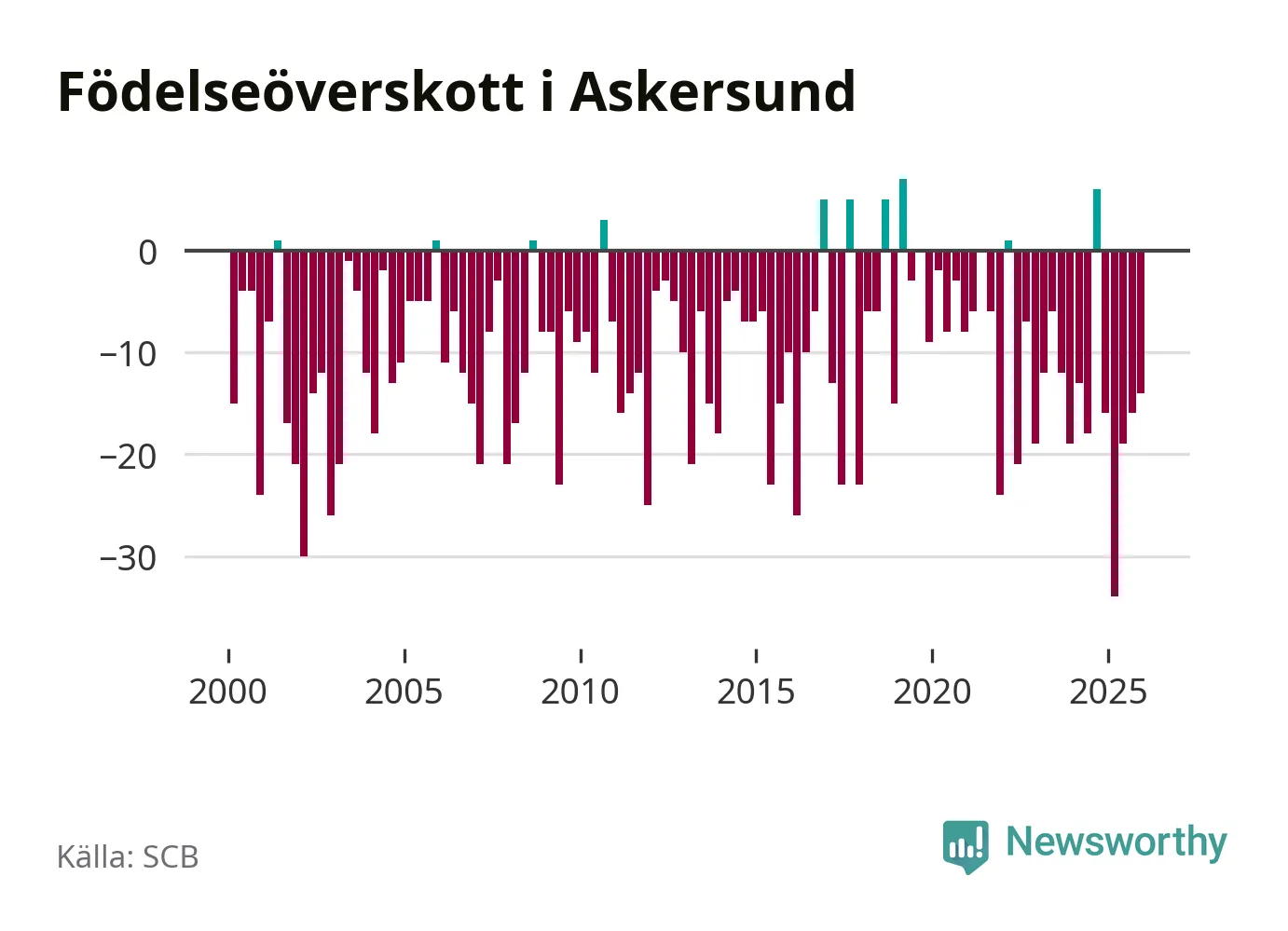Enligt SCB:s siffror föddes 20 barn i Askersund under det senaste kvartalet. Samtidigt avled 34 personer. Askersund hade alltså ett negativt födelsenetto, vilket kommunen historiskt sett nästan alltid har haft.