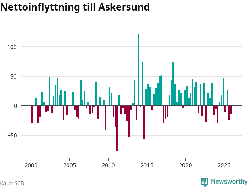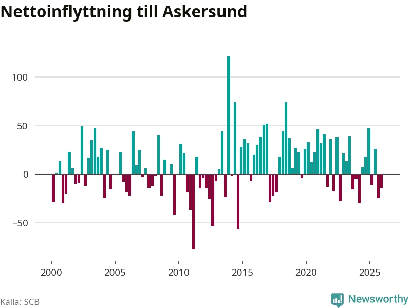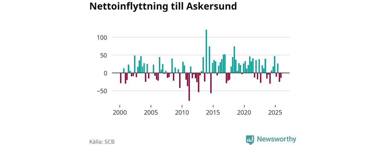Under fjärde kvartalet 2025 flyttade 132 personer till kommunen medan 146 personer flyttade därifrån. Sedan seklets början har Askersund oftast haft ett positivt flyttnetto.