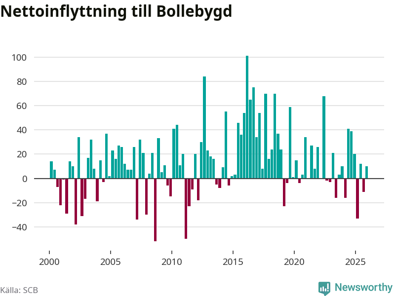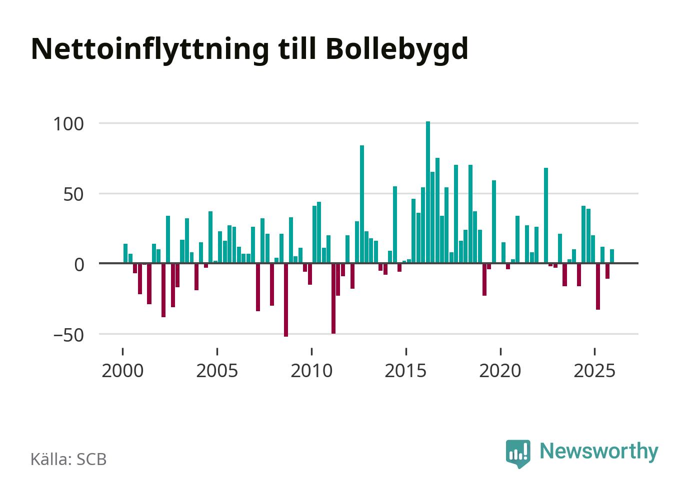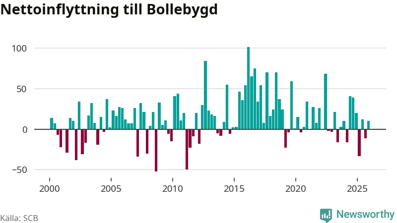 Under fjärde kvartalet 2025 flyttade 126 personer till kommunen medan 116 personer flyttade därifrån. Sedan seklets början har Bollebygd oftast haft ett positivt flyttnetto, inklusive det senaste kvartalet.