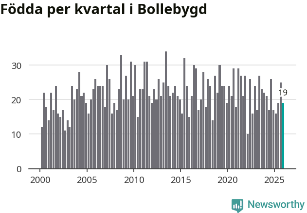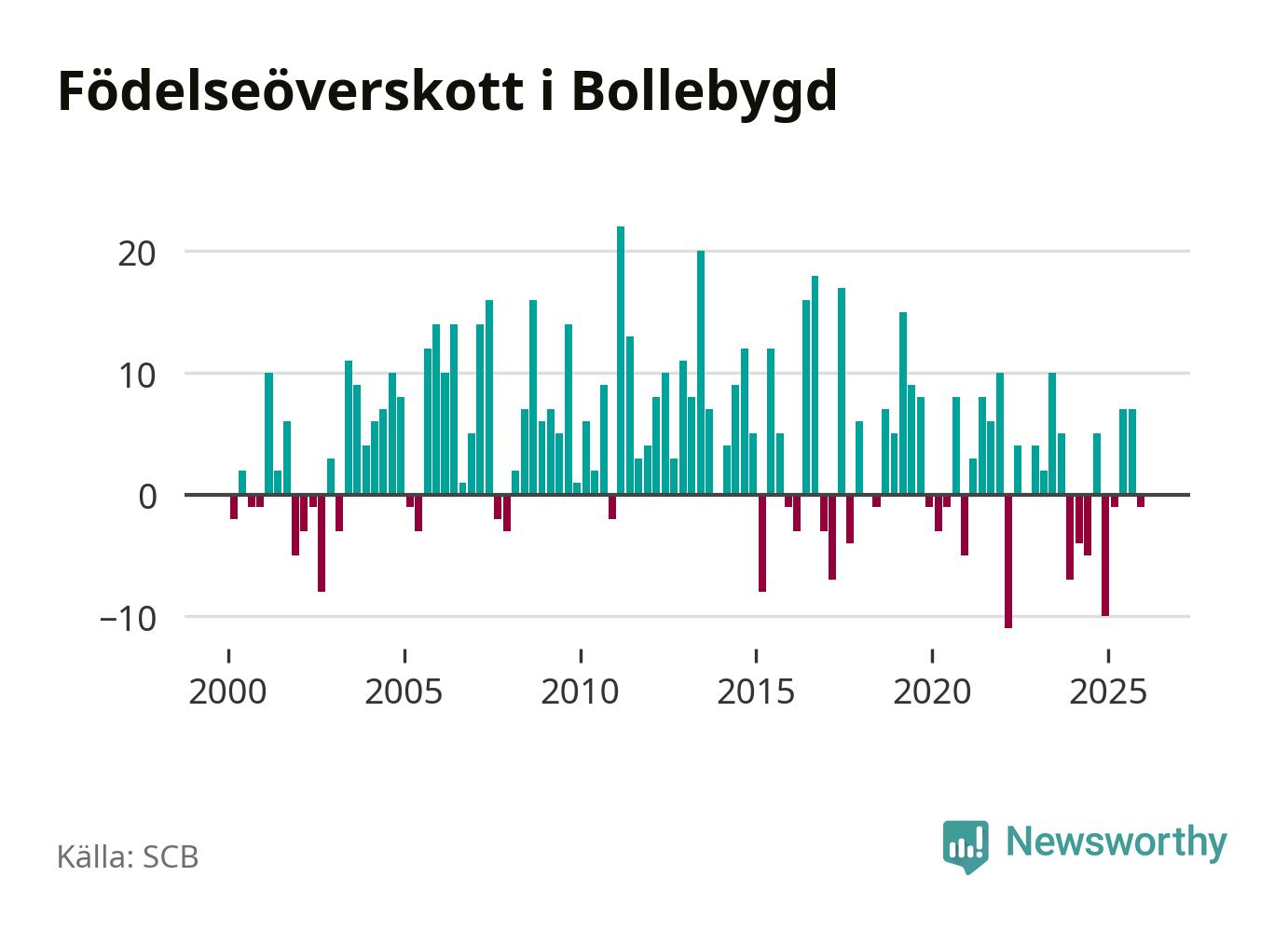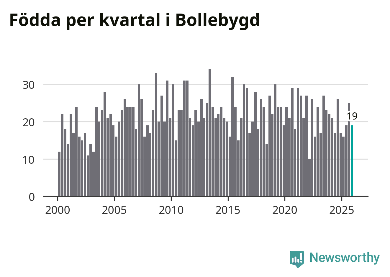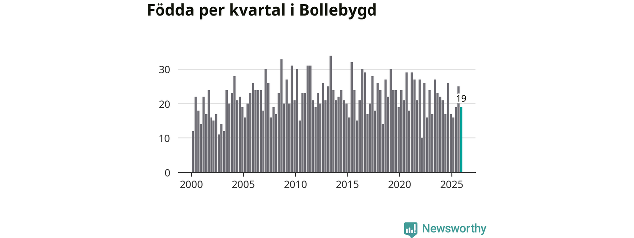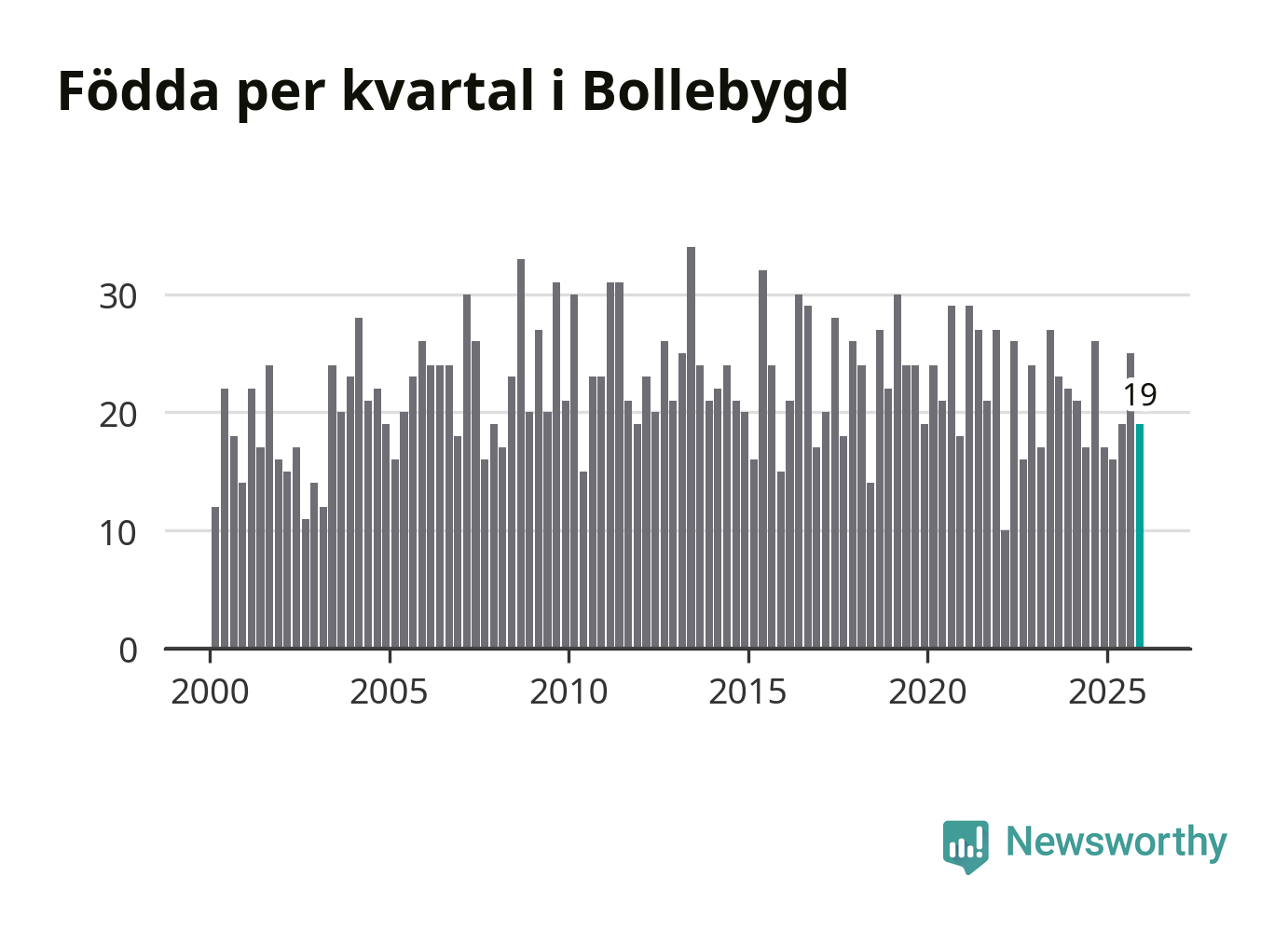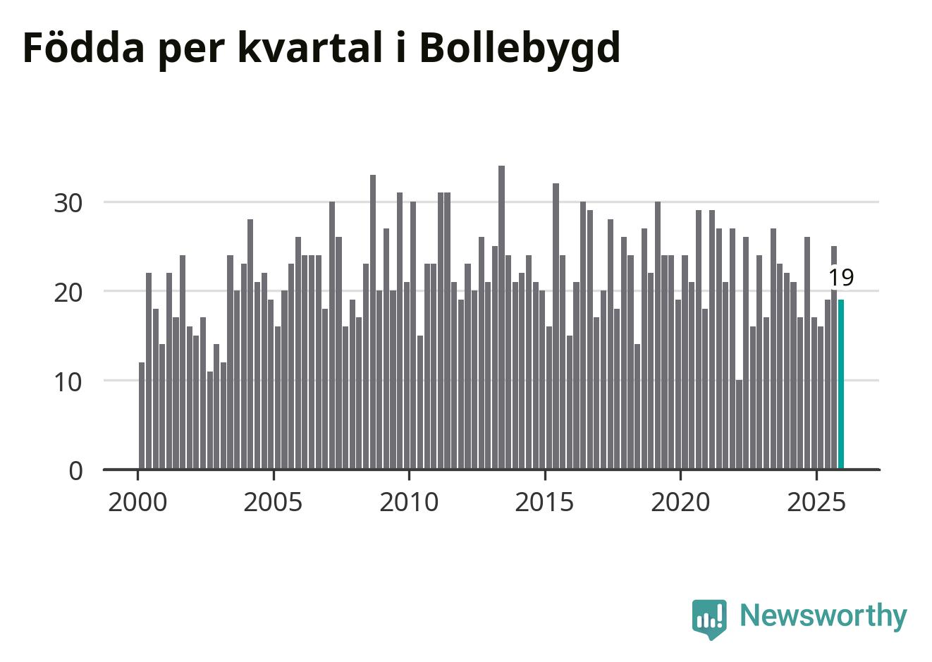 Enligt SCB:s siffror föddes 19 barn i Bollebygd under det senaste kvartalet. Samtidigt avled 20 personer. Skillnaden mellan antal födda och döda är så liten att det inte går att säga om det beror på något annat än SCB:s röjandeskydd. Kommunen har historiskt sett haft ungefär lika många kvartal med positivt födelsenetto som negativt.