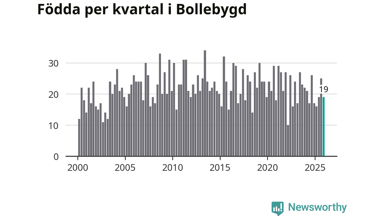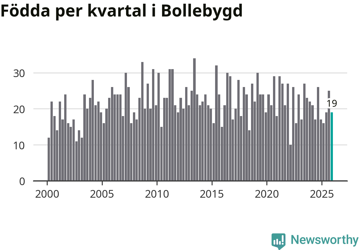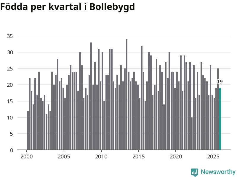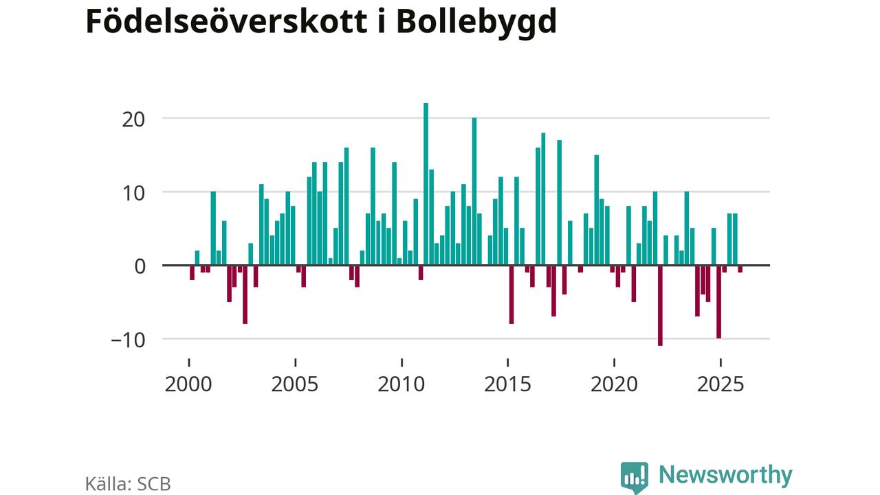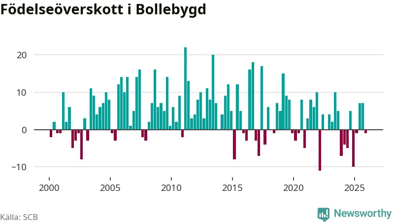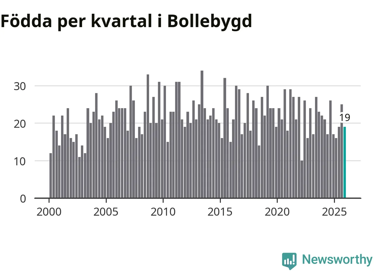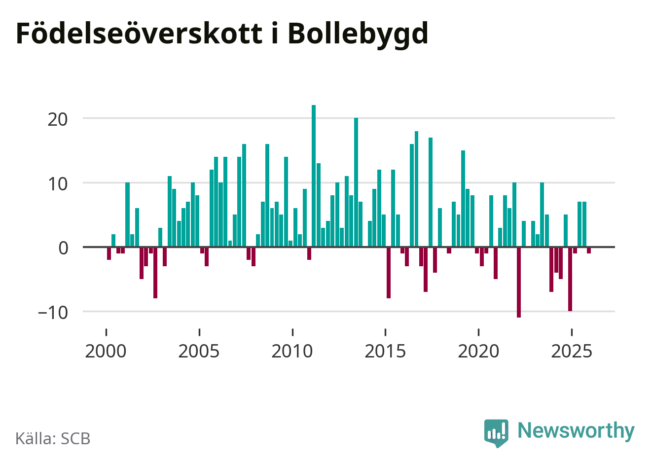 Enligt SCB:s siffror föddes 19 barn i Bollebygd under det senaste kvartalet. Samtidigt avled 20 personer. Skillnaden mellan antal födda och döda är så liten att det inte går att säga om det beror på något annat än SCB:s röjandeskydd. Kommunen har historiskt sett haft ungefär lika många kvartal med positivt födelsenetto som negativt.
