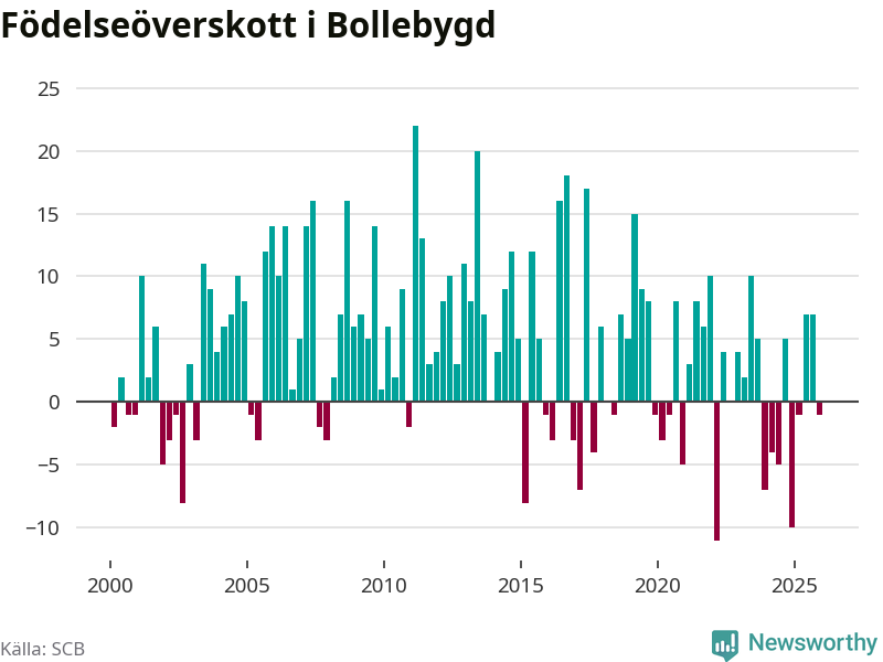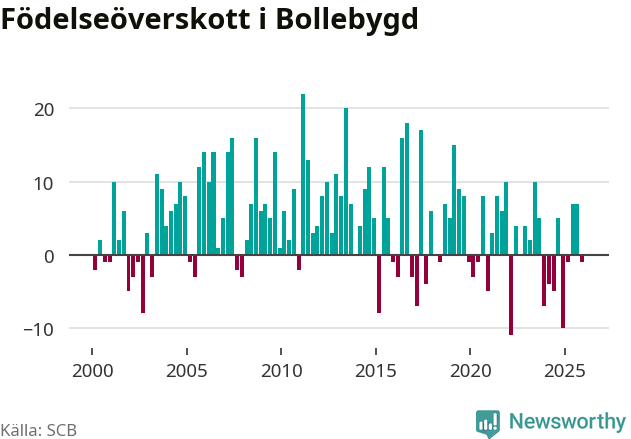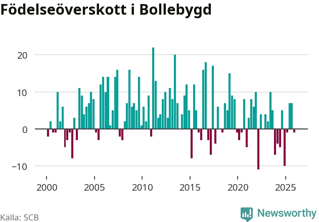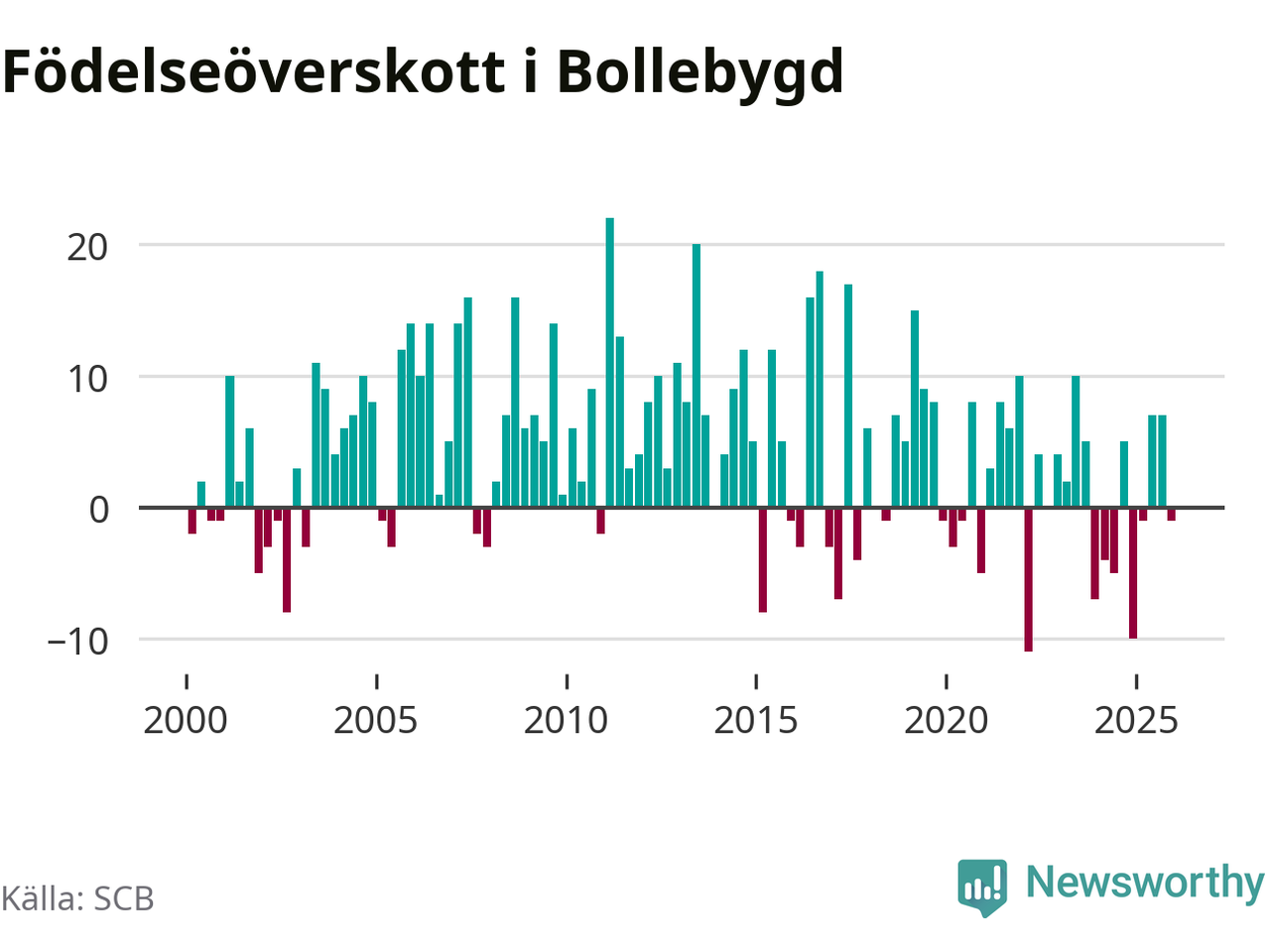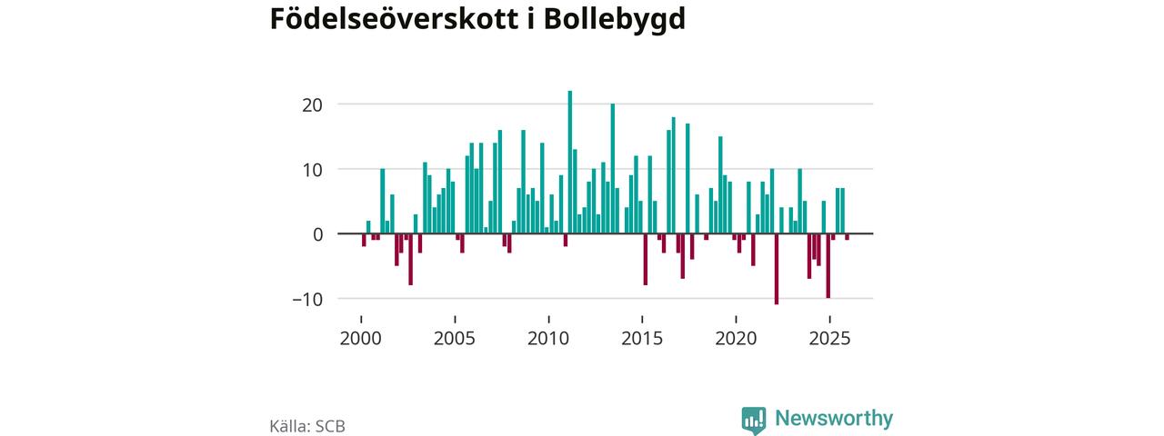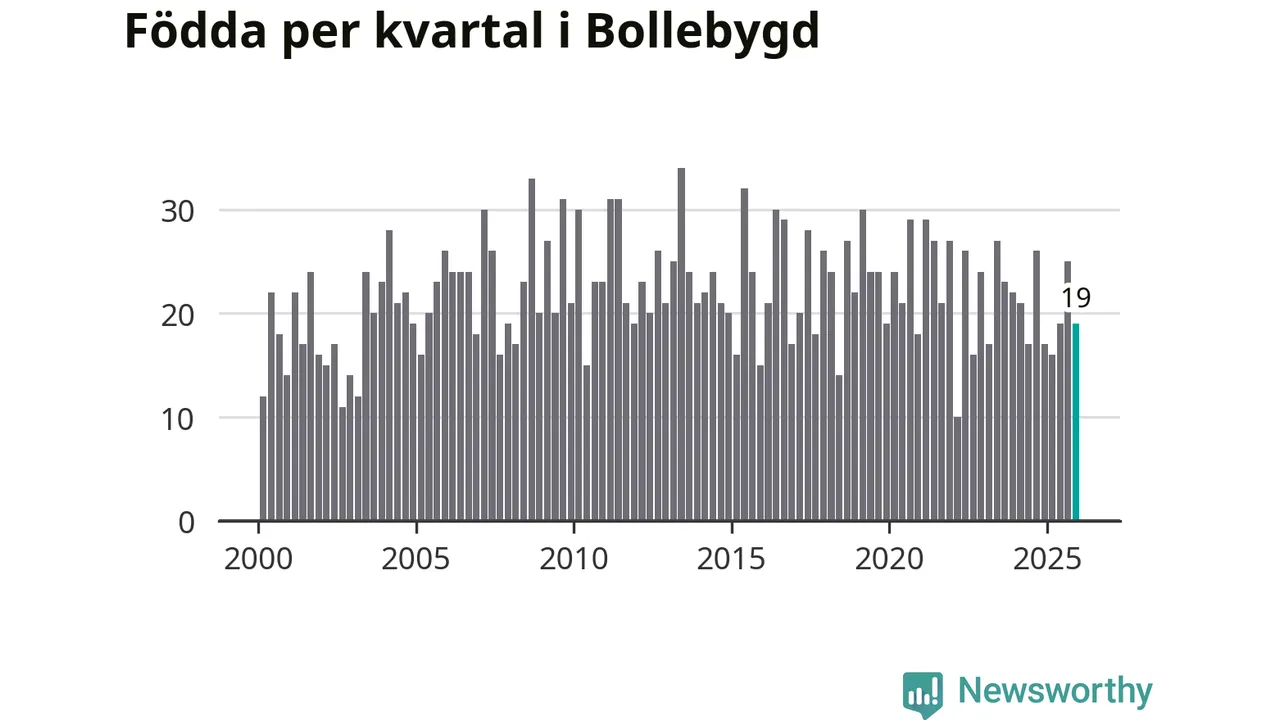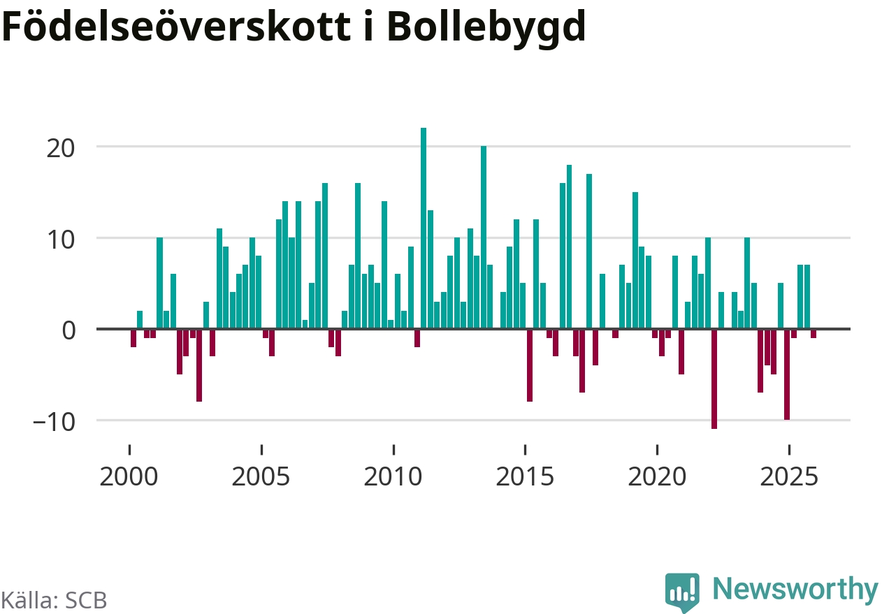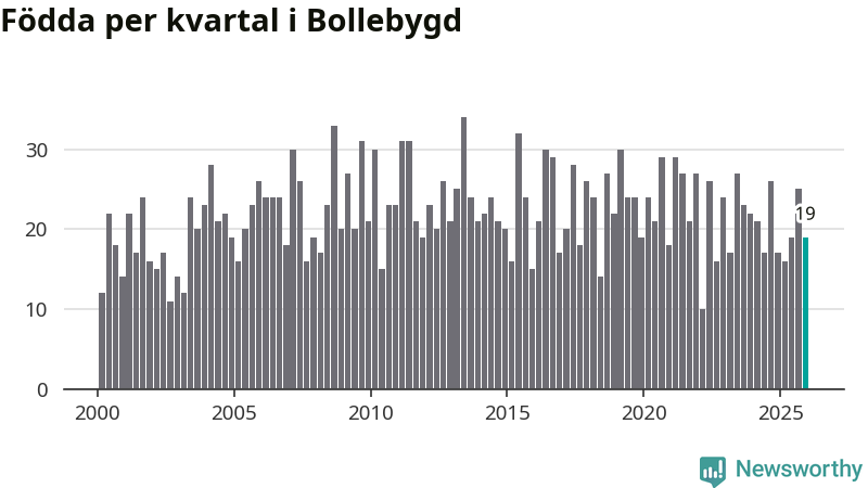 Enligt SCB:s siffror föddes 19 barn i Bollebygd under det senaste kvartalet. Samtidigt avled 20 personer. Skillnaden mellan antal födda och döda är så liten att det inte går att säga om det beror på något annat än SCB:s röjandeskydd. Kommunen har historiskt sett haft ungefär lika många kvartal med positivt födelsenetto som negativt.