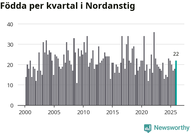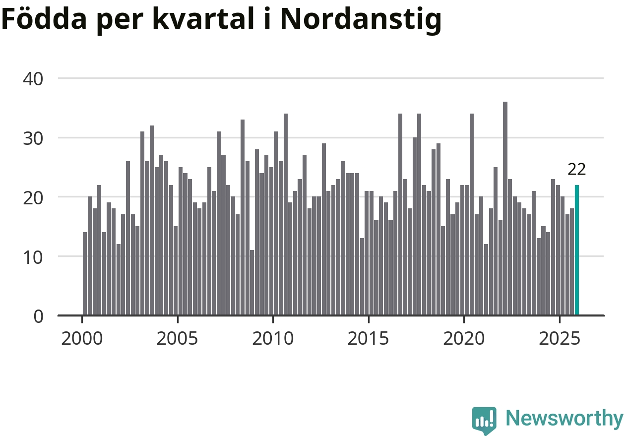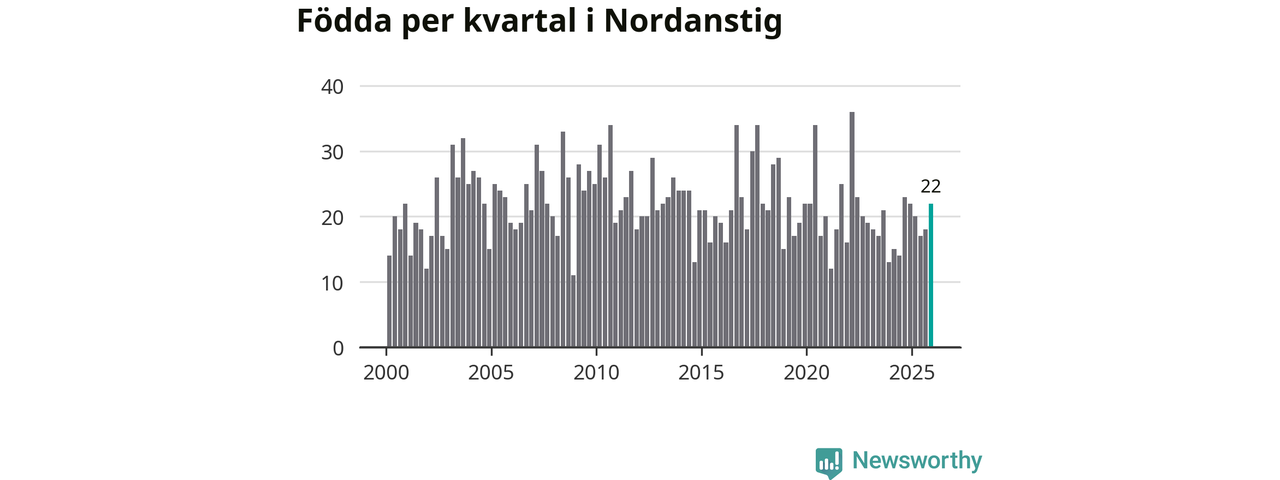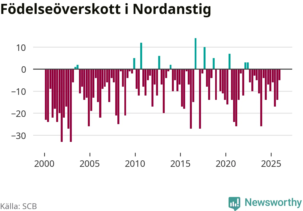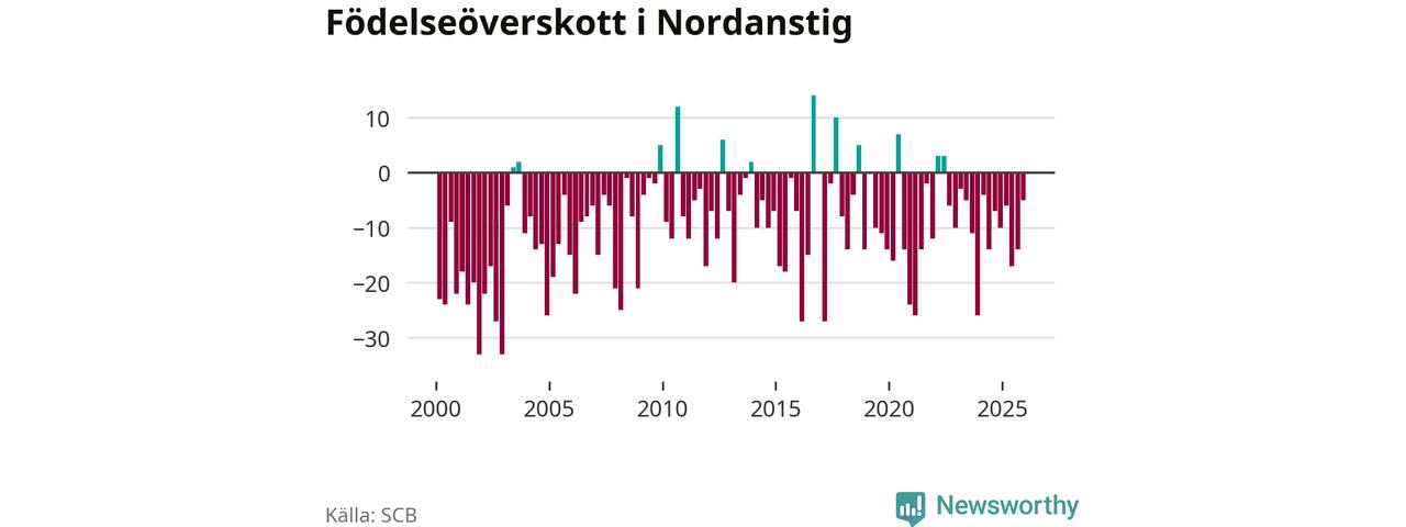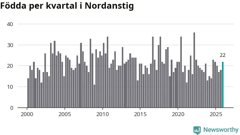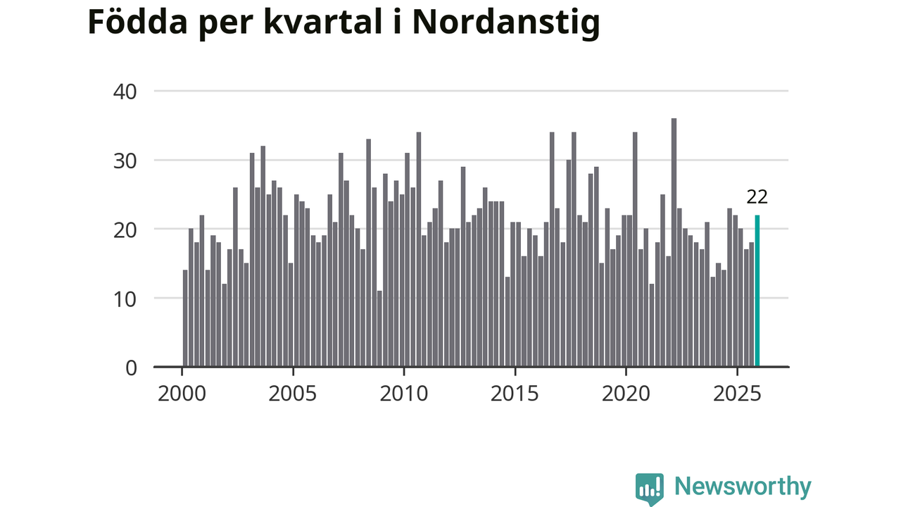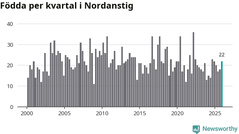 Enligt SCB:s siffror föddes 22 barn i Nordanstig under det senaste kvartalet. Samtidigt avled 27 personer. Skillnaden mellan antal födda och döda är så liten att det inte går att säga om det beror på något annat än SCB:s röjandeskydd. Kommunen har oftast haft negativt födelsenetto tidigare.