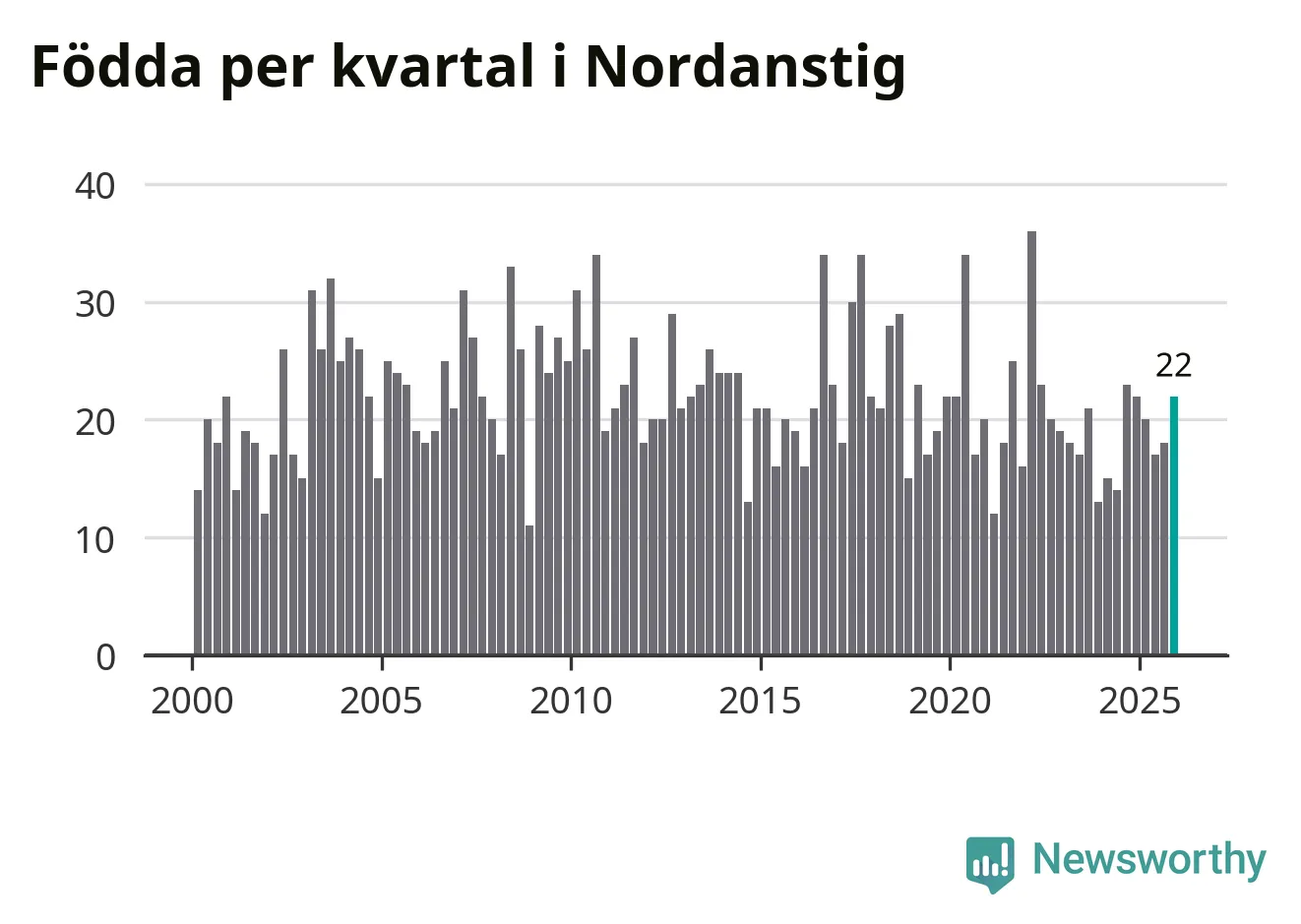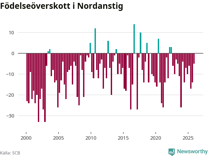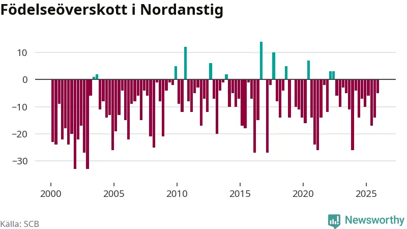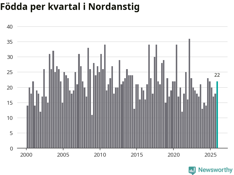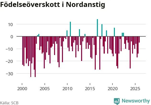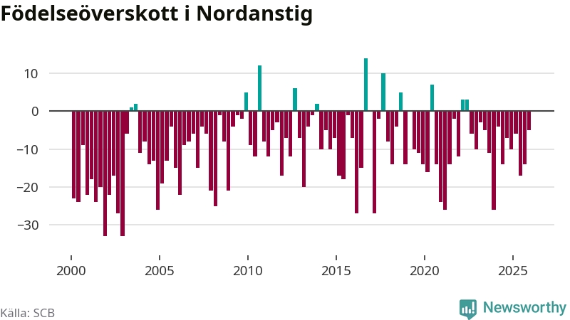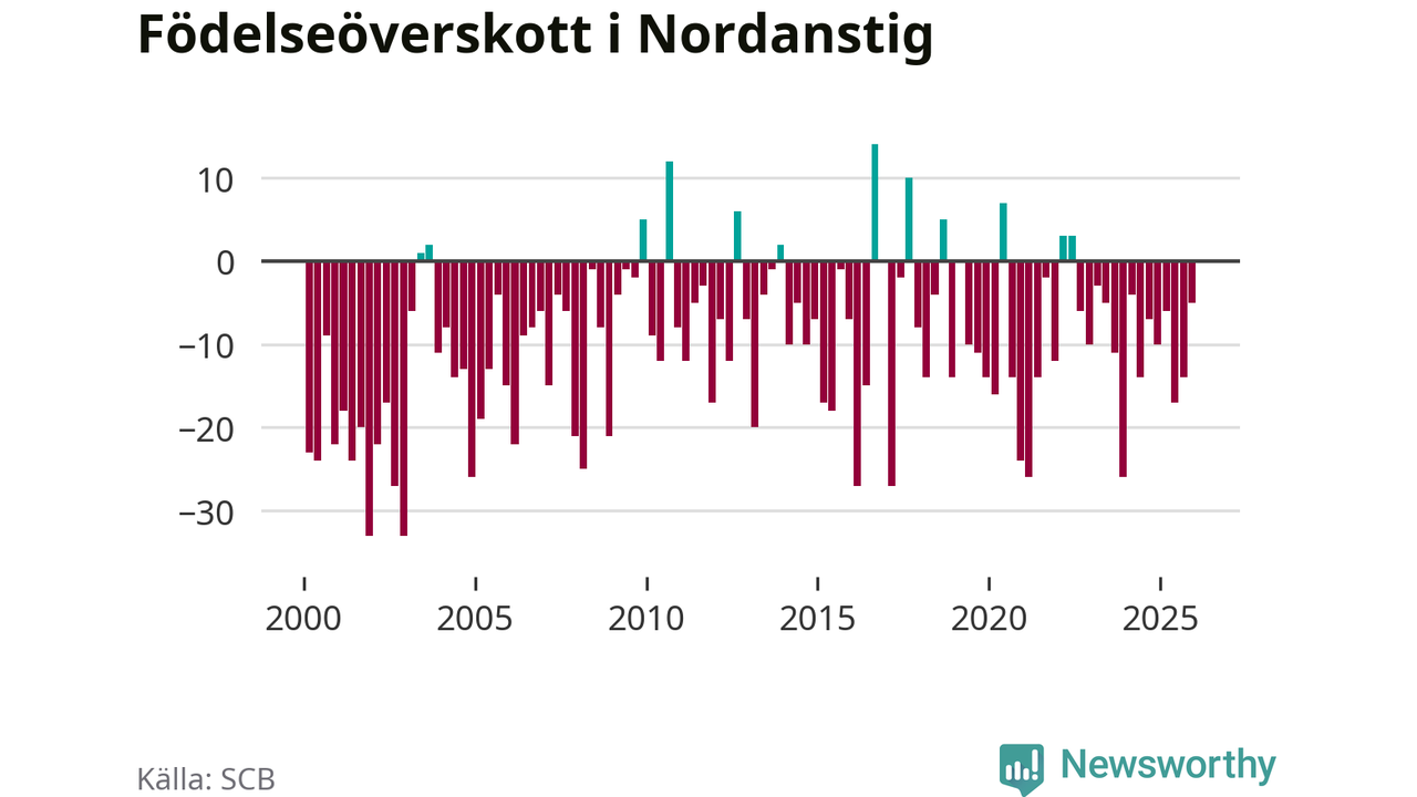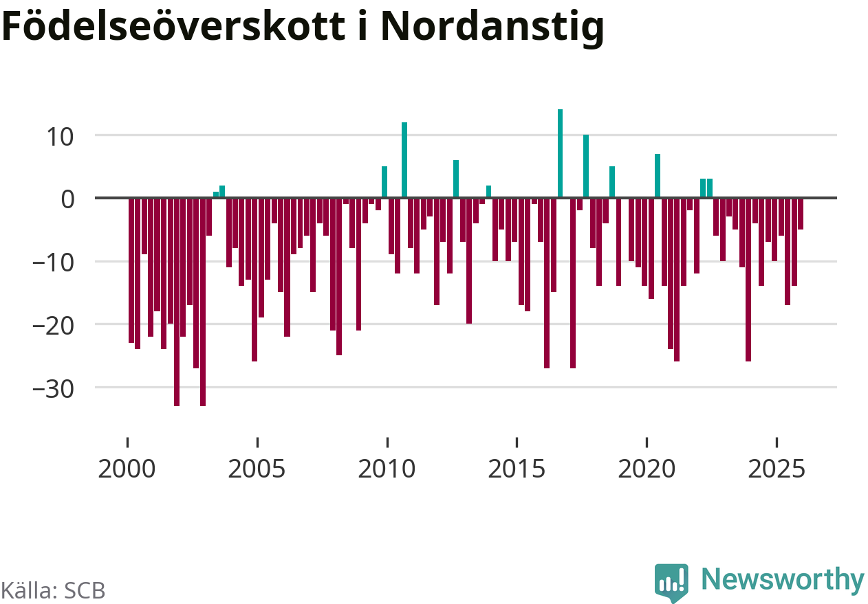 Enligt SCB:s siffror föddes 22 barn i Nordanstig under det senaste kvartalet. Samtidigt avled 27 personer. Skillnaden mellan antal födda och döda är så liten att det inte går att säga om det beror på något annat än SCB:s röjandeskydd. Kommunen har oftast haft negativt födelsenetto tidigare.