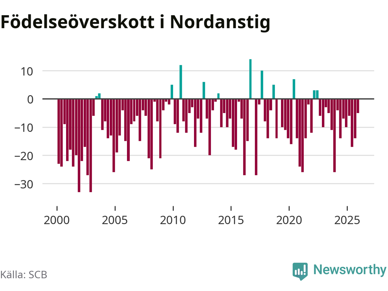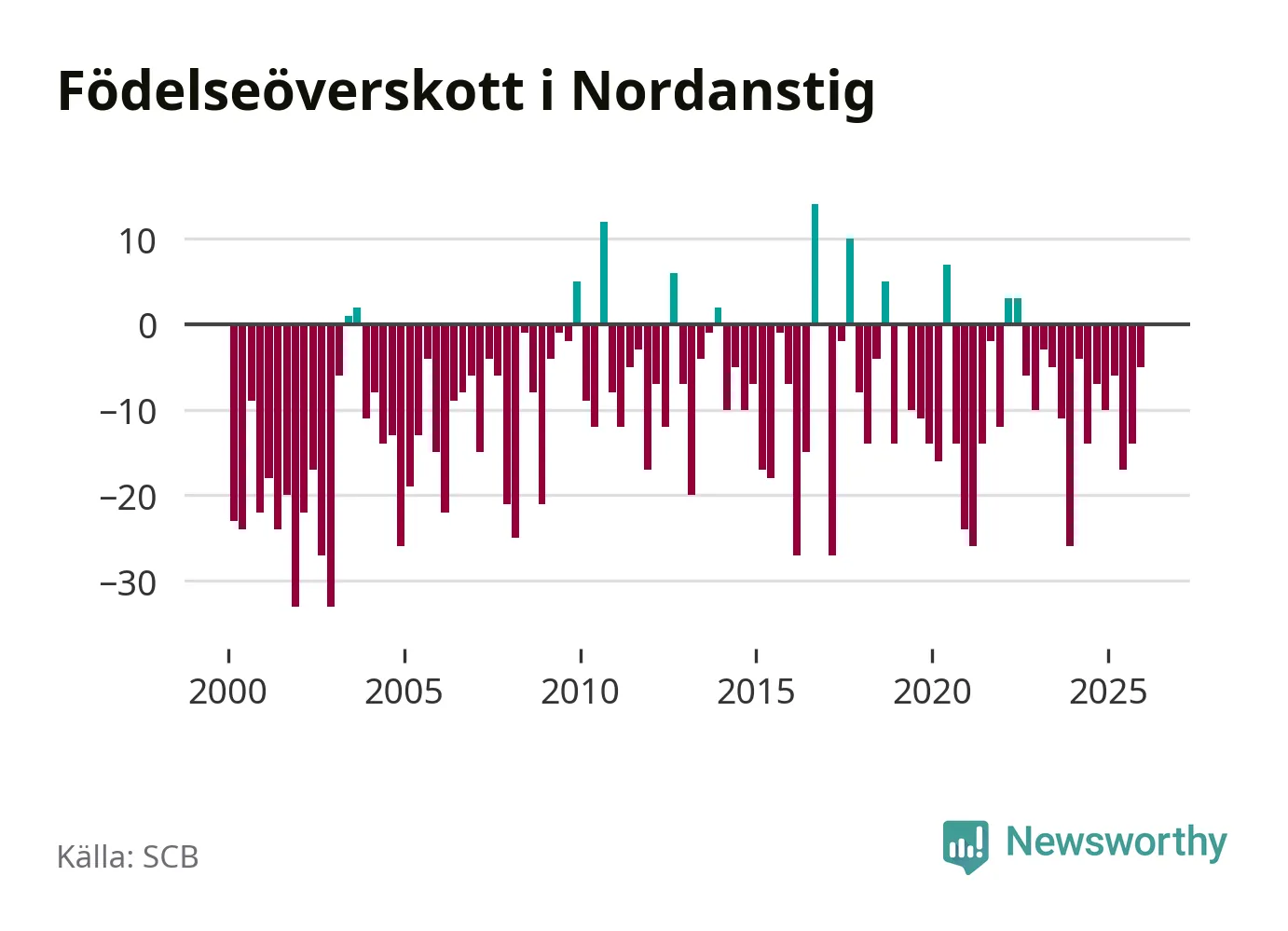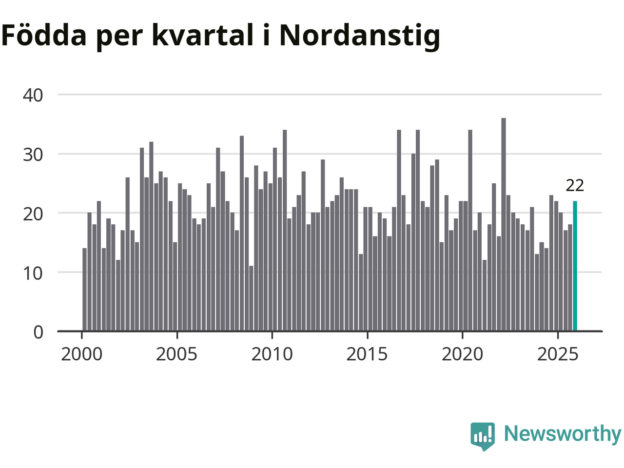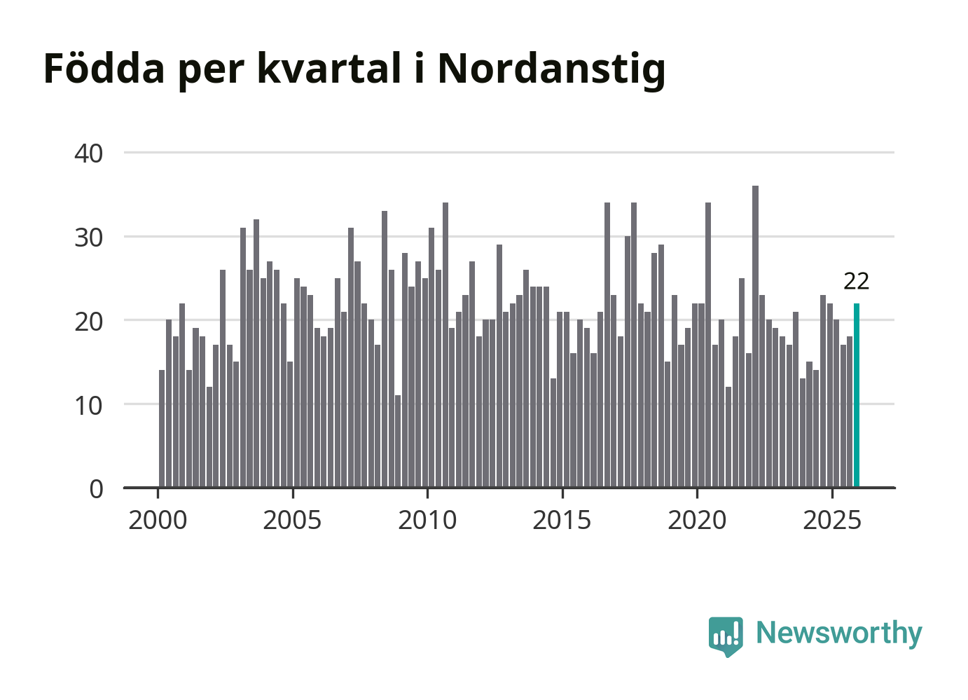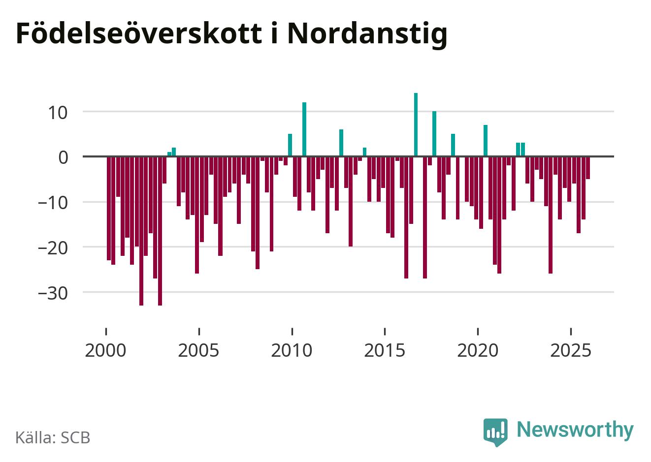 Enligt SCB:s siffror föddes 22 barn i Nordanstig under det senaste kvartalet. Samtidigt avled 27 personer. Skillnaden mellan antal födda och döda är så liten att det inte går att säga om det beror på något annat än SCB:s röjandeskydd. Kommunen har oftast haft negativt födelsenetto tidigare.